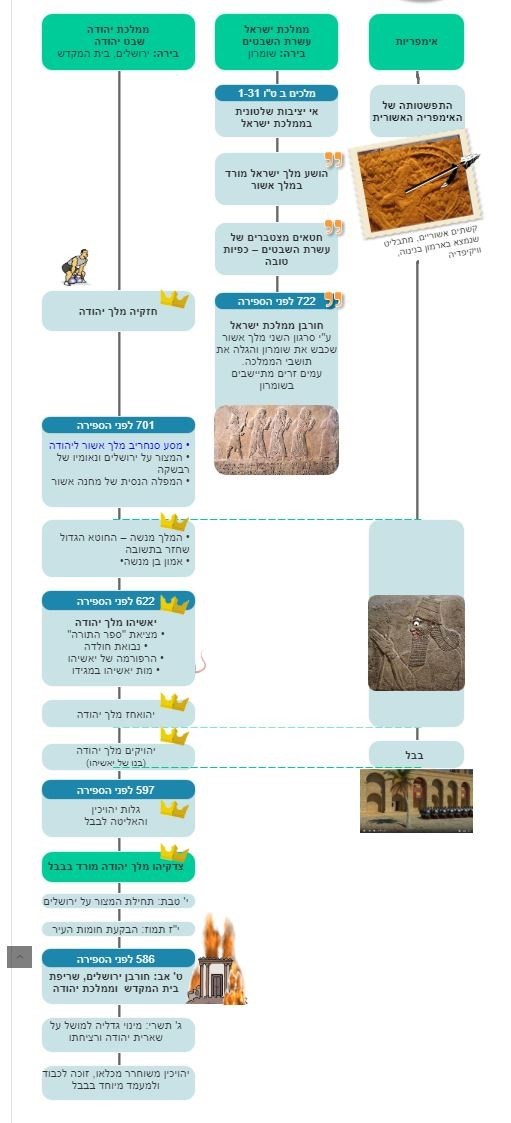 המורה יחלק לתלמידים קו זמן "אילם" כמסורטט להלן. התלמידים, בעזרת המורה, יסמנו על גבי הסרטוט את המושגים הבאים: "ממלכה מאוחדת"; "ממלכת יהודה"; "ממלכת ישראל"; כמו-כן ימקמו את האירועים החשובים על-פי תאריכיהם: 928 לפנה"ס - פילוג שבטי ישראל; 722 לפנה"ס - חורבן ממלכת ישראל על-ידי אשור וגלות עשרת השבטים.
