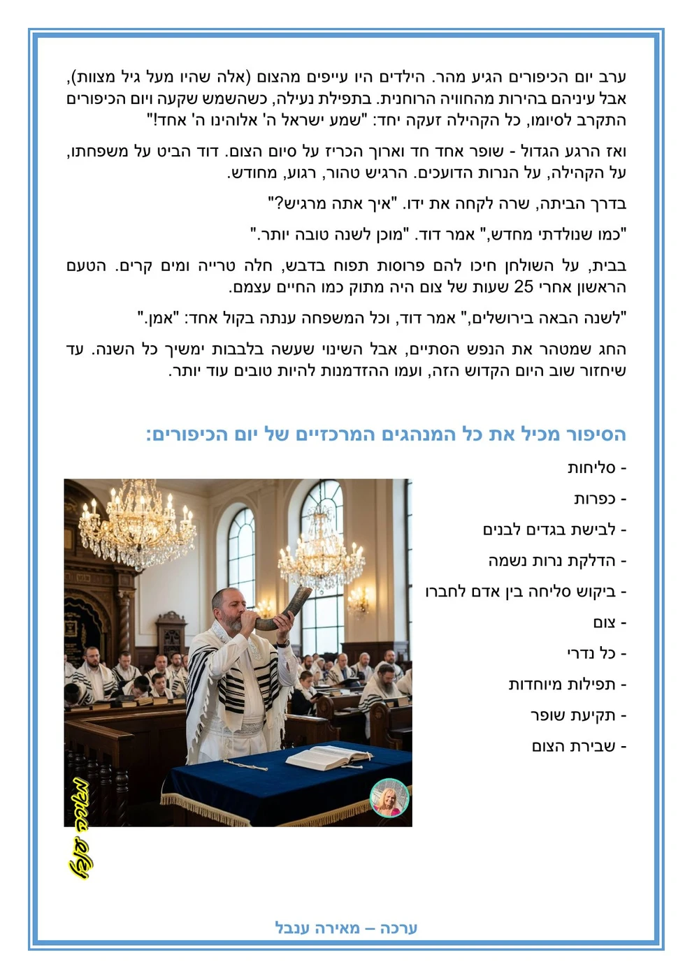 יום הכיפורים נפתח במעמד מפעים ומרגש, הוא המעמד הידוע בשם "כל נדרי" בו נעשת התרת הנדרים שנדר אדם לעצמו. עם שקיעת השמש מתאספים הכל בבית – הכנסת, עטופים בטליתות ובבגדי – לבן. נכבדי הקהל, והרב בראשם, מוציאים את ספרי התורה מארון הקודש ועומדים לצדי החזן, ובדומיית הקודש השרוייה בחלל בבית הכנסת בוקעים ועולים הצלילים הידועים של תפילת כל "כל נדרי", המרעידים את הלב. ליום הכיפורים יש ספר תפילות המכונה "מחזור לימים נוראים". ביום זה מתקיימת בקשת סליחה ומחילה על עבירות בין אדם לה' ובין אדם לאדם. יום זה קרוי בתורה " שבת שבתון " ולעם נאמר : " כי ביום זה יכפר עליכם לטהר אתכם מכל חטאותיכם לפני ה' תטהרו." (ויקרא טז' 30). ביום זה מתנזרים מכל מאכל משתה ומכל המענג את הנפש " ועיניתם את נפשותיכם" (ויקרא טז' 31 ). סמוך לשקיעת החמה ננעל היום במעמד חגיגי תפילת "נעילה" נועלת שערי בית המקדש ושערי שמים. תקיעת שופר מבשרת על סיום הצום. ביום הכיפורים בשנת 1973 פרצה מלחמה אשר נקראה על שם המועד – "מלחמת יום הכיפרוים", בעיצומם של תפילות וצום חדרו צבאות ערב חמושים מהגזרה הדרמית של הארץ צבאות מצרים, ומהגזרה הצפונית של הארץ צבא סוריה. המטרה היתה לכבוש את הארץ. חיילים רבים נאלצו להפסיק את התפילות ולחזור לבסיסים כדי להצטרף למלחמה. המלחמה הייתה קשה וארוכה חיילים רבים נפלו לנו חלל אך גברנו על צבאות ערב ומזימתם לא הצליחה. ימים נוראיםחודש אלול ויום הכיפורים הם לפי מסורת ישראל ימי רחמים וסליחות, תשובה ותפילה. הם נקראים "הימים הנוראים", כי בימים אלה נשפטים בני האדם על התנהגותם ומעשיהם לפני בית הדין שבשמים. מראש חודש אלול עד אחר יום הכפורים המה ימי רצון. ואף כי הקדוש ברוך - הוא מקבל תשובה מן השבים אליו בלב שלם, בימים אלה מובחרים יותר ומזומנים לתשובה. להיותם ימי רחמים ימי רצון. כי בראש חודש אלול עלה משה אל הר סיני לקבל את לוחות הברית, ונשתהה שם ארבעים יום, וירד בעשרה בתשרי, שהיה אז גמר יום כפרה, ומאז הוקדשו ימים אלו לימי רצון, והיום העשירי ליום הכיפורים. נוהגים לתקוע בשופר בחודש זה, מתחילת היום השני של ראש חודש בכל יום לאחר תפילת שחרית. מטרת התקיעה בשופר לעורר את העם לתשובה. כי כן הוא הטבע של השופר לעורר ולהחריד. ביום הכיפורים נוהגים לברך איש את רעהו : "לשנה טובה תכתבו ותחתמו", והכוונה היא להיכתב ולהחתם בספר החיים הטובים.