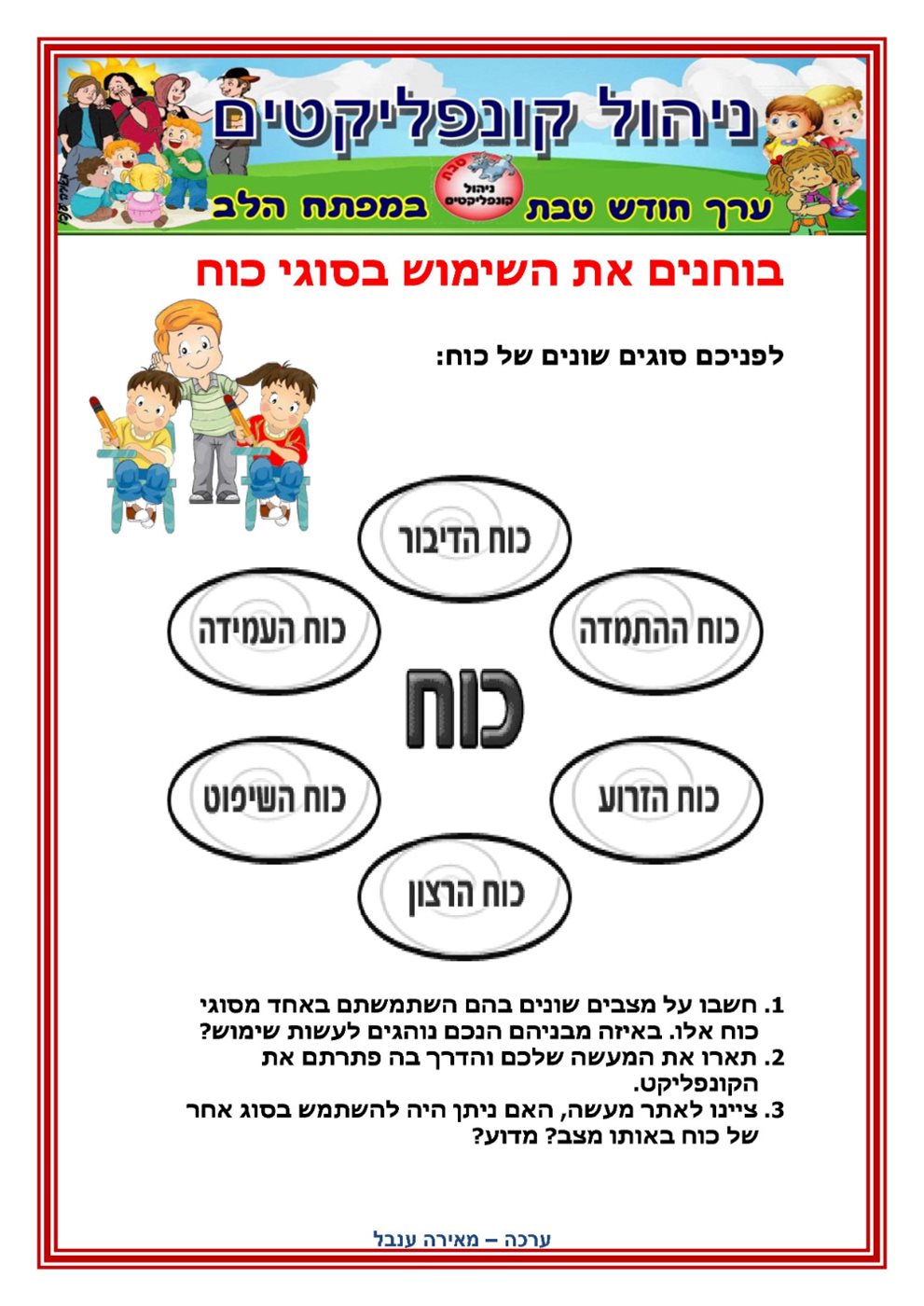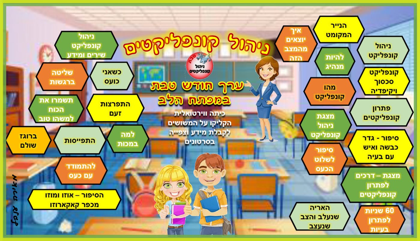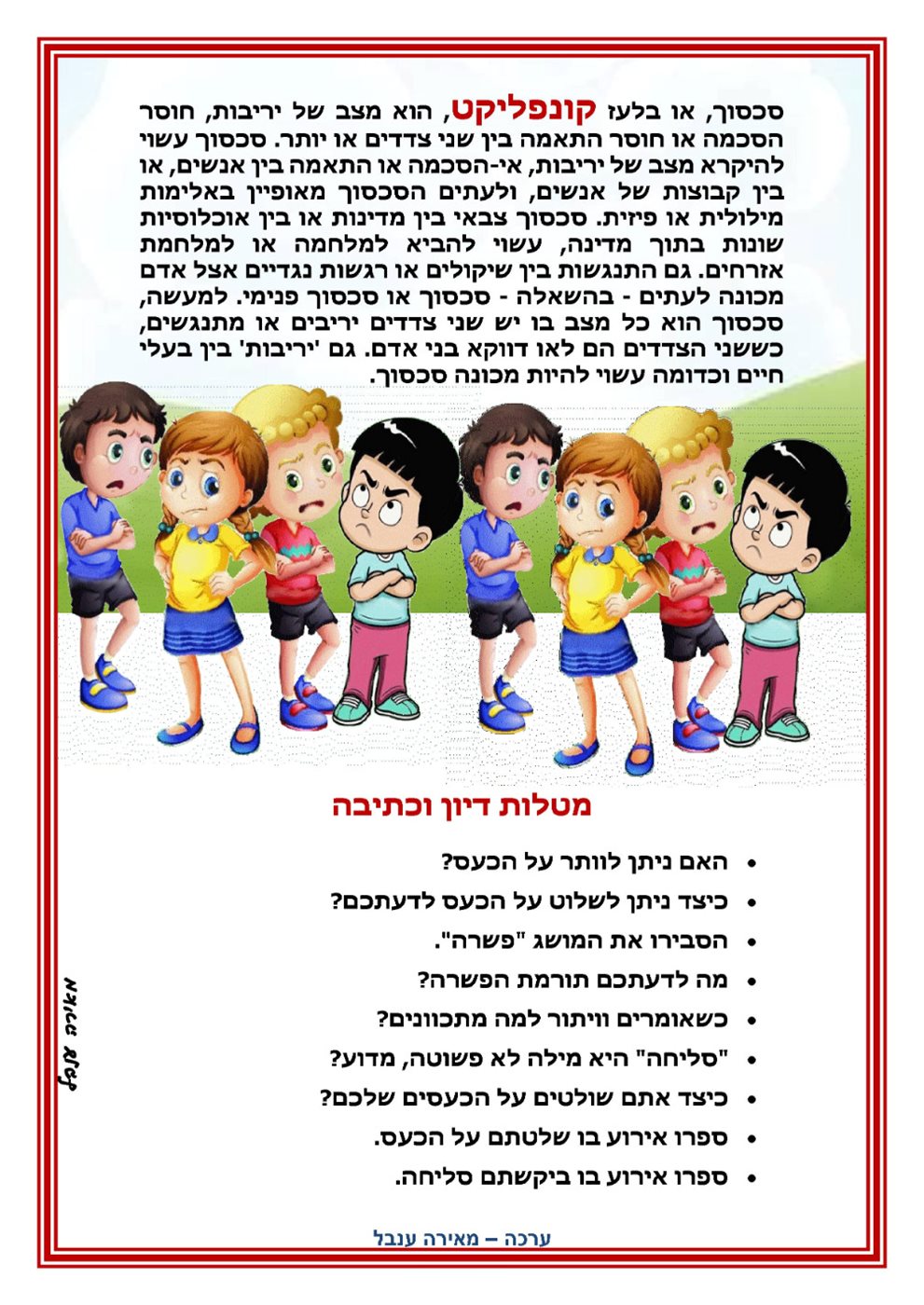 סכסוך, או בלעז קונפליקט, הוא מצב של יריבות, חוסר הסכמה או חוסר התאמה בין שני צדדים או יותר. סכסוך עשוי להיקרא מצב של יריבות, אי-הסכמה או התאמה בין אנשים, או בין קבוצות של אנשים, ולעתים הסכסוך מאופיין באלימות מילולית או פיזית. סכסוך צבאי בין מדינות או בין אוכלוסיות שונות בתוך מדינה, עשוי להביא למלחמה או למלחמת אזרחים. גם התנגשות בין שיקולים או רגשות נגדיים אצל אדם מכונה לעתים - בהשאלה - סכסוך או סכסוך פנימי. למעשה, סכסוך הוא כל מצב בו יש שני צדדים יריבים או מתנגשים, כששני הצדדים הם לאו דווקא בני אדם. גם 'יריבות' בין בעלי חיים וכדומה עשוי להיות מכונה סכסוך. למידע נוסף הקליקו כאן קונפליקט הינו התנגשות בין צדדים בעלי צרכים, אינטרסים, רגשות, דעות, אמונות ו/או ערכים שאינם מתיישבים אלו עם אלו. הקונפליקט מהווה תופעה אנושית טבעית והוא עשוי להתגלע במערכות היחסים שבין יחידים, קבוצות, חברות, ארגונים ומדינות. מקורות הקונפליקט עשויים להיות: צרכים (פיזיים, חברתיים ואחרים), ערכים (אמונות, העדפות ותפיסות עולם מנוגדות/סותרות), משאבים ועוד. קיימות גישות שונות ביחסה של החברה לקונפליקט. האסכולות המסורתיות דוגלות במניעת קונפליקטים בכל מחיר כיוון שלשיטתן הם מזיקים למערכות היחסים בחברה. האסכולות של "יחסי האנוש" מתייחסות אל הקונפליקט כאל תופעה בלתי נמנעת שאינה מזיקה כל עוד יילמדו הדרכים לתעל את הקונפליקט לטובת החברה ולקידומה. אסכולות הקונפליקט המאוחרות יותר טוענות כי הקונפליקטים עשויים לשמש מנוף לצמיחה ולהעצמה ומשום כך יש לעודד אותם. מכל מקום, גישות אלה ואחרות מחדדות את הצורך בגיבוש דרכי פעולה והסכמות שיסייעו ליחיד ולקבוצה לנהל את מצבי הקונפליקט בדרך יעילה המקדמת את מטרותיהם והתורמת ליחסים ביניהם. דרכים אפשריות לניהול הקונפליקטים בדרך מקדמת עשויות להתגבש בעקבות שיח המברר את אחריותם של השותפים "לשמור את הכוח למשהו טוב" ולהימנע מפגיעה. כתה ווירטואלית הקליקו על המשושים לכניסה לתכנים https://drive.google.com/file/d/1mP5KoWYCtQ7CXE2hy38Snfr1PYOadtex/view?usp=sharing קישורים לאתרים