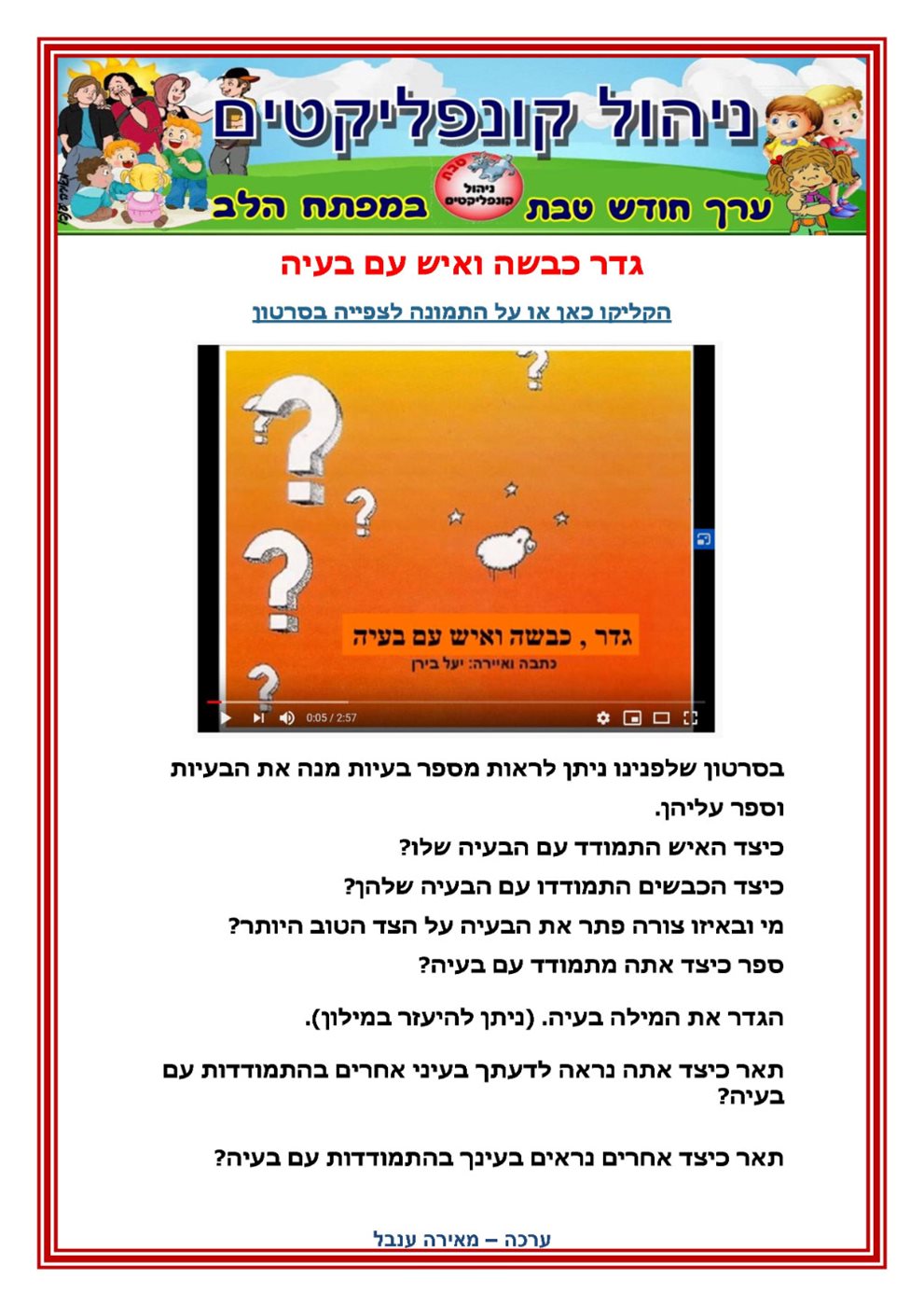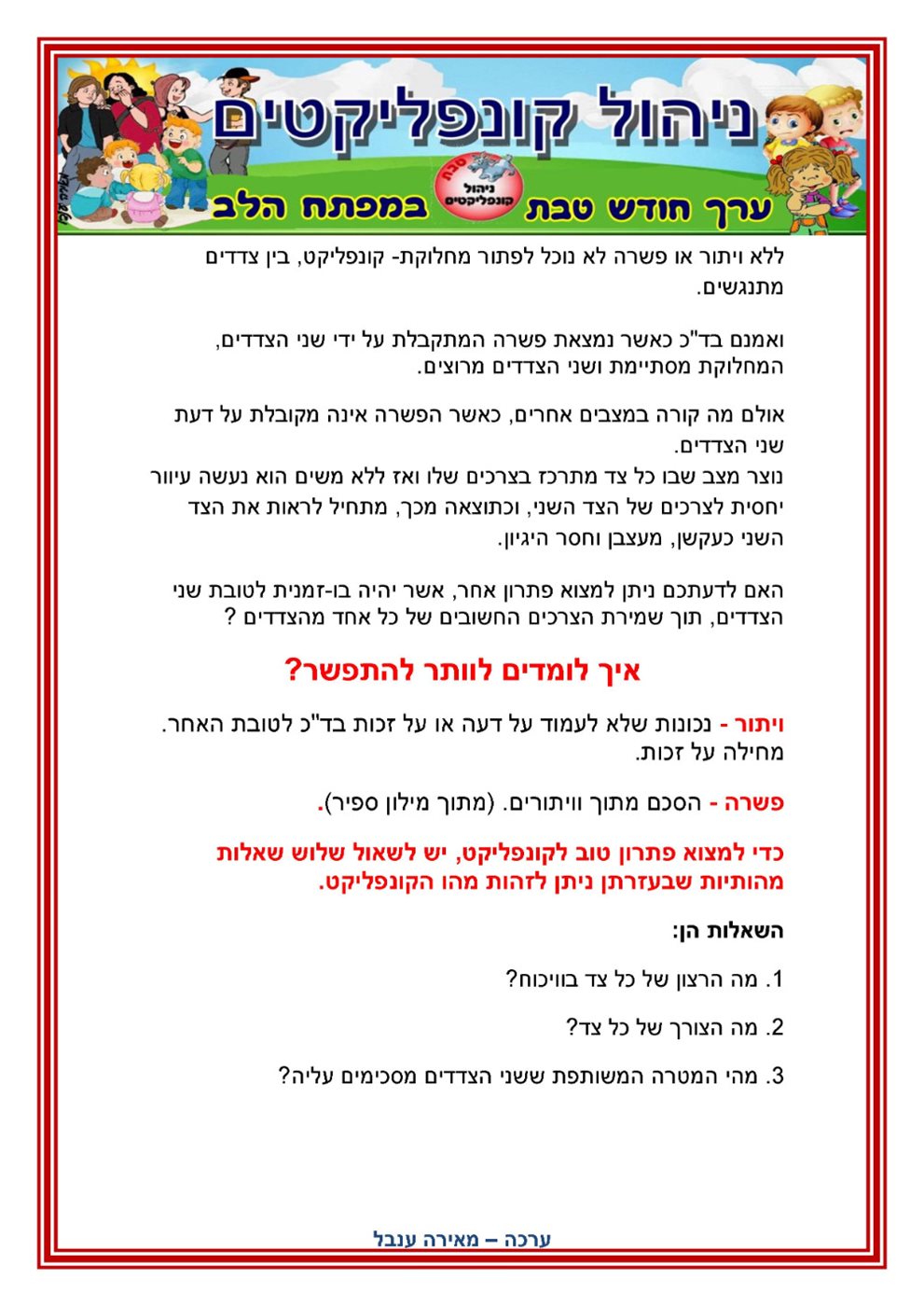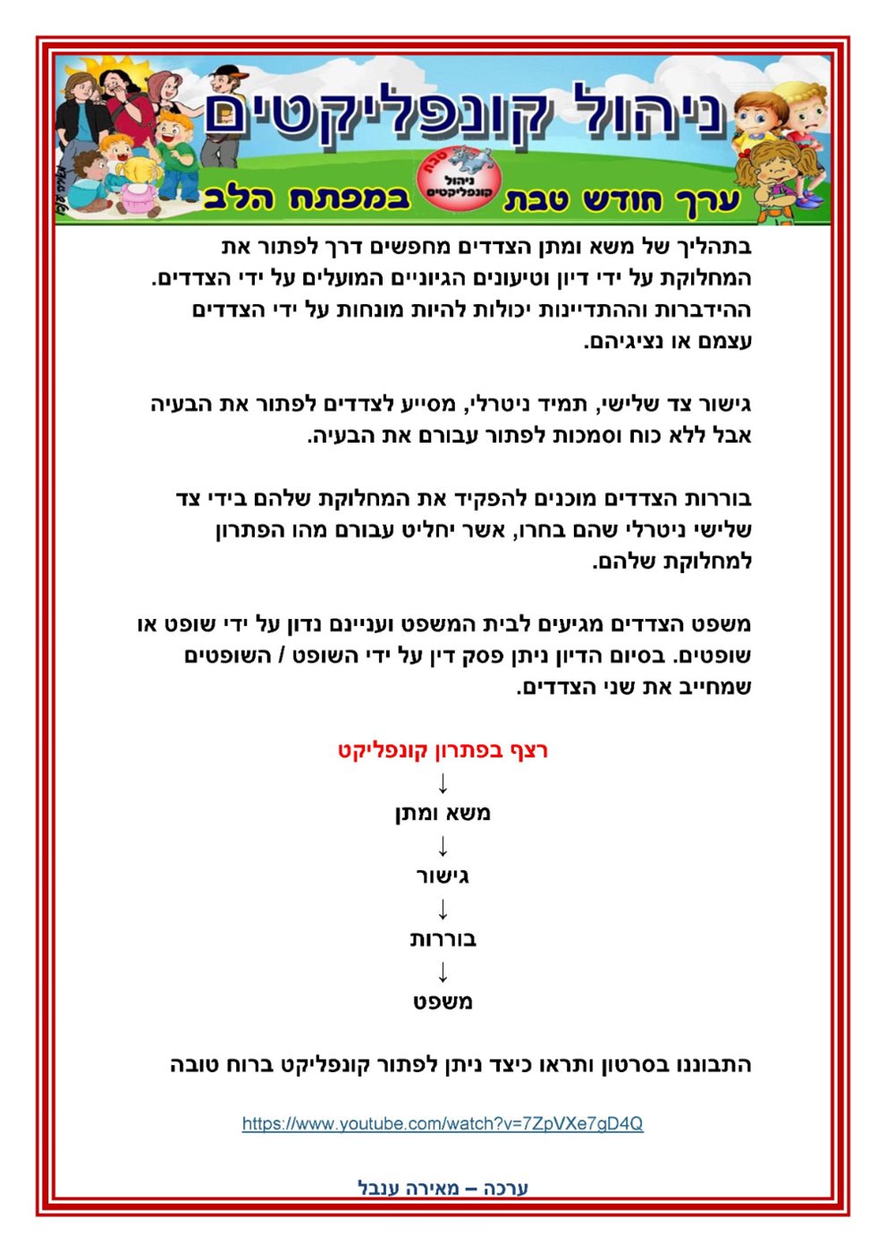 סכסוך, או בלעז קונפליקט, הוא מצב של יריבות, חוסר הסכמה או חוסר התאמה בין שני צדדים או יותר. סכסוך עשוי להיקרא מצב של יריבות, אי-הסכמה או התאמה בין אנשים, או בין קבוצות של אנשים, ולעתים הסכסוך מאופיין באלימות מילולית או פיזית. סכסוך צבאי בין מדינות או בין אוכלוסיות שונות בתוך מדינה, עשוי להביא למלחמה או למלחמת אזרחים. גם התנגשות בין שיקולים או רגשות נגדיים אצל אדם מכונה לעתים - בהשאלה - סכסוך או סכסוך פנימי. למעשה, סכסוך הוא כל מצב בו יש שני צדדים יריבים או מתנגשים, כששני הצדדים הם לאו דווקא בני אדם. גם 'יריבות' בין בעלי חיים וכדומה עשוי להיות מכונה סכסוך. למידע נוסף הקליקו כאן קונפליקט הינו התנגשות בין צדדים בעלי צרכים, אינטרסים, רגשות, דעות, אמונות ו/או ערכים שאינם מתיישבים אלו עם אלו. הקונפליקט מהווה תופעה אנושית טבעית והוא עשוי להתגלע במערכות היחסים שבין יחידים, קבוצות, חברות, ארגונים ומדינות. מקורות הקונפליקט עשויים להיות: צרכים (פיזיים, חברתיים ואחרים), ערכים (אמונות, העדפות ותפיסות עולם מנוגדות/סותרות), משאבים ועוד. קיימות גישות שונות ביחסה של החברה לקונפליקט. האסכולות המסורתיות דוגלות במניעת קונפליקטים בכל מחיר כיוון שלשיטתן הם מזיקים למערכות היחסים בחברה. האסכולות של "יחסי האנוש" מתייחסות אל הקונפליקט כאל תופעה בלתי נמנעת שאינה מזיקה כל עוד יילמדו הדרכים לתעל את הקונפליקט לטובת החברה ולקידומה. אסכולות הקונפליקט המאוחרות יותר טוענות כי הקונפליקטים עשויים לשמש מנוף לצמיחה ולהעצמה ומשום כך יש לעודד אותם. מכל מקום, גישות אלה ואחרות מחדדות את הצורך בגיבוש דרכי פעולה והסכמות שיסייעו ליחיד ולקבוצה לנהל את מצבי הקונפליקט בדרך יעילה המקדמת את מטרותיהם והתורמת ליחסים ביניהם. דרכים אפשריות לניהול הקונפליקטים בדרך מקדמת עשויות להתגבש בעקבות שיח המברר את אחריותם של השותפים "לשמור את הכוח למשהו טוב" ולהימנע מפגיעה. כתה ווירטואלית הקליקו על המשושים לכניסה לתכנים https://drive.google.com/file/d/1mP5KoWYCtQ7CXE2hy38Snfr1PYOadtex/view?usp=sharing קישורים לאתרים