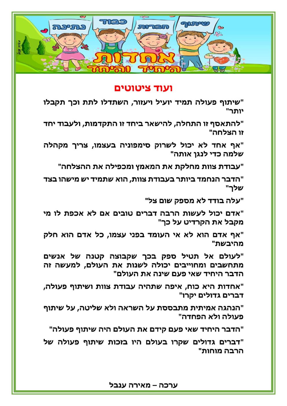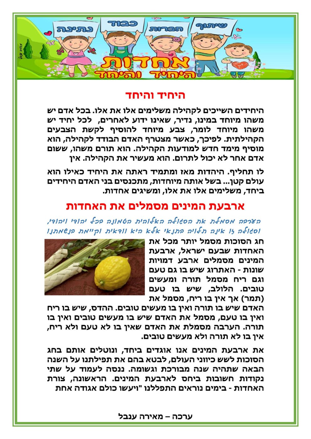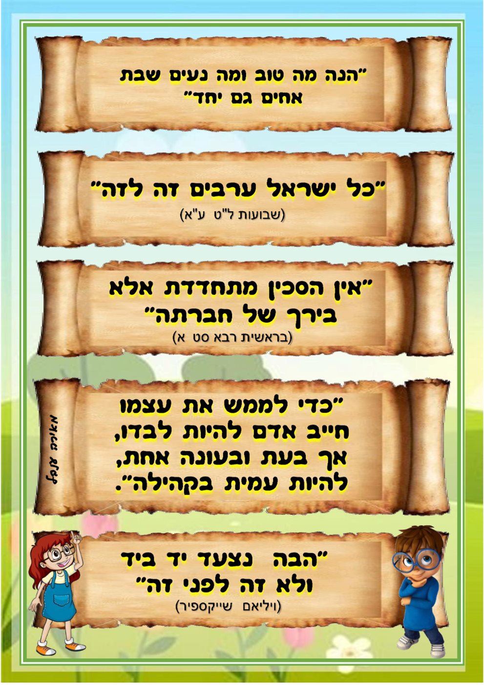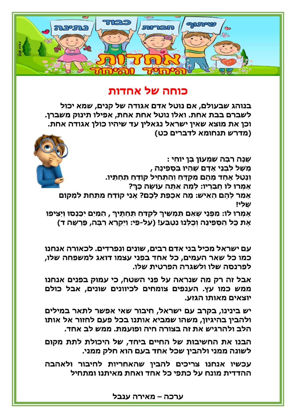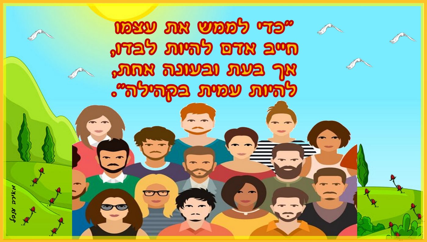 עם ישראל מכיל בני אדם רבים, שונים ונפרדים. לכאורה אנחנו כמו כל שאר העמים, כל אחד בפני עצמו דואג למשפחה שלו, לפרנסה שלו ולשגרה הפרטית שלו. אבל זה רק מה שנראה על פני השטח, כי עמוק בפנים אנחנו ממש כמו עץ. הענפים צומחים לכיוונים שונים, אבל כולם יוצאים מאותו הגזע. יש בינינו, בקרב עם ישראל, חיבור שאי אפשר לתאר במילים ולהבין בהיגיון, משהו שמביא אותנו בכל פעם לחזור אל אותו הלב ולהרגיש את זה בצורה חיה ופועמת. ממש לב אחד. הבנו את החשיבות של החיים ביחד, של היכולת לתת מקום לשונה ממני ולהבין שכל אחד בעם הוא חלק ממני. עכשיו אנחנו צריכים להבין שהאחריות לחיבור ולאהבה ההדדית מונח על כתפי כל אחד ואחת מאיתנו ומתחיל