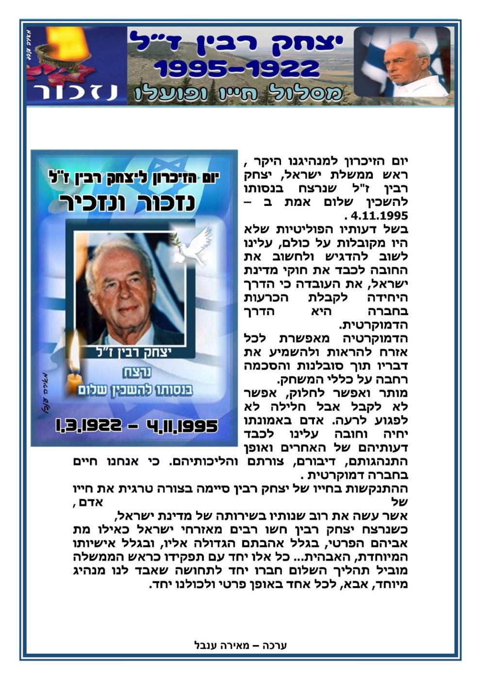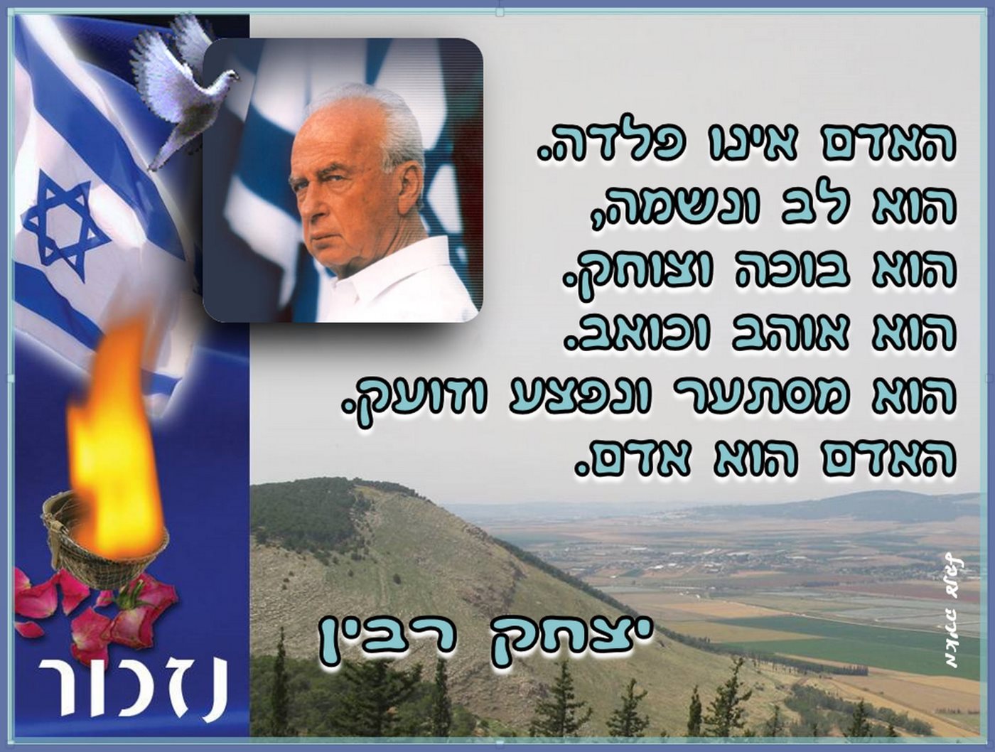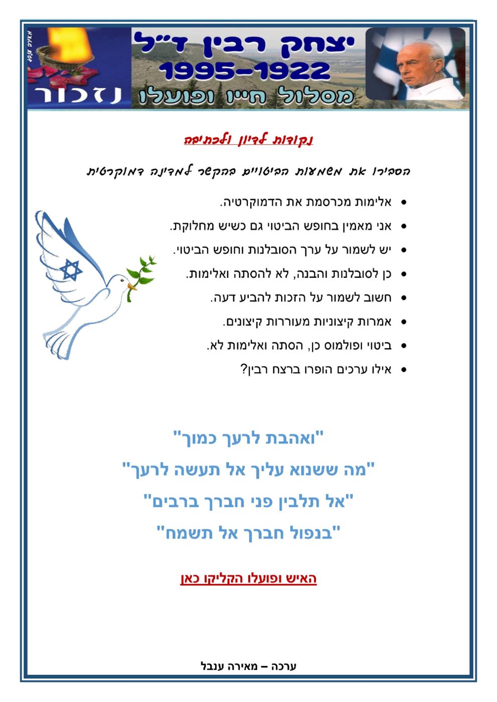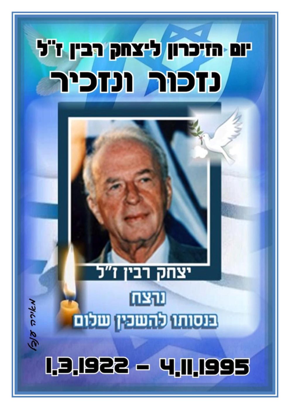 ![]() | ![]() יום הזיכרון למנהיגנו היקר , ראש ממשלת ישראל, יצחק רבין ז"ל שנרצח בנסותו להשכין שלום אמת ב – 4.11.1995 . בשל דעותיו הפוליטיות שלא היו מקובלות על כולם, עלינו לשוב להדגיש ולחשוב את החובה לכבד את חוקי מדינת ישראל, את העובדה כי הדרך היחידה לקבלת הכרעות בחברה היא הדרך הדמוקרטית. הדמוקרטיה מאפשרת לכל אזרח להראות ולהשמיע את דבריו תוך סובלנות והסכמה רחבה על כללי המשחק. מותר ואפשר לחלוק, אפשר לא לקבל אבל חלילה לא לפגוע לרעה. אדם באמונתו יחיה וחובה עלינו לכבד דעותיהם של האחרים ואופן התנהגותם, דיבורם, צורתם והליכותיהם. כי אנחנו חיים בחברה דמוקרטית . ההתנקשות בחייו של יצחק רבין סיימה בצורה טרגית את חייו של אדם, כשנרצח יצחק רבין חשו רבים מאזרחי ישראל כאילו מת אביהם הפרטי, בגלל אהבתם הגדולה אליו, ובגלל אישיותו המיוחדת, האבהית... כל אלו יחד עם תפקידו כראש הממשלה מוביל תהליך השלום חברו יחד לתחושה שאבד לנו מנהיג מיוחד, אבא, לכל אחד באופן פרטי ולכולנו יחד.