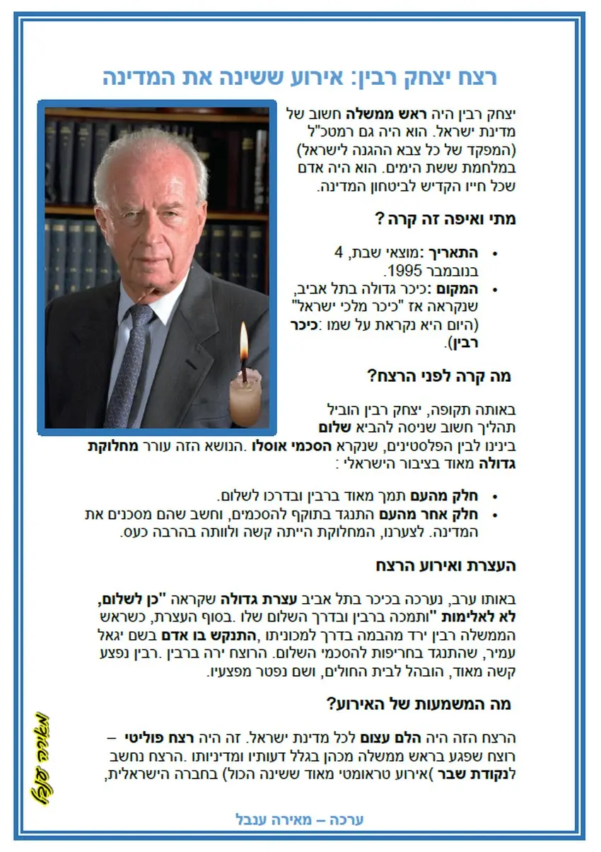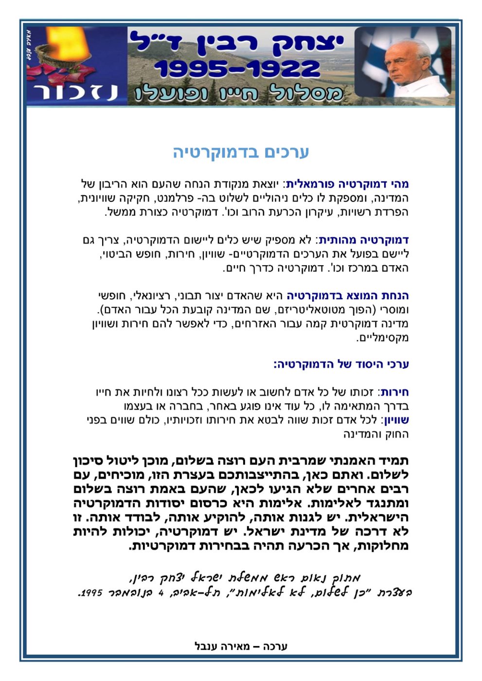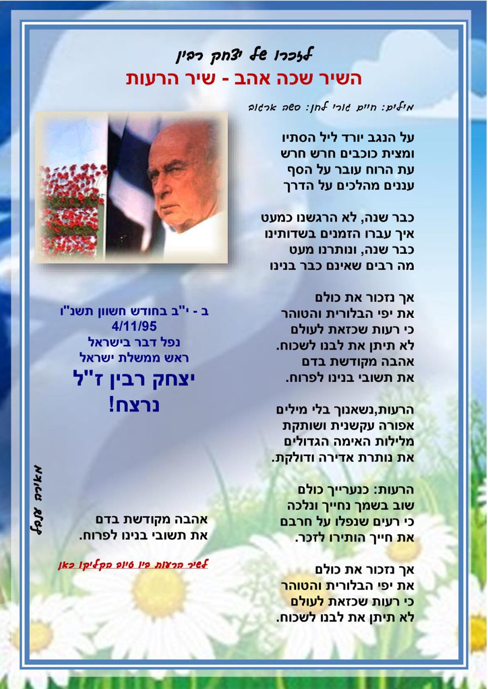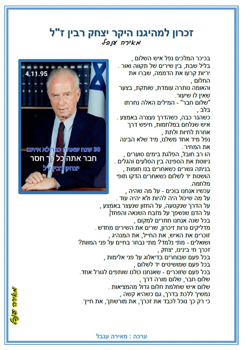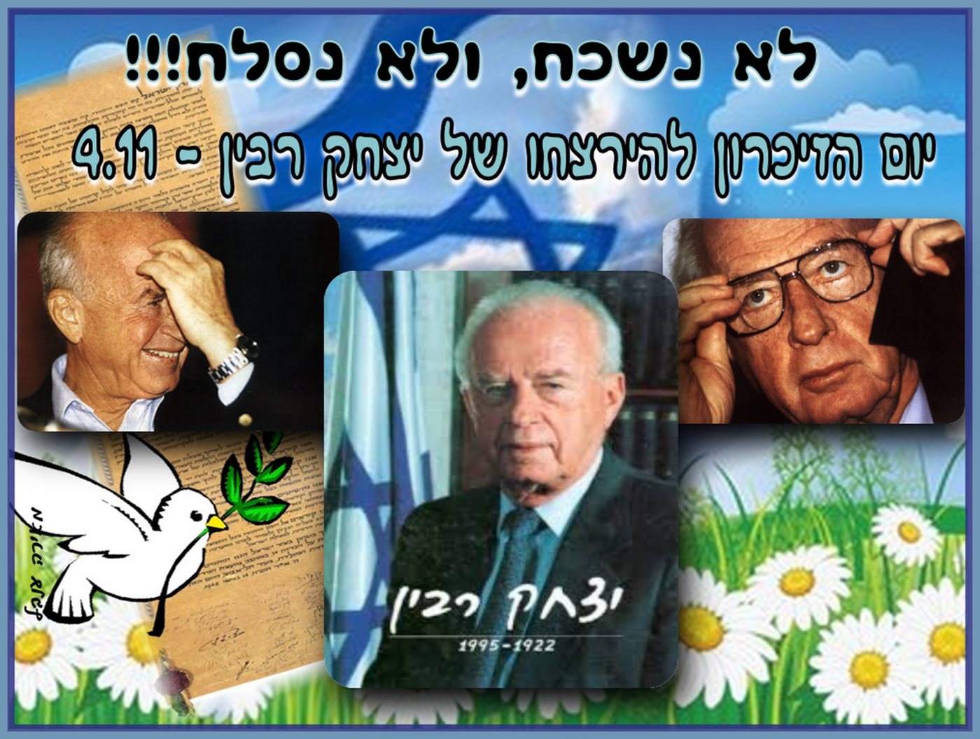 ![]() | ![]() יום הזיכרון למנהיגנו היקר , ראש ממשלת ישראל, יצחק רבין ז"ל שנרצח בנסותו להשכין שלום אמת ב – 4.11.1995 . בשל דעותיו הפוליטיות שלא היו מקובלות על כולם, עלינו לשוב להדגיש ולחשוב את החובה לכבד את חוקי מדינת ישראל, את העובדה כי הדרך היחידה לקבלת הכרעות בחברה היא הדרך הדמוקרטית. הדמוקרטיה מאפשרת לכל אזרח להראות ולהשמיע את דבריו תוך סובלנות והסכמה רחבה על כללי המשחק. מותר ואפשר לחלוק, אפשר לא לקבל אבל חלילה לא לפגוע לרעה. אדם באמונתו יחיה וחובה עלינו לכבד דעותיהם של האחרים ואופן התנהגותם, דיבורם, צורתם והליכותיהם. כי אנחנו חיים בחברה דמוקרטית . ההתנקשות בחייו של יצחק רבין סיימה בצורה טרגית את חייו של אדם, כשנרצח יצחק רבין חשו רבים מאזרחי ישראל כאילו מת אביהם הפרטי, בגלל אהבתם הגדולה אליו, ובגלל אישיותו המיוחדת, האבהית... כל אלו יחד עם תפקידו כראש הממשלה מוביל תהליך השלום חברו יחד לתחושה שאבד לנו מנהיג מיוחד, אבא, לכל אחד באופן פרטי ולכולנו יחד.