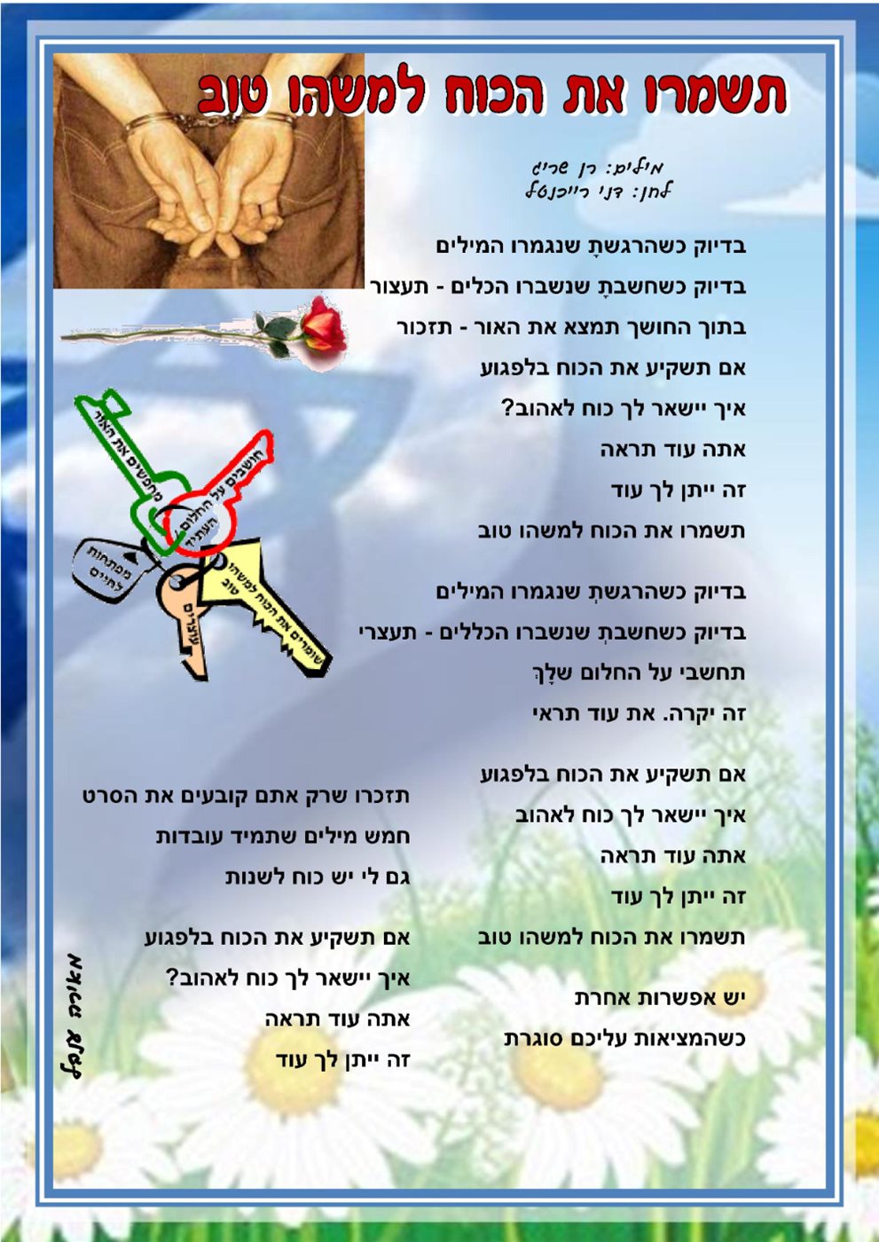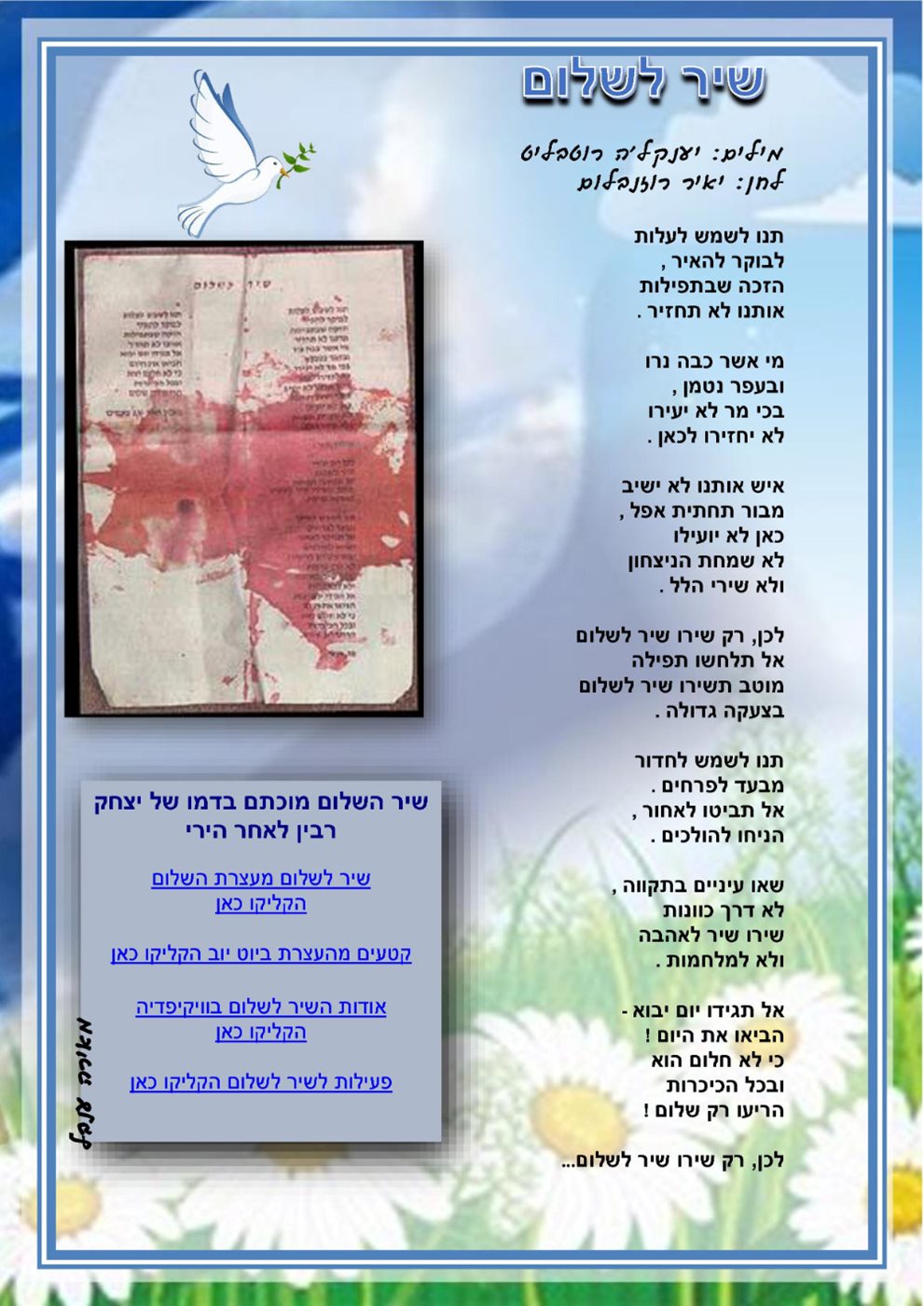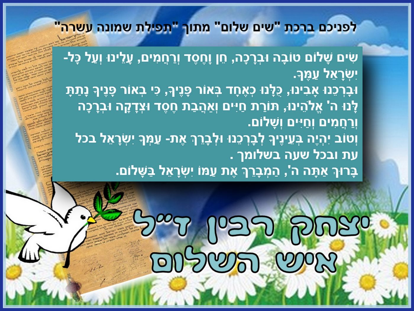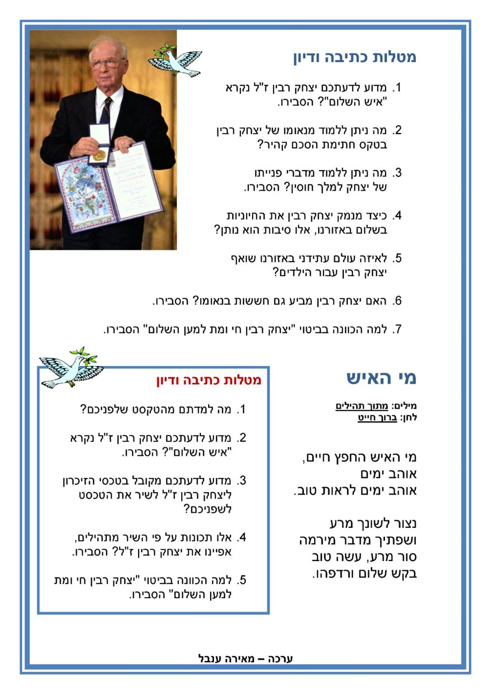 ![]() | ![]() יום הזיכרון למנהיגנו היקר , ראש ממשלת ישראל, יצחק רבין ז"ל שנרצח בנסותו להשכין שלום אמת ב – 4.11.1995 . בשל דעותיו הפוליטיות שלא היו מקובלות על כולם, עלינו לשוב להדגיש ולחשוב את החובה לכבד את חוקי מדינת ישראל, את העובדה כי הדרך היחידה לקבלת הכרעות בחברה היא הדרך הדמוקרטית. הדמוקרטיה מאפשרת לכל אזרח להראות ולהשמיע את דבריו תוך סובלנות והסכמה רחבה על כללי המשחק. מותר ואפשר לחלוק, אפשר לא לקבל אבל חלילה לא לפגוע לרעה. אדם באמונתו יחיה וחובה עלינו לכבד דעותיהם של האחרים ואופן התנהגותם, דיבורם, צורתם והליכותיהם. כי אנחנו חיים בחברה דמוקרטית . ההתנקשות בחייו של יצחק רבין סיימה בצורה טרגית את חייו של אדם, כשנרצח יצחק רבין חשו רבים מאזרחי ישראל כאילו מת אביהם הפרטי, בגלל אהבתם הגדולה אליו, ובגלל אישיותו המיוחדת, האבהית... כל אלו יחד עם תפקידו כראש הממשלה מוביל תהליך השלום חברו יחד לתחושה שאבד לנו מנהיג מיוחד, אבא, לכל אחד באופן פרטי ולכולנו יחד.