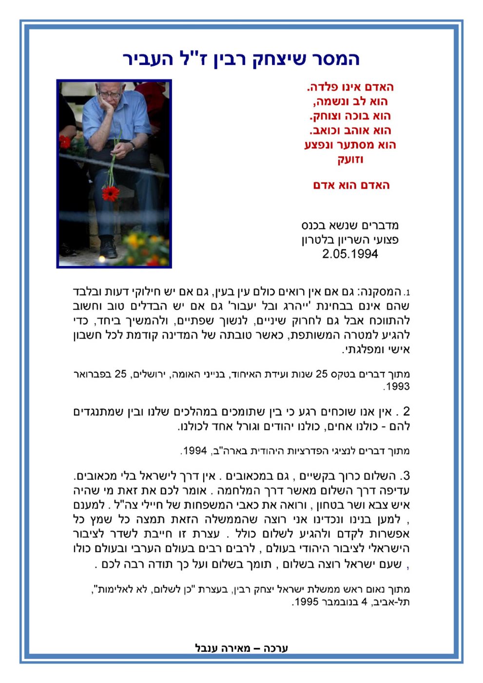 מתוך נאום ראש ממשלת ישראל יצחק רבין, בעצרת "כן לשלום, לא לאלימות",
