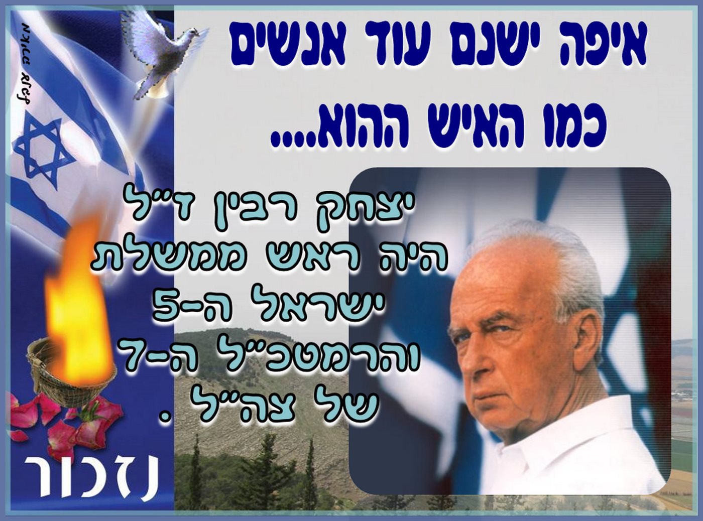 יִצְחָק רַבִּין נולד ב- א' באדר תרפ"ב, 1 במרץ 1922 – הלך לעולמו ב- י"ב בחשוון תשנ"ו, 4 בנובמבר 1995, היה ראש ממשלת ישראל ה-5 והרמטכ"ל ה-7 של צה"ל .