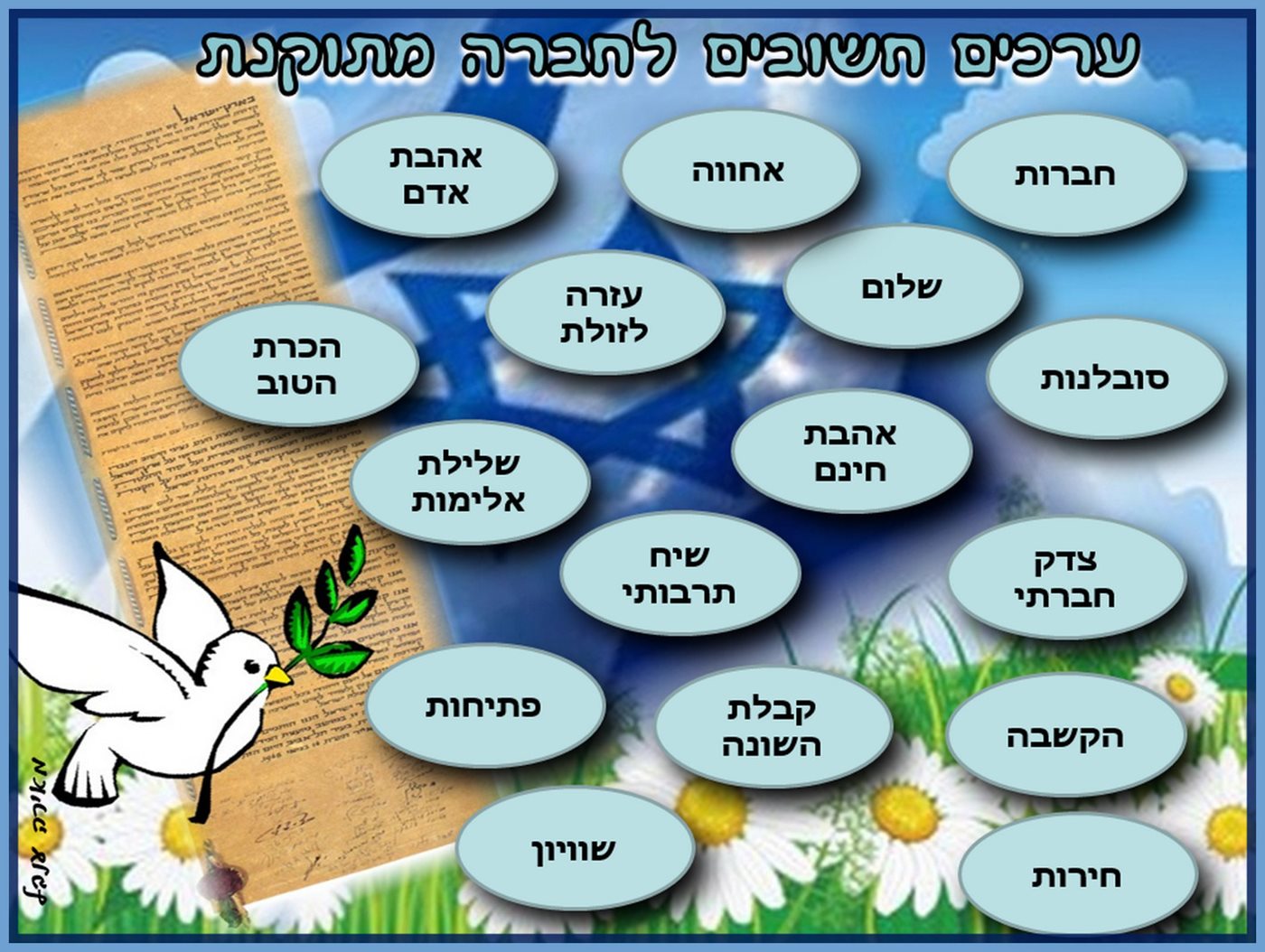 ערכי היסוד של הדמוקרטיה: חירות: זכותו של כל אדם לחשוב או לעשות ככל רצונו ולחיות את חייו בדרך המתאימה לו, כל עוד אינו פוגע באחר, בחברה או בעצמו שוויון: לכל אדם זכות שווה לבטא את חירותו וזכויותיו, כולם שווים בפני החוק והמדינה.
