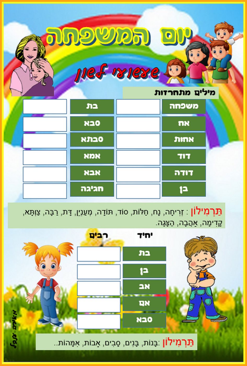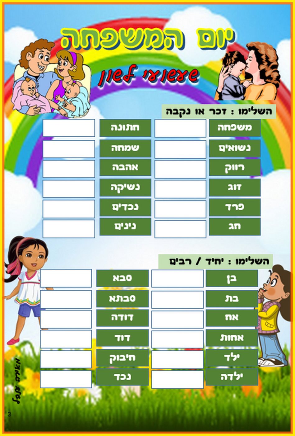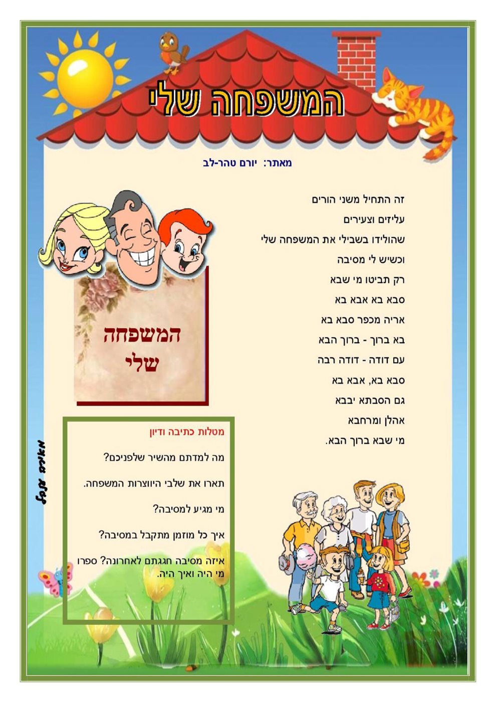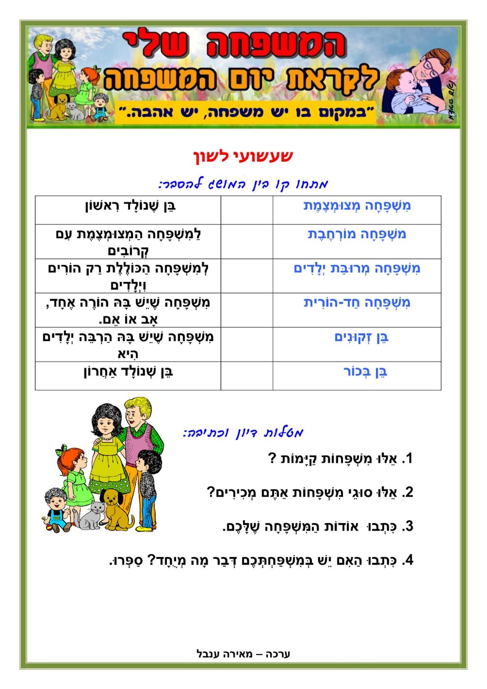 יום המשפחה בפורטל עובדי ההוראה המשפחה בישראל - דעת יום המשפחה-מכללת קיי – חלק ב' ברכה ליום המשפחה, אתר הברכות הישראלי כרטיסי ברכה ליום המשפחה - באנגלית כל אחד והמשפחה שלו – יהודה אטלס סרטון ליום המשפחה - המשפחה שלי |