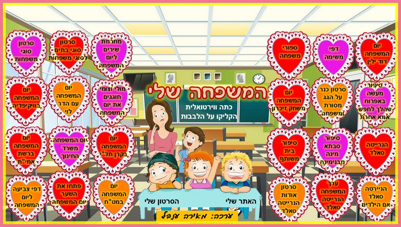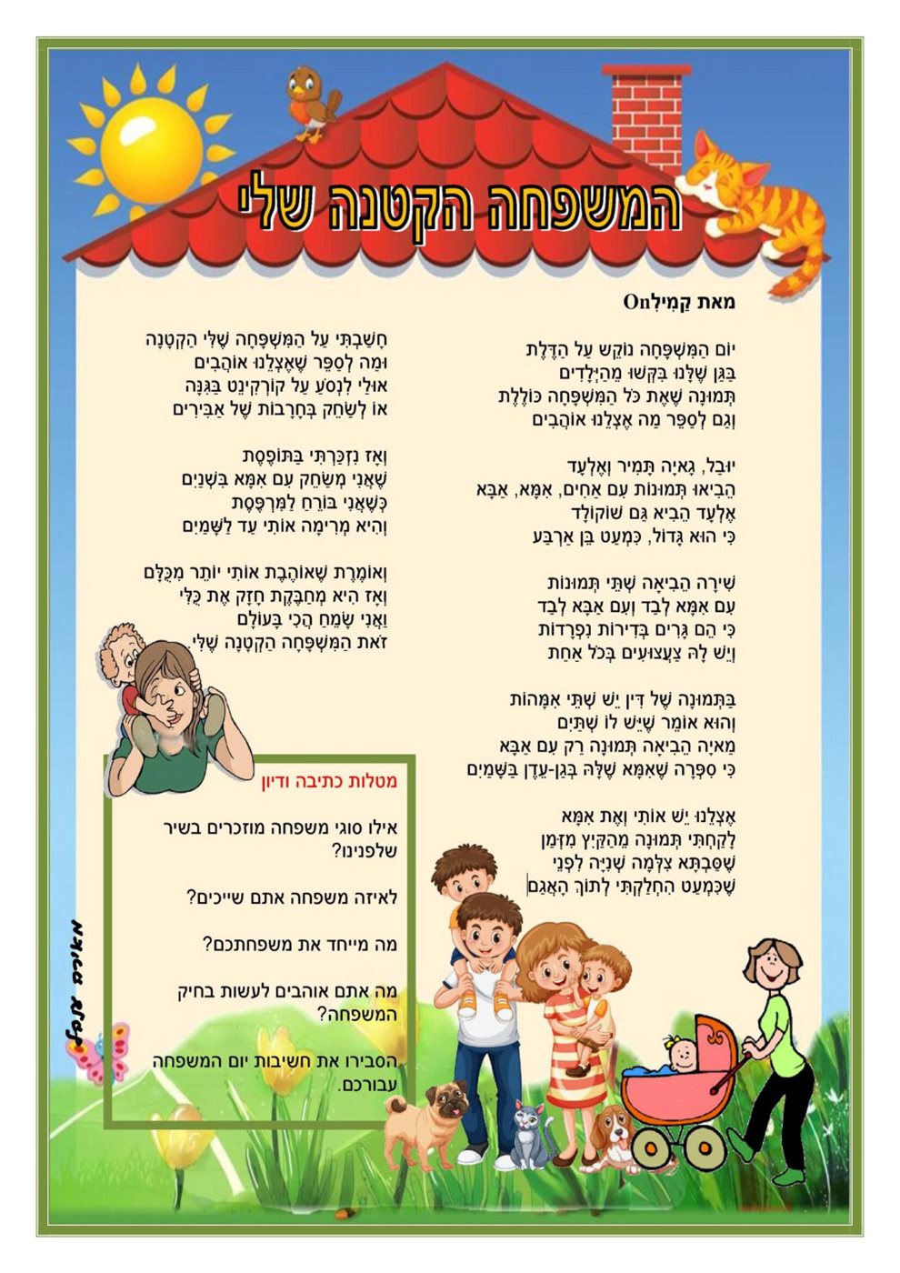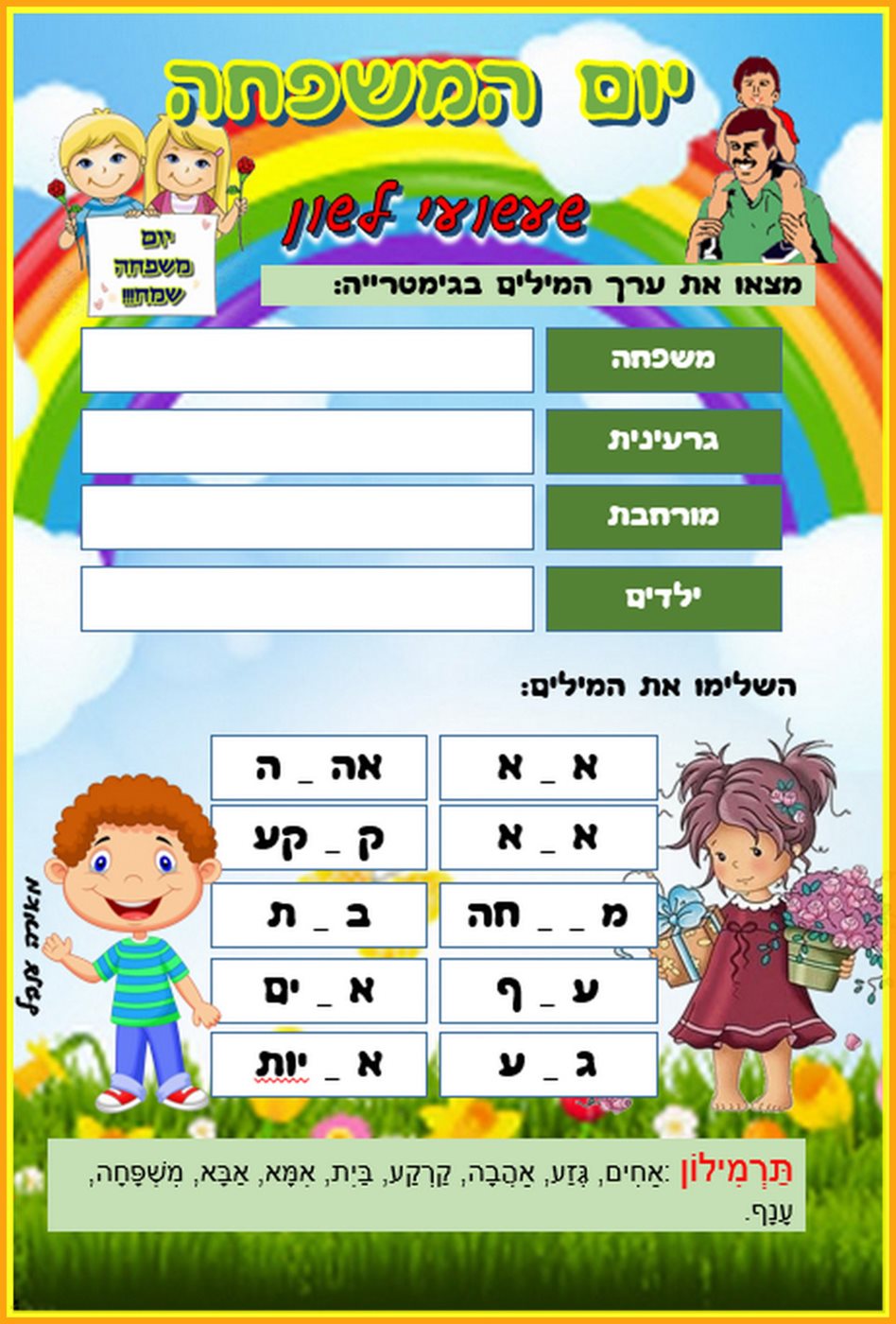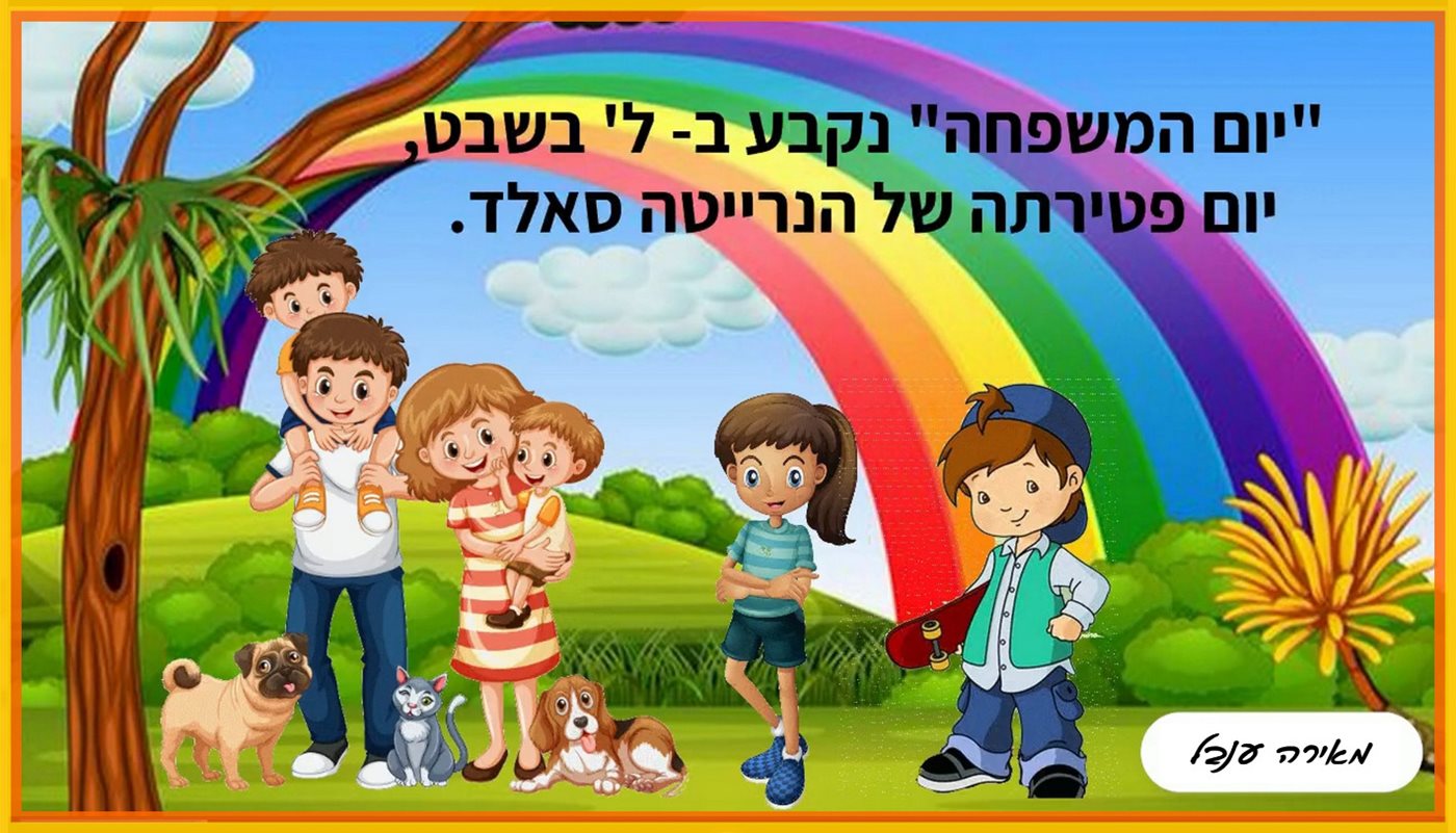 יום המשפחה בפורטל עובדי ההוראה המשפחה בישראל - דעת יום המשפחה-מכללת קיי – חלק ב' ברכה ליום המשפחה, אתר הברכות הישראלי כרטיסי ברכה ליום המשפחה - באנגלית כל אחד והמשפחה שלו – יהודה אטלס סרטון ליום המשפחה - המשפחה שלי |