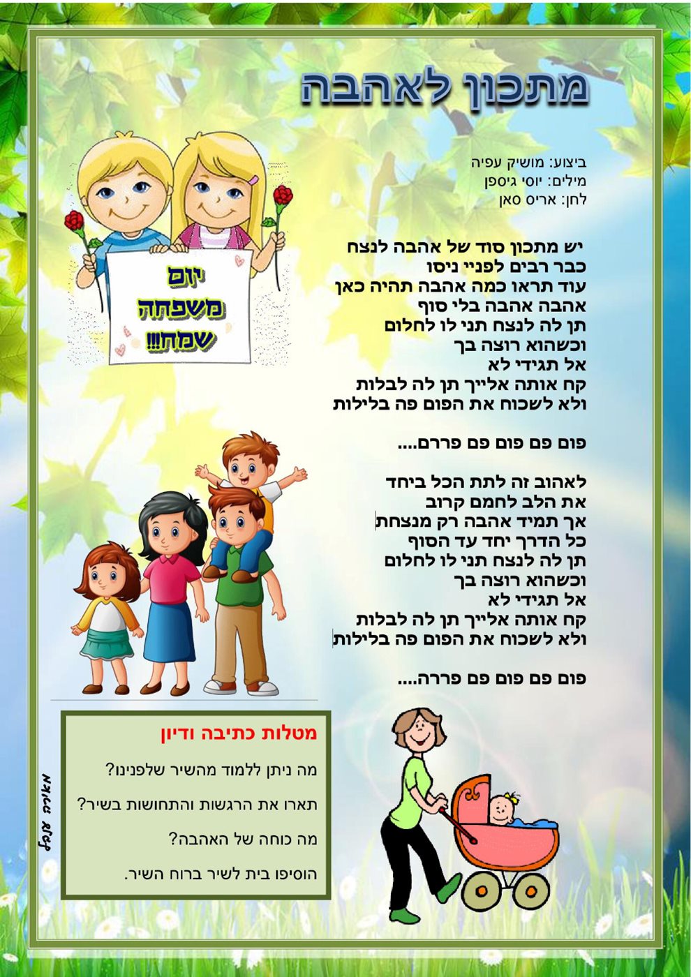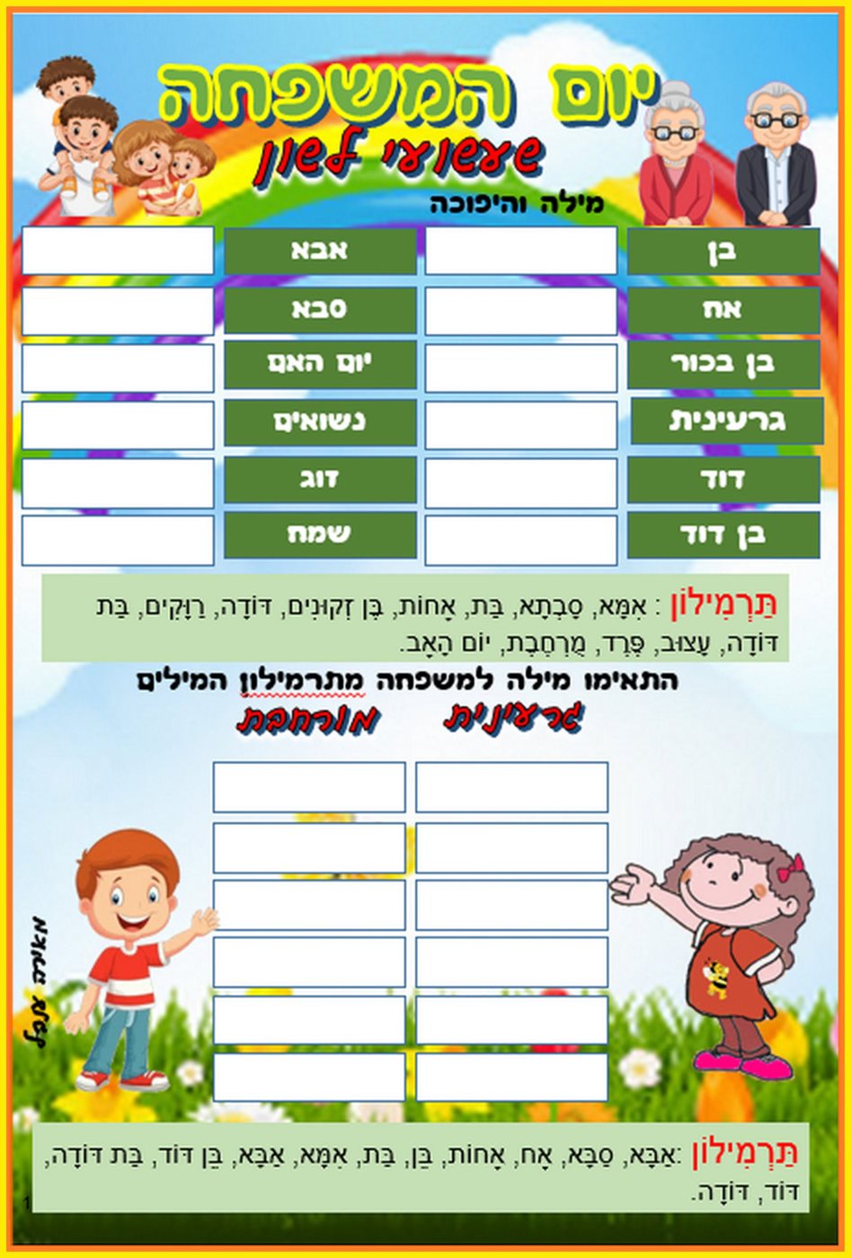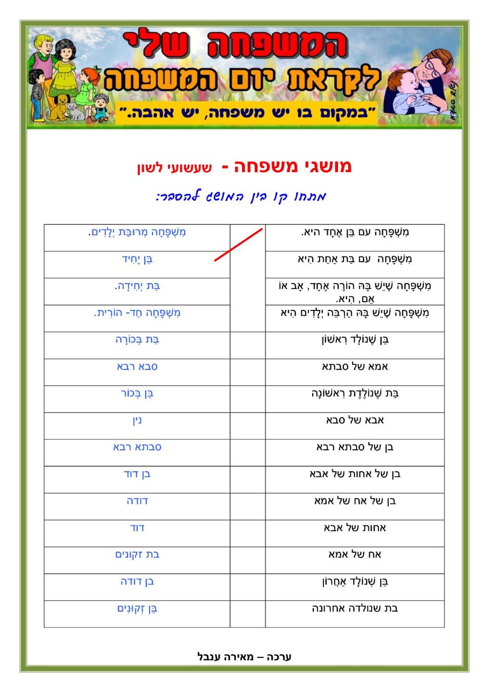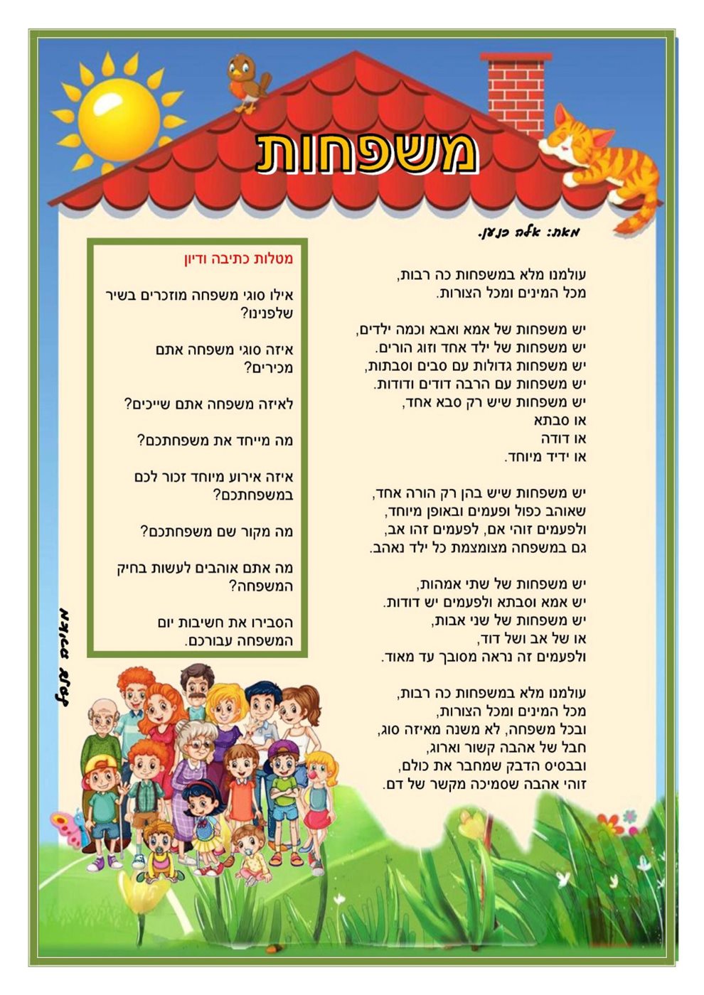 יום המשפחה בפורטל עובדי ההוראה המשפחה בישראל - דעת יום המשפחה-מכללת קיי – חלק ב' ברכה ליום המשפחה, אתר הברכות הישראלי כרטיסי ברכה ליום המשפחה - באנגלית כל אחד והמשפחה שלו – יהודה אטלס סרטון ליום המשפחה - המשפחה שלי |
