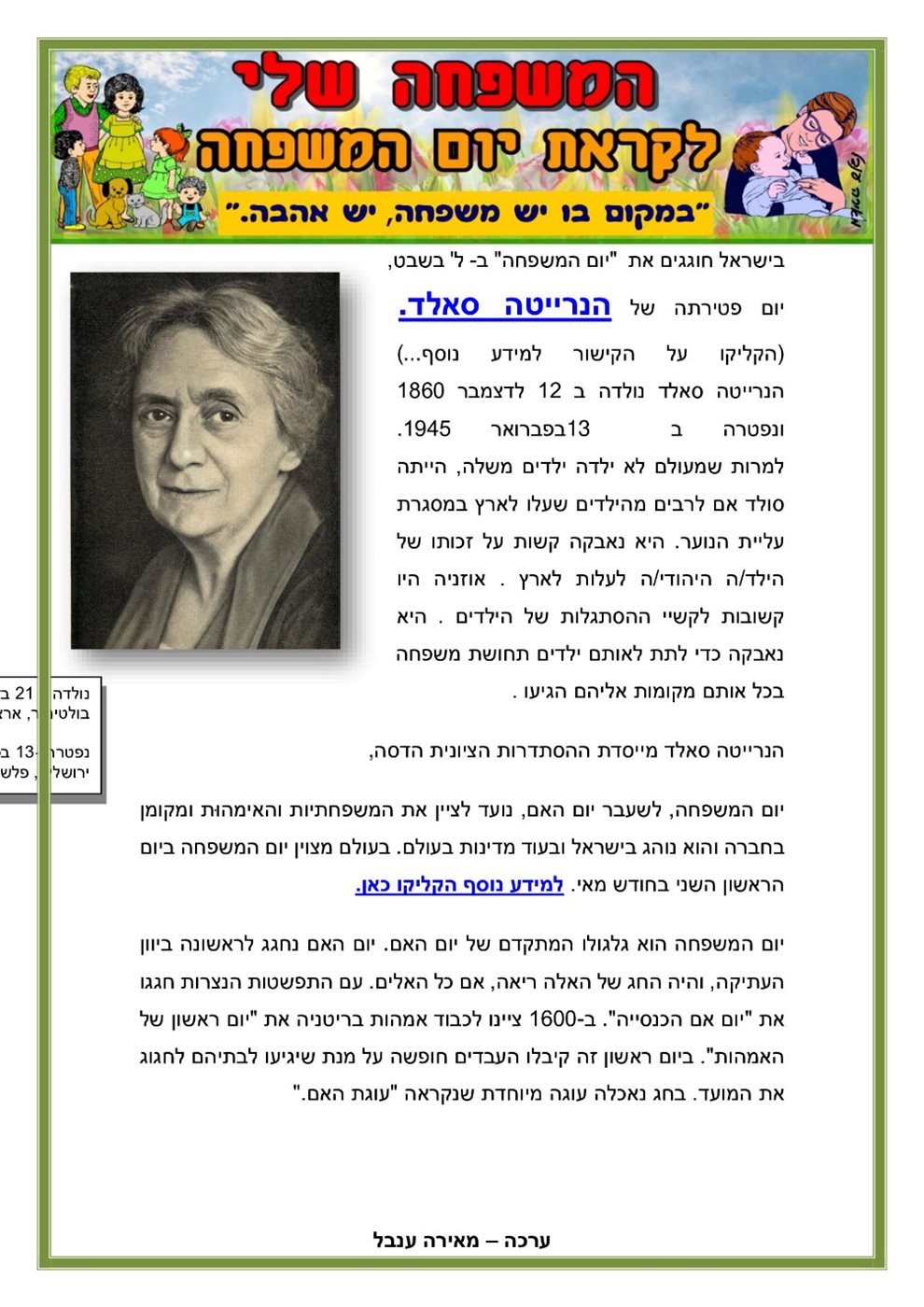 ![]() בישראל חוגגים את "יום המשפחה" ב- ל' בשבט, יום פטירתה של הנרייטה סאלד.