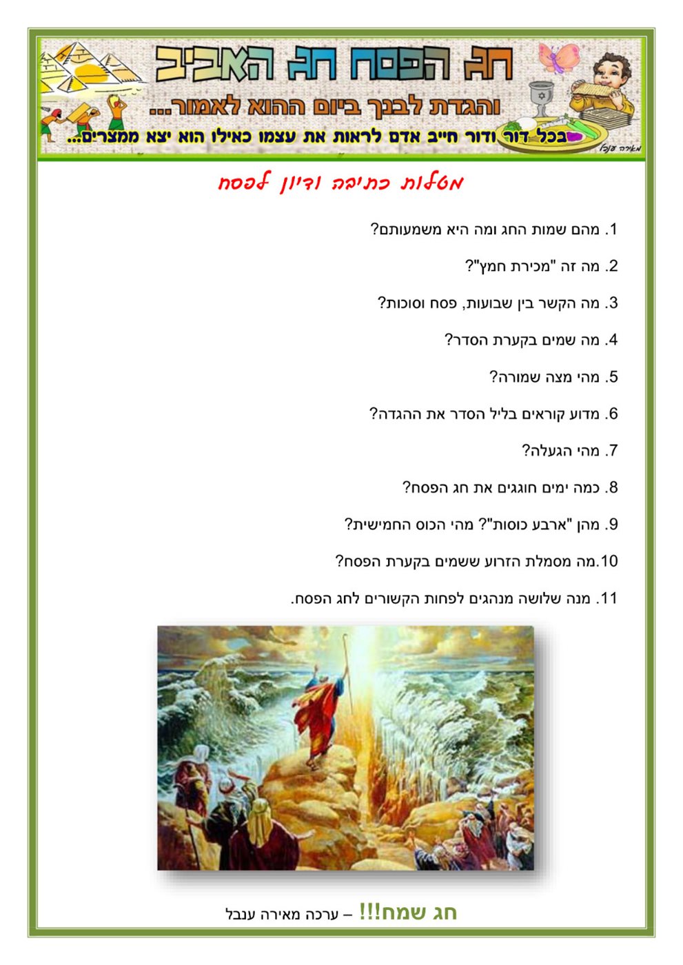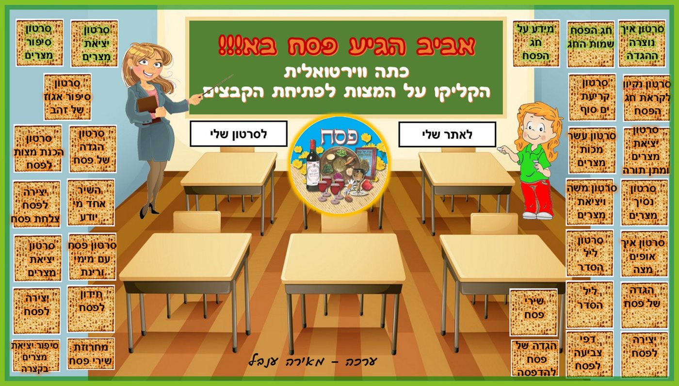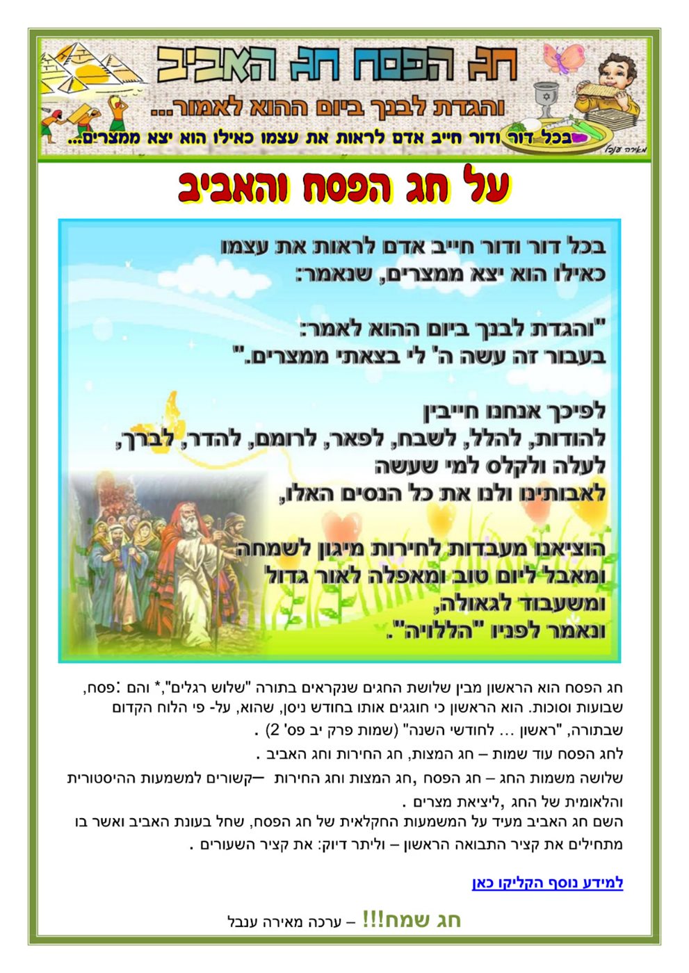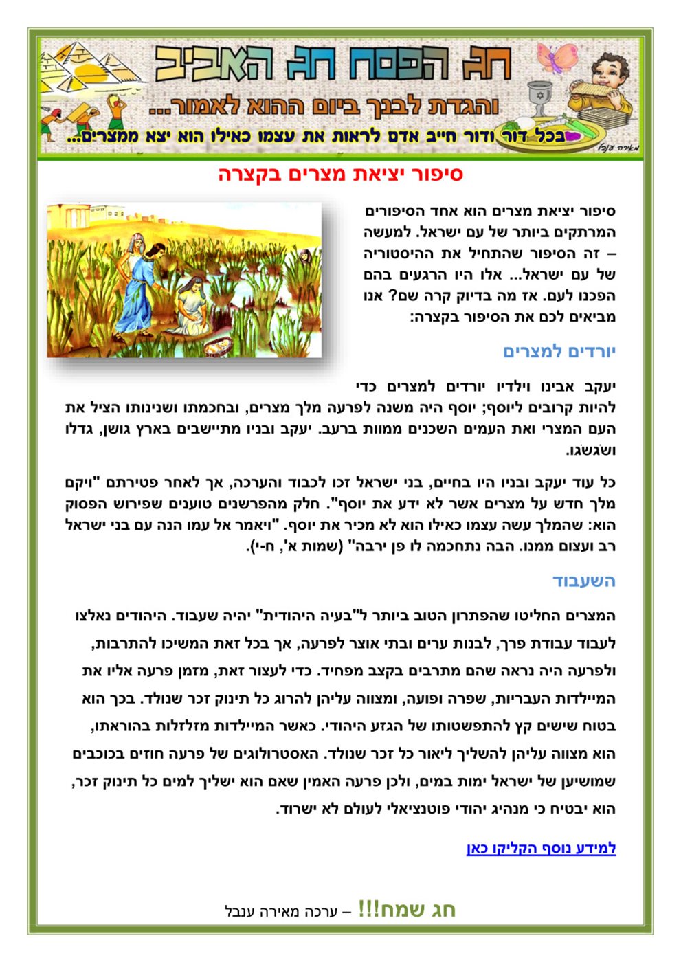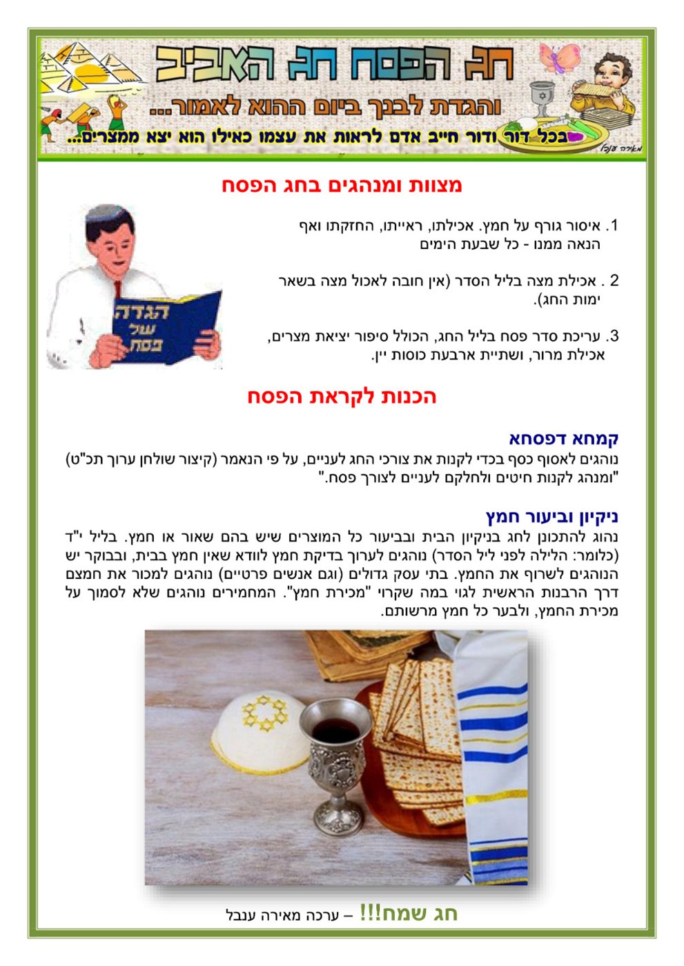 ניקיון וביעור חמץ נהוג להתכונן לחג בניקיון הבית ובביעור כל המוצרים שיש בהם שאור או חמץ. בליל י"ד (כלומר: הלילה לפני ליל הסדר) נוהגים לערוך בדיקת חמץ לוודא שאין חמץ בבית, ובבוקר יש הנוהגים לשרוף את החמץ. בתי עסק גדולים (וגם אנשים פרטיים) נוהגים למכור את חמצם דרך הרבנות הראשית לגוי במה שקרוי "מכירת חמץ". המחמירים נוהגים שלא לסמוך על מכירת החמץ, ולבער כל חמץ מרשותם. סיפור יציאת מצרים בקצרה סיפור יציאת מצרים הוא אחד הסיפורים המרתקים ביותר של עם ישראל. למעשה – זה הסיפור שהתחיל את ההיסטוריה של עם ישראל... אלו היו הרגעים בהם הפכנו לעם. אז מה בדיוק קרה שם? אנו מביאים לכם את הסיפור בקצרה: יורדים למצרים יעקב אבינו וילדיו יורדים למצרים כדי להיות קרובים ליוסף; יוסף היה משנה לפרעה מלך מצרים, ובחכמתו ושנינותו הציל את העם המצרי ואת העמים השכנים ממוות ברעב. יעקב ובניו מתיישבים בארץ גושן, גדלו ושֹגשֹגו. כל עוד יעקב ובניו היו בחיים, בני ישראל זכו לכבוד והערכה, אך לאחר פטירתם "ויקם מלך חדש על מצרים אשר לא ידע את יוסף". חלק מהפרשנים טוענים שפירוש הפסוק הוא: שהמלך עשה עצמו כאילו הוא לא מכיר את יוסף. "ויאמר אל עמו הנה עם בני ישראל רב ועצום ממנו. הבה נתחכמה לו פן ירבה" (שמות א', ח-י). השעבוד המצרים החליטו שהפתרון הטוב ביותר ל"בעיה היהודית" יהיה שעבוד. היהודים נאלצו לעבוד עבודת פרך, לבנות ערים ובתי אוצר לפרעה, אך בכל זאת המשיכו להתרבות, ולפרעה היה נראה שהם מתרבים בקצב מפחיד. כדי לעצור זאת, מזמן פרעה אליו את המיילדות העבריות, שפרה ופועה, ומצווה עליהן להרוג כל תינוק זכר שנולד. בכך הוא בטוח שישים קץ להתפשטותו של הגזע היהודי. כאשר המיילדות מזלזלות בהוראתו, הוא מצווה עליהן להשליך ליאור כל זכר שנולד. האסטרולוגים של פרעה חוזים בכוכבים שמושיען של ישראל ימות במים, ולכן פרעה האמין שאם הוא ישליך למים כל תינוק זכר, הוא יבטיח כי מנהיג יהודי פוטנציאלי לעולם לא ישרוד. כיתה ווירטואלית שמכילה קבצים רבים הקשורים לחג לפתיחת הקובץ יש להקליק על התמונה https://drive.google.com/file/d/18eAODKld6KuoPBaQFGcKlVlRU-R-9PM4/view?usp=sharing |