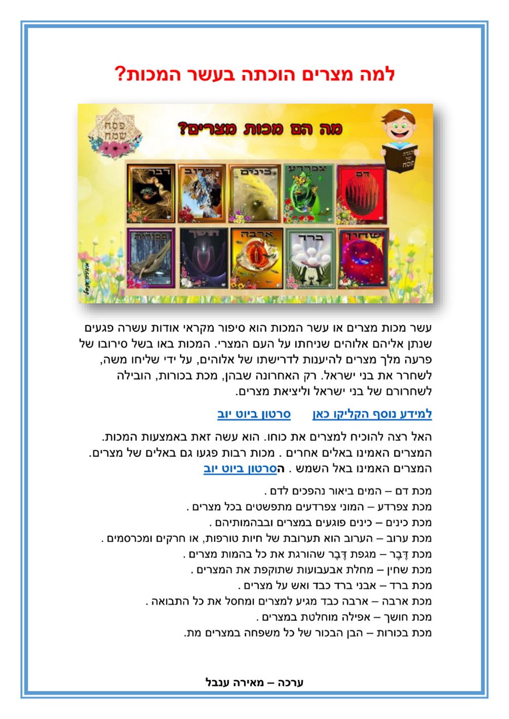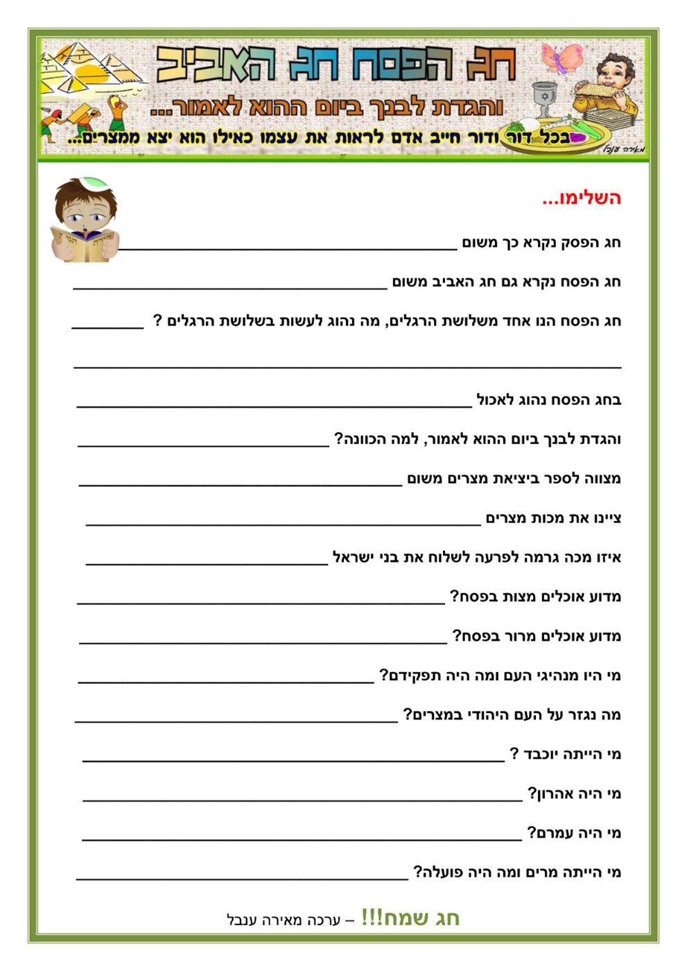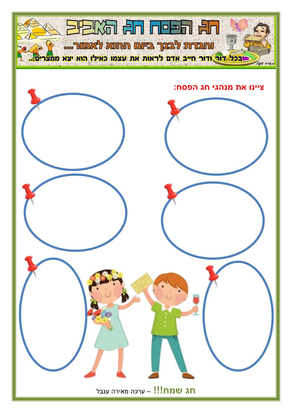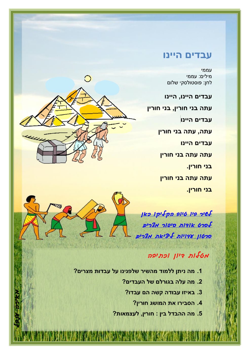 ניקיון וביעור חמץ נהוג להתכונן לחג בניקיון הבית ובביעור כל המוצרים שיש בהם שאור או חמץ. בליל י"ד (כלומר: הלילה לפני ליל הסדר) נוהגים לערוך בדיקת חמץ לוודא שאין חמץ בבית, ובבוקר יש הנוהגים לשרוף את החמץ. בתי עסק גדולים (וגם אנשים פרטיים) נוהגים למכור את חמצם דרך הרבנות הראשית לגוי במה שקרוי "מכירת חמץ". המחמירים נוהגים שלא לסמוך על מכירת החמץ, ולבער כל חמץ מרשותם. סיפור יציאת מצרים בקצרה סיפור יציאת מצרים הוא אחד הסיפורים המרתקים ביותר של עם ישראל. למעשה – זה הסיפור שהתחיל את ההיסטוריה של עם ישראל... אלו היו הרגעים בהם הפכנו לעם. אז מה בדיוק קרה שם? אנו מביאים לכם את הסיפור בקצרה: יורדים למצרים יעקב אבינו וילדיו יורדים למצרים כדי להיות קרובים ליוסף; יוסף היה משנה לפרעה מלך מצרים, ובחכמתו ושנינותו הציל את העם המצרי ואת העמים השכנים ממוות ברעב. יעקב ובניו מתיישבים בארץ גושן, גדלו ושֹגשֹגו. כל עוד יעקב ובניו היו בחיים, בני ישראל זכו לכבוד והערכה, אך לאחר פטירתם "ויקם מלך חדש על מצרים אשר לא ידע את יוסף". חלק מהפרשנים טוענים שפירוש הפסוק הוא: שהמלך עשה עצמו כאילו הוא לא מכיר את יוסף. "ויאמר אל עמו הנה עם בני ישראל רב ועצום ממנו. הבה נתחכמה לו פן ירבה" (שמות א', ח-י). השעבוד המצרים החליטו שהפתרון הטוב ביותר ל"בעיה היהודית" יהיה שעבוד. היהודים נאלצו לעבוד עבודת פרך, לבנות ערים ובתי אוצר לפרעה, אך בכל זאת המשיכו להתרבות, ולפרעה היה נראה שהם מתרבים בקצב מפחיד. כדי לעצור זאת, מזמן פרעה אליו את המיילדות העבריות, שפרה ופועה, ומצווה עליהן להרוג כל תינוק זכר שנולד. בכך הוא בטוח שישים קץ להתפשטותו של הגזע היהודי. כאשר המיילדות מזלזלות בהוראתו, הוא מצווה עליהן להשליך ליאור כל זכר שנולד. האסטרולוגים של פרעה חוזים בכוכבים שמושיען של ישראל ימות במים, ולכן פרעה האמין שאם הוא ישליך למים כל תינוק זכר, הוא יבטיח כי מנהיג יהודי פוטנציאלי לעולם לא ישרוד. כיתה ווירטואלית שמכילה קבצים רבים הקשורים לחג לפתיחת הקובץ יש להקליק על התמונה https://drive.google.com/file/d/18eAODKld6KuoPBaQFGcKlVlRU-R-9PM4/view?usp=sharing |