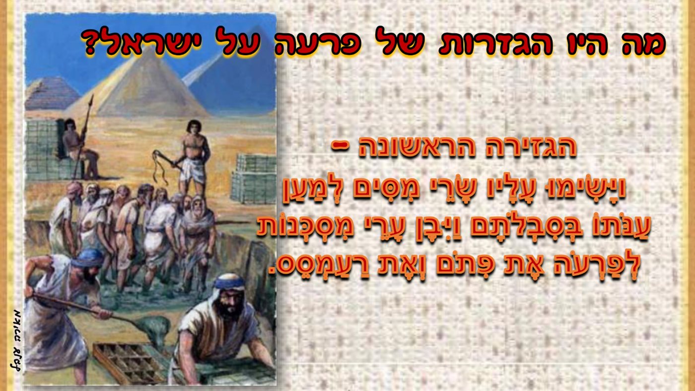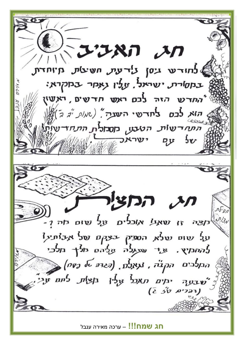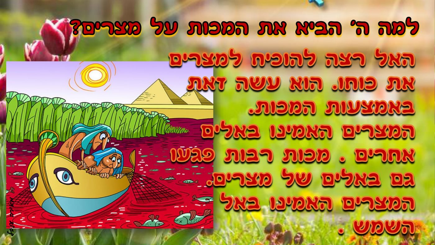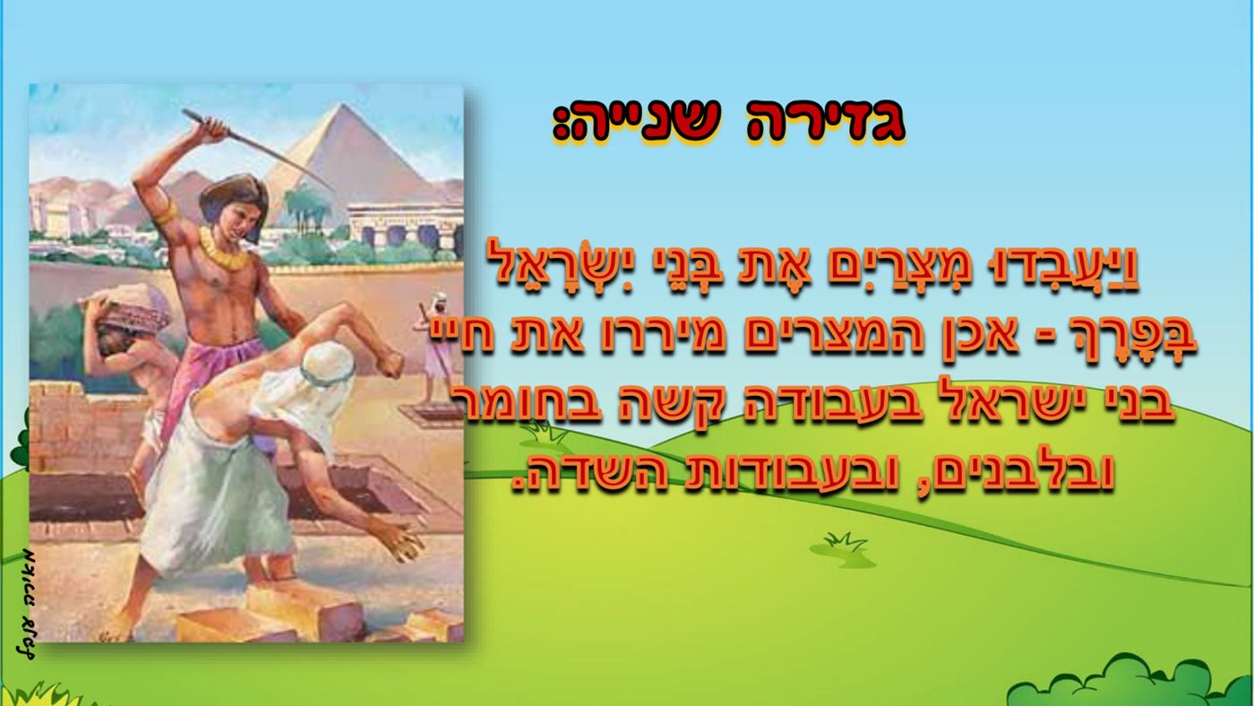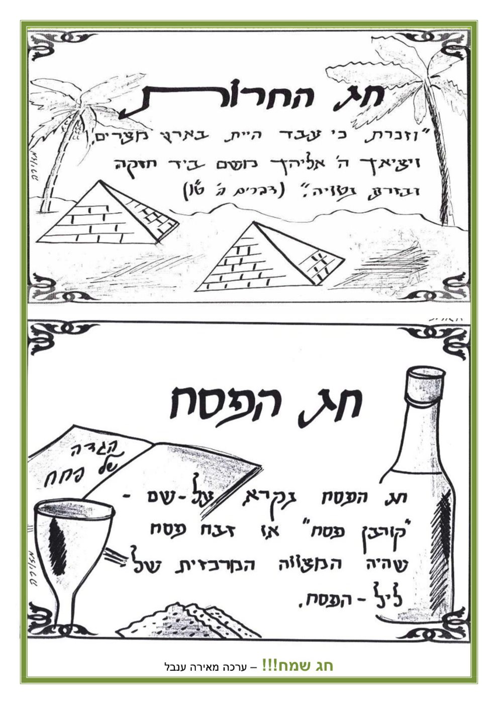 ניקיון וביעור חמץ נהוג להתכונן לחג בניקיון הבית ובביעור כל המוצרים שיש בהם שאור או חמץ. בליל י"ד (כלומר: הלילה לפני ליל הסדר) נוהגים לערוך בדיקת חמץ לוודא שאין חמץ בבית, ובבוקר יש הנוהגים לשרוף את החמץ. בתי עסק גדולים (וגם אנשים פרטיים) נוהגים למכור את חמצם דרך הרבנות הראשית לגוי במה שקרוי "מכירת חמץ". המחמירים נוהגים שלא לסמוך על מכירת החמץ, ולבער כל חמץ מרשותם. סיפור יציאת מצרים בקצרה סיפור יציאת מצרים הוא אחד הסיפורים המרתקים ביותר של עם ישראל. למעשה – זה הסיפור שהתחיל את ההיסטוריה של עם ישראל... אלו היו הרגעים בהם הפכנו לעם. אז מה בדיוק קרה שם? אנו מביאים לכם את הסיפור בקצרה: יורדים למצרים יעקב אבינו וילדיו יורדים למצרים כדי להיות קרובים ליוסף; יוסף היה משנה לפרעה מלך מצרים, ובחכמתו ושנינותו הציל את העם המצרי ואת העמים השכנים ממוות ברעב. יעקב ובניו מתיישבים בארץ גושן, גדלו ושֹגשֹגו. כל עוד יעקב ובניו היו בחיים, בני ישראל זכו לכבוד והערכה, אך לאחר פטירתם "ויקם מלך חדש על מצרים אשר לא ידע את יוסף". חלק מהפרשנים טוענים שפירוש הפסוק הוא: שהמלך עשה עצמו כאילו הוא לא מכיר את יוסף. "ויאמר אל עמו הנה עם בני ישראל רב ועצום ממנו. הבה נתחכמה לו פן ירבה" (שמות א', ח-י). השעבוד המצרים החליטו שהפתרון הטוב ביותר ל"בעיה היהודית" יהיה שעבוד. היהודים נאלצו לעבוד עבודת פרך, לבנות ערים ובתי אוצר לפרעה, אך בכל זאת המשיכו להתרבות, ולפרעה היה נראה שהם מתרבים בקצב מפחיד. כדי לעצור זאת, מזמן פרעה אליו את המיילדות העבריות, שפרה ופועה, ומצווה עליהן להרוג כל תינוק זכר שנולד. בכך הוא בטוח שישים קץ להתפשטותו של הגזע היהודי. כאשר המיילדות מזלזלות בהוראתו, הוא מצווה עליהן להשליך ליאור כל זכר שנולד. האסטרולוגים של פרעה חוזים בכוכבים שמושיען של ישראל ימות במים, ולכן פרעה האמין שאם הוא ישליך למים כל תינוק זכר, הוא יבטיח כי מנהיג יהודי פוטנציאלי לעולם לא ישרוד. כיתה ווירטואלית שמכילה קבצים רבים הקשורים לחג לפתיחת הקובץ יש להקליק על התמונה https://drive.google.com/file/d/18eAODKld6KuoPBaQFGcKlVlRU-R-9PM4/view?usp=sharing |