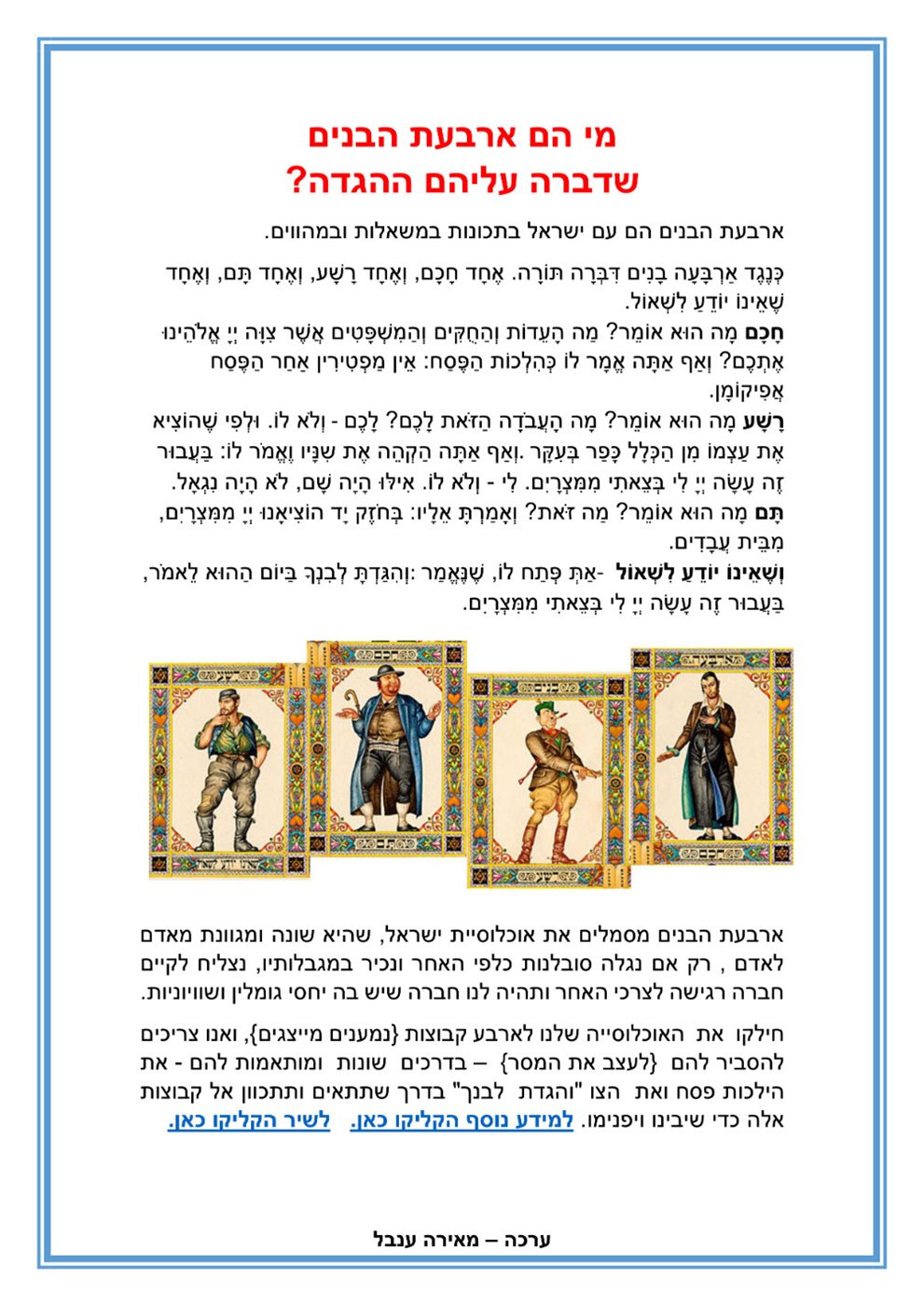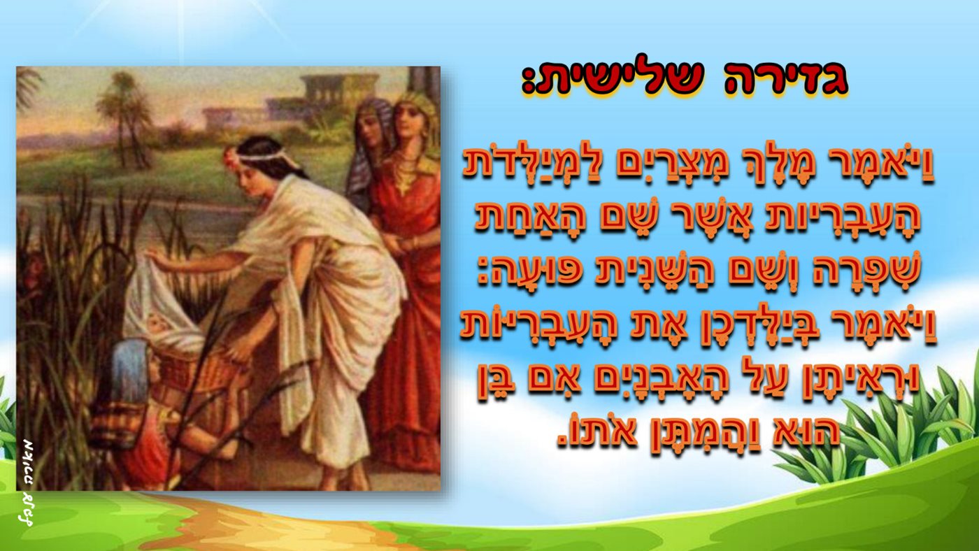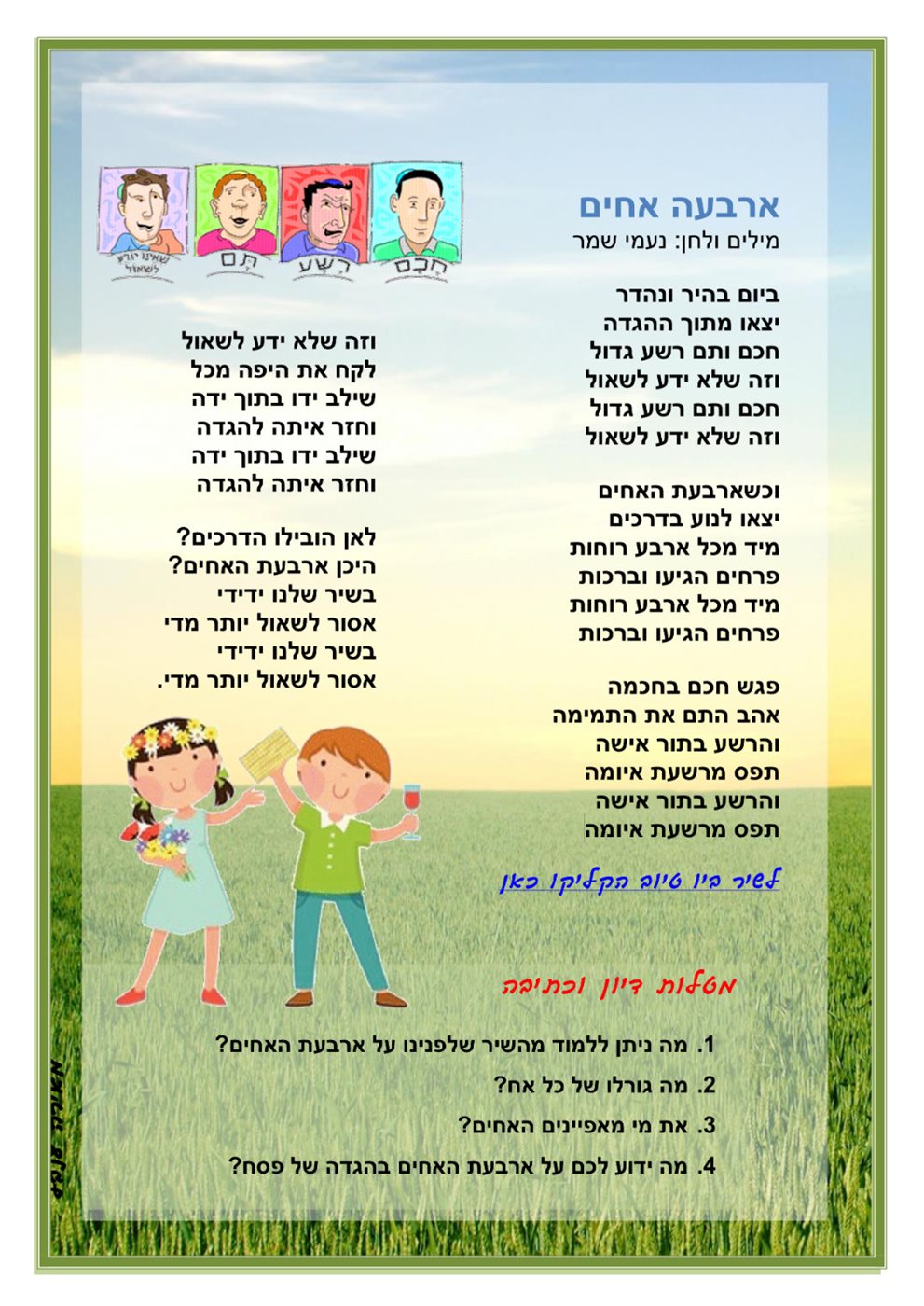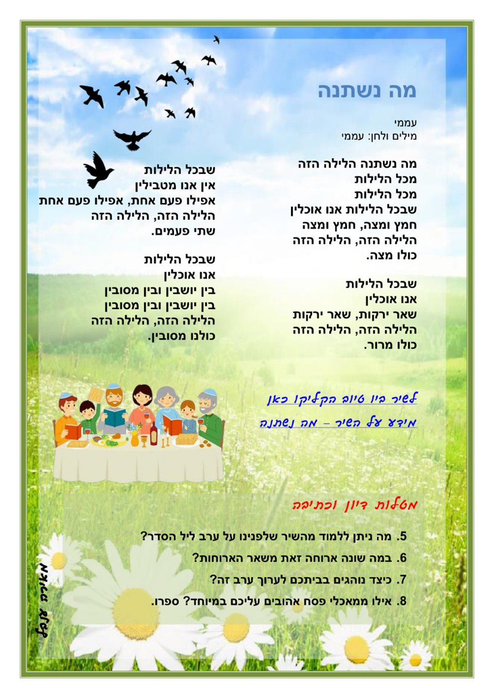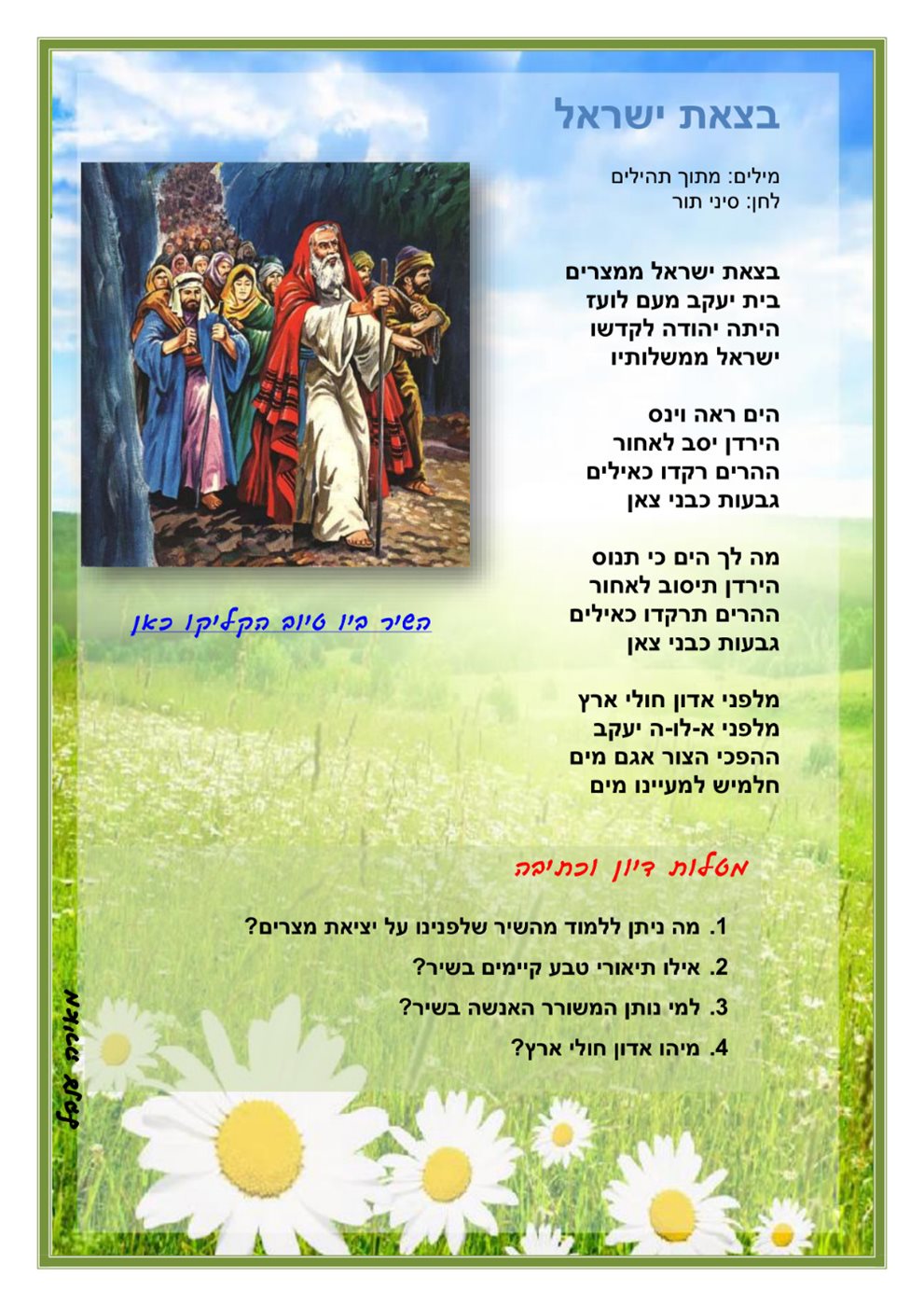 ניקיון וביעור חמץ נהוג להתכונן לחג בניקיון הבית ובביעור כל המוצרים שיש בהם שאור או חמץ. בליל י"ד (כלומר: הלילה לפני ליל הסדר) נוהגים לערוך בדיקת חמץ לוודא שאין חמץ בבית, ובבוקר יש הנוהגים לשרוף את החמץ. בתי עסק גדולים (וגם אנשים פרטיים) נוהגים למכור את חמצם דרך הרבנות הראשית לגוי במה שקרוי "מכירת חמץ". המחמירים נוהגים שלא לסמוך על מכירת החמץ, ולבער כל חמץ מרשותם. סיפור יציאת מצרים בקצרה סיפור יציאת מצרים הוא אחד הסיפורים המרתקים ביותר של עם ישראל. למעשה – זה הסיפור שהתחיל את ההיסטוריה של עם ישראל... אלו היו הרגעים בהם הפכנו לעם. אז מה בדיוק קרה שם? אנו מביאים לכם את הסיפור בקצרה: יורדים למצרים יעקב אבינו וילדיו יורדים למצרים כדי להיות קרובים ליוסף; יוסף היה משנה לפרעה מלך מצרים, ובחכמתו ושנינותו הציל את העם המצרי ואת העמים השכנים ממוות ברעב. יעקב ובניו מתיישבים בארץ גושן, גדלו ושֹגשֹגו. כל עוד יעקב ובניו היו בחיים, בני ישראל זכו לכבוד והערכה, אך לאחר פטירתם "ויקם מלך חדש על מצרים אשר לא ידע את יוסף". חלק מהפרשנים טוענים שפירוש הפסוק הוא: שהמלך עשה עצמו כאילו הוא לא מכיר את יוסף. "ויאמר אל עמו הנה עם בני ישראל רב ועצום ממנו. הבה נתחכמה לו פן ירבה" (שמות א', ח-י). השעבוד המצרים החליטו שהפתרון הטוב ביותר ל"בעיה היהודית" יהיה שעבוד. היהודים נאלצו לעבוד עבודת פרך, לבנות ערים ובתי אוצר לפרעה, אך בכל זאת המשיכו להתרבות, ולפרעה היה נראה שהם מתרבים בקצב מפחיד. כדי לעצור זאת, מזמן פרעה אליו את המיילדות העבריות, שפרה ופועה, ומצווה עליהן להרוג כל תינוק זכר שנולד. בכך הוא בטוח שישים קץ להתפשטותו של הגזע היהודי. כאשר המיילדות מזלזלות בהוראתו, הוא מצווה עליהן להשליך ליאור כל זכר שנולד. האסטרולוגים של פרעה חוזים בכוכבים שמושיען של ישראל ימות במים, ולכן פרעה האמין שאם הוא ישליך למים כל תינוק זכר, הוא יבטיח כי מנהיג יהודי פוטנציאלי לעולם לא ישרוד. כיתה ווירטואלית שמכילה קבצים רבים הקשורים לחג לפתיחת הקובץ יש להקליק על התמונה https://drive.google.com/file/d/18eAODKld6KuoPBaQFGcKlVlRU-R-9PM4/view?usp=sharing |