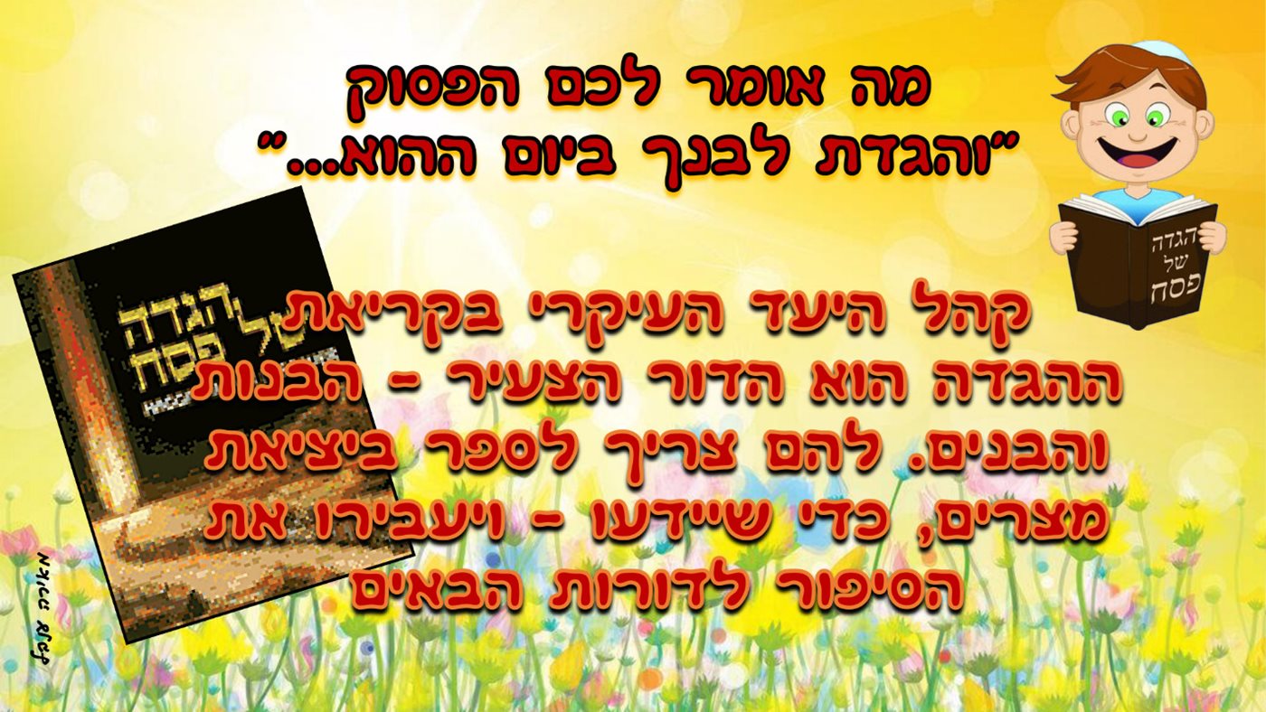 מצווה לספר בליל הסדר על יציאת מצריים. ההגדה של פסח היא נוסח קבוע של סיפור זה, כפי שנקבע על ידי חז"ל ועל כל יהודי בוגר לאומרו בליל הסדר.