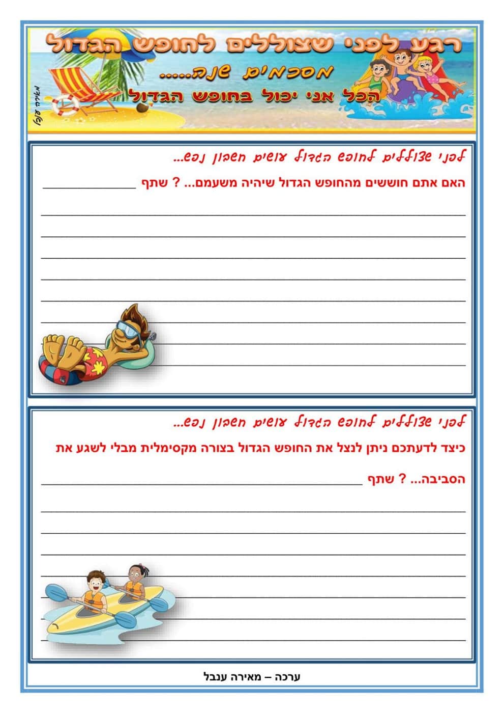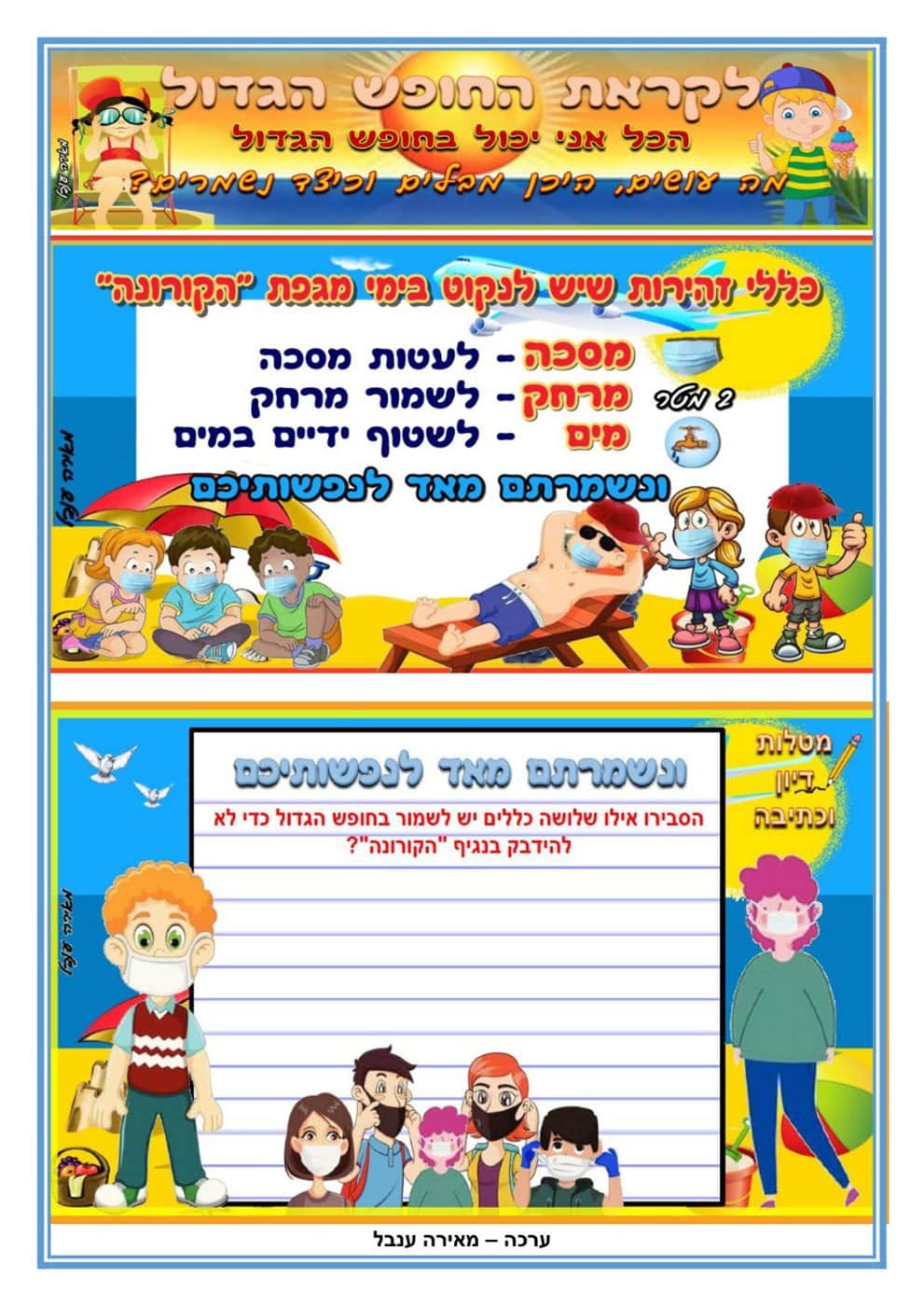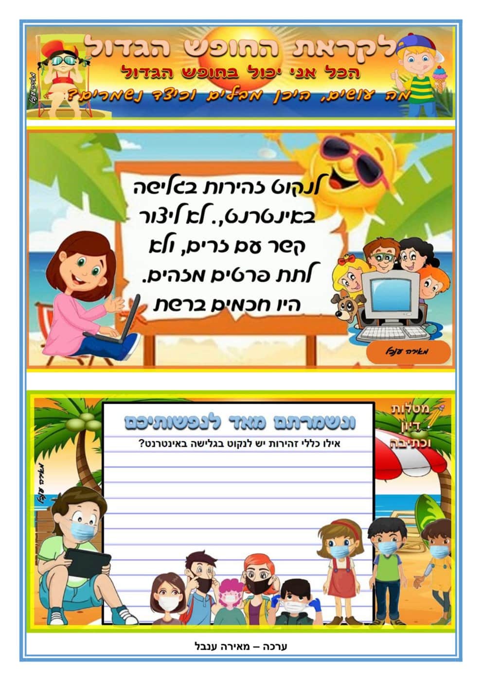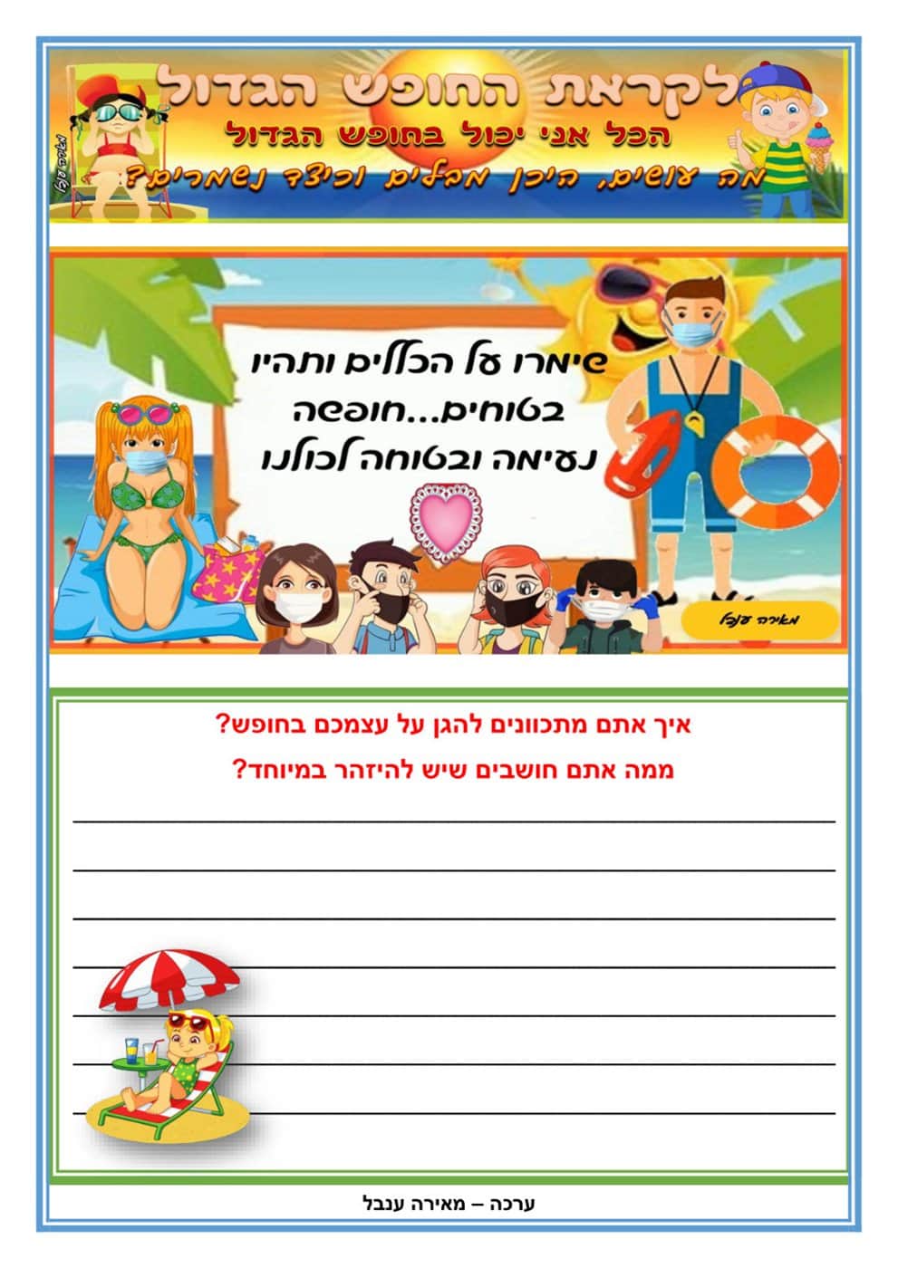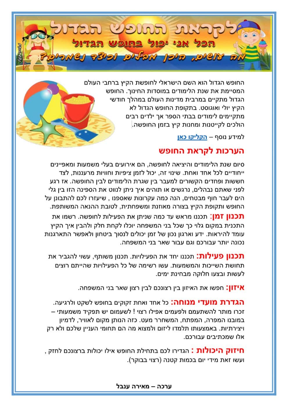 ![]() החופש הגדול הוא השם הישראלי לחופשת הקיץ ברחבי העולם המסיימת את שנת הלימודים במוסדות החינוך. החופש הגדול מתקיים במרבית מדינות העולם במהלך חודשי הקיץ יולי ואוגוסט. בתקופת החופש הגדול לא מתקיימים לימודים בבתי הספר אך ילדים רבים הולכים לקייטנות ומחנות קיץ בזמן החופשה. למידע נוסף – הקליקו כאן הערכות לקראת החופש סיום שנת הלימודים והיציאה לחופשה, הם אירועים בעלי משמעות ומאפיינים ייחודיים לכל אחד ואחת. שינוי זה, יכול לזמן ציפיות וחוויות מרעננות, לצד חששות ופחדים הקשורים למעבר בין שגרת הלימודים לבין החופשה. אז רגע לפני שאתם נבהלים, נרגשים או תוהים איך ניתן לנווט את הספינה הזו בין גלי הים לעבר חוף מבטחים, הנה כמה עקרונות שאספנו , שיעזרו לכם להתבונן על החופש ותקופת הקיץ בצורה מאוזנת ומשפחתית, לטובת ההנאה המשותפת. תכנון פעילות: תכננו יחד את הפעילויות. תכנון משותף, עשוי להגביר את תחושת השייכות והמשמעות. עשו רשימה של כל הפעילויות שהייתם רוצים לעשות ובצעו חלוקה מבחינת ימים. איזון: חפשו את האיזון בין רצונכם לבין רצון שאר בני המשפחה. הגדרת מועדי מנוחה: כל אחד ואחת זקוקים בחופש לשקט ולרגיעה. זכרו מותר להשתעמם ולפעמים אפילו רצוי ! לשעמום יש תפקיד משמעותי – במובנו המפרה, המפתח, המשחרר מעט. כזה הנותן מקום לאוויר, לדמיון ויצירתיות. באמצעותו תלמדו ליזום ולמצוא מה הם תחומי העניין שלכם ולא רק אלו שמכתיבים עבורכם. חיזוק היכולות : הגדירו לכם בתחילת החופש אילו יכולות ברצונכם לחזק , ועשו זאת מידי יום בכמות קטנה (רצוי בבוקר כשערנים יותר). גבולות: גם בחופש רצוי לשמור על גבולות. הם אמנם יכולים להיות גמישים מהרגיל, אך הם הכרחיים עבור תחושת הביטחון בה הכול אפשרי. הקשבה אחרת: כאשר אנחנו מורידים הילוך מהמרוץ היומיומי, נוצרת הזדמנות להקשיב באמת אחד לשני. הזדמנות להתקרבות: החופש הוא הזדמנות ליצירת בילויים משותפים עם המשפחה, להתקרבות ולהידוק ושיפור היחסים בינכם. הבית כעוגן: לא חייבים לרוץ ממקום למקום, לא חייבים לגלוש, לקפוץ, לצלול, לצאת ולחפש אחר מקומות רבים כל כך לבילוי רציף. זכרו, גם הבית יכול להיות סביבה לבילוי, הנאה וזמן איכות משותף. למידע נוסף – הקליקו כאן הקליקו על התמונה לפתיחת קובץ PDF