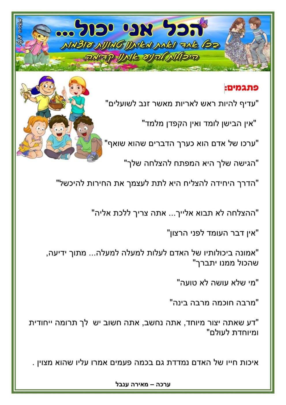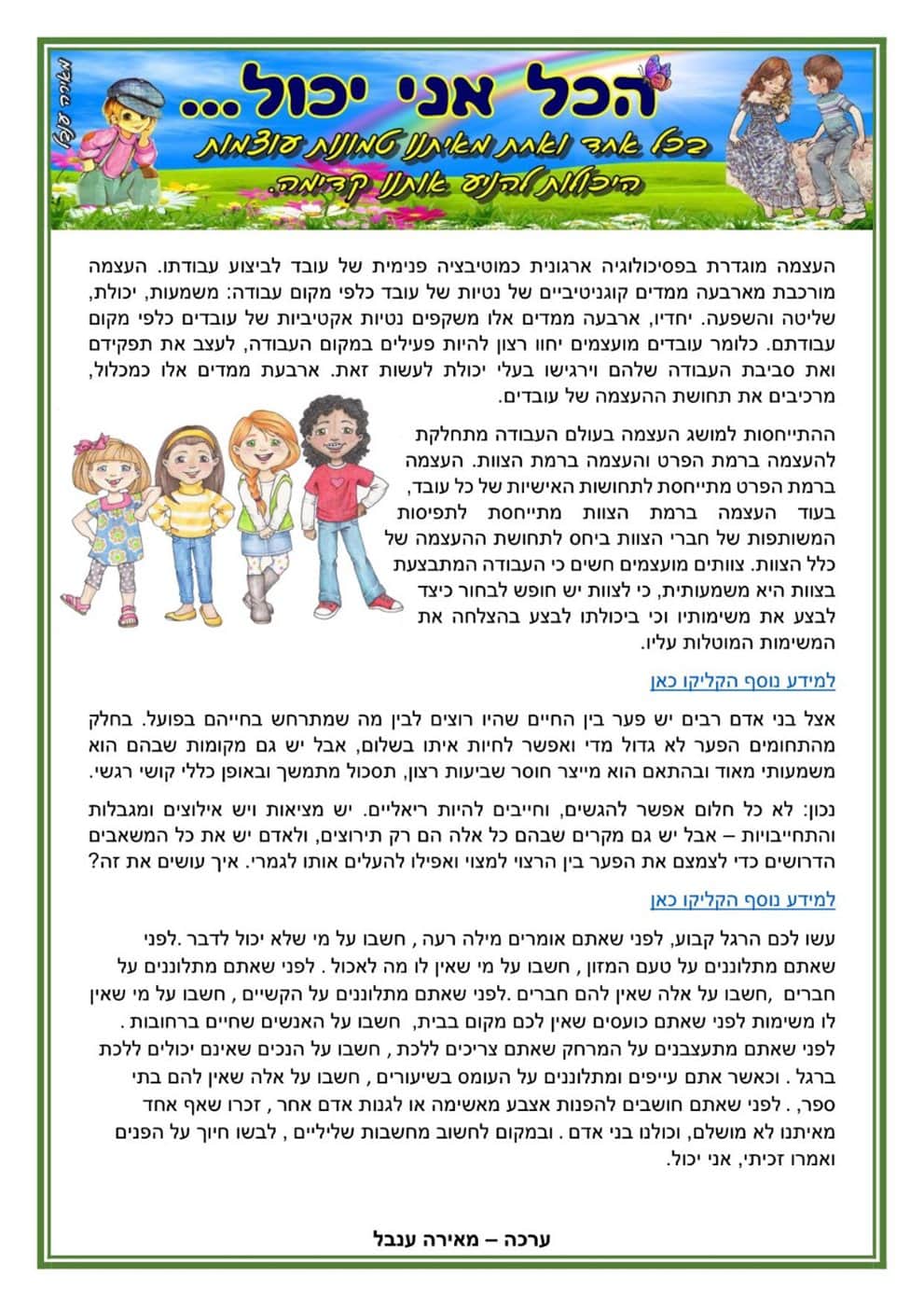 ![]() העצמה מוגדרת בפסיכולוגיה ארגונית כמוטיבציה פנימית של עובד לביצוע עבודתו. העצמה מורכבת מארבעה ממדים קוגניטיביים של נטיות של עובד כלפי מקום עבודה: משמעות, יכולת, שליטה והשפעה. יחדיו, ארבעה ממדים אלו משקפים נטיות אקטיביות של עובדים כלפי מקום עבודתם. כלומר עובדים מועצמים יחוו רצון להיות פעילים במקום העבודה, לעצב את תפקידם ואת סביבת העבודה שלהם וירגישו בעלי יכולת לעשות זאת. ארבעת ממדים אלו כמכלול, מרכיבים את תחושת ההעצמה של עובדים ההתייחסות למושג העצמה בעולם העבודה מתחלקת להעצמה ברמת הפרט והעצמה ברמת הצוות. העצמה ברמת הפרט מתייחסת לתחושות האישיות של כל עובד, בעוד העצמה ברמת הצוות מתייחסת לתפיסות המשותפות של חברי הצוות ביחס לתחושת ההעצמה של כלל הצוות. צוותים מועצמים חשים כי העבודה המתבצעת בצוות היא משמעותית, כי לצוות יש חופש לבחור כיצד לבצע את משימותיו וכי ביכולתו לבצע בהצלחה את המשימות המוטלות עליו. אצל בני אדם רבים יש פער בין החיים שהיו רוצים לבין מה שמתרחש בחייהם בפועל. בחלק מהתחומים הפער לא גדול מדי ואפשר לחיות איתו בשלום, אבל יש גם מקומות שבהם הוא משמעותי מאוד ובהתאם הוא מייצר חוסר שביעות רצון, תסכול מתמשך ובאופן כללי קושי רגשי. נכון: לא כל חלום אפשר להגשים, וחייבים להיות ריאליים. יש מציאות ויש אילוצים ומגבלות והתחייבויות – אבל יש גם מקרים שבהם כל אלה הם רק תירוצים, ולאדם יש את כל המשאבים הדרושים כדי לצמצם את הפער בין הרצוי למצוי ואפילו להעלים אותו לגמרי. איך עושים את זה? עשו לכם הרגל קבוע, לפני שאתם אומרים מילה רעה, חשבו על מי שלא יכול לדבר. לפני שאתם מתלוננים על טעם המזון, חשבו על מי שאין לו מה לאכול. לפני שאתם מתלוננים על חברים , חשבו על אלה שאין להם חברים. לפני שאתם מתלוננים על הקשיים, חשבו על מי שאין לו משימות לפני שאתם כועסים שאין לכם מקום בבית, חשבו על האנשים שחיים ברחובות. לפני שאתם מתעצבנים על המרחק שאתם צריכים ללכת, חשבו על הנכים שאינם יכולים ללכת ברגל. וכאשר אתם עייפים ומתלוננים על העומס בשיעורים, חשבו על אלה שאין להם בתי ספר, . לפני שאתם חושבים להפנות אצבע מאשימה או לגנות אדם אחר, זכרו שאף אחד מאיתנו לא מושלם, וכולנו בני אדם . ובמקום לחשוב מחשבות שליליים , לבשו חיוך על הפנים ואמרו זכיתי, אני יכול.