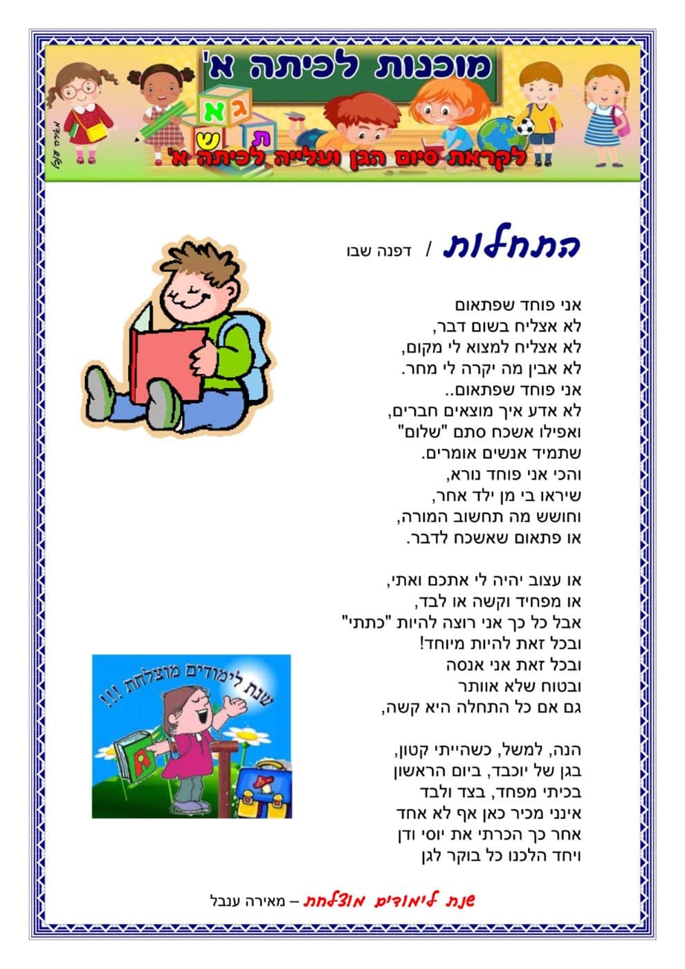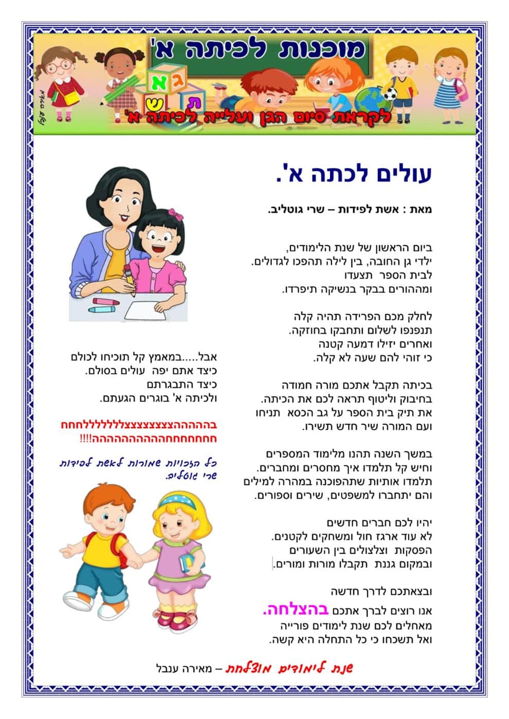 ![]() צרור עצות להורים לקראת כיתה א'` ד"ר נתן לב הייתם מאמינים ?הוא רק זחל והתחיל ללכת והנה עוד שבוע-שבועיים ילדי עולה לכיתה א? נכון שקשה להאמין? אכן, אם נבדוק מי מתרגש יותר הילד או ההורה התשובה ודאי תכיל את החששות של ההורה לצד הפחדים של הילד. תערובת הרגשות שמציפה אותנו ואת ילדנו לקראת השנה הראשונה מעצימה את תחושת החרדה והבלבול אצל הילד. הסביבה החדשה והלא- מוכרת והמעבר מ-"הכי גדול" בגן ל-"הכי קטן" בכיתה א` גורמים לעיתים לתופעות של חרדה, מתח ועצבנות לא מעטים אצל התלמידים הצעירים. רופאי האגודה האמריקאית לרפואת ילדים (AAP) מגישים צרור עצות מועילות כדי שכולנו "נחזור הביתה בשלום" מהיום הראשון: