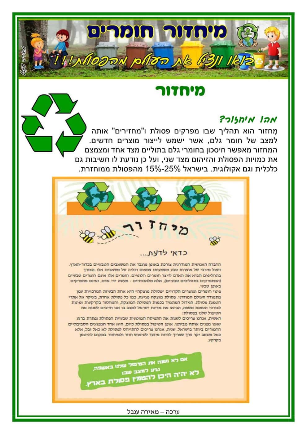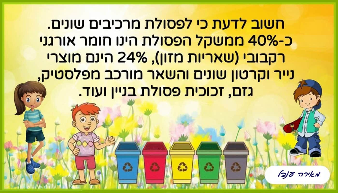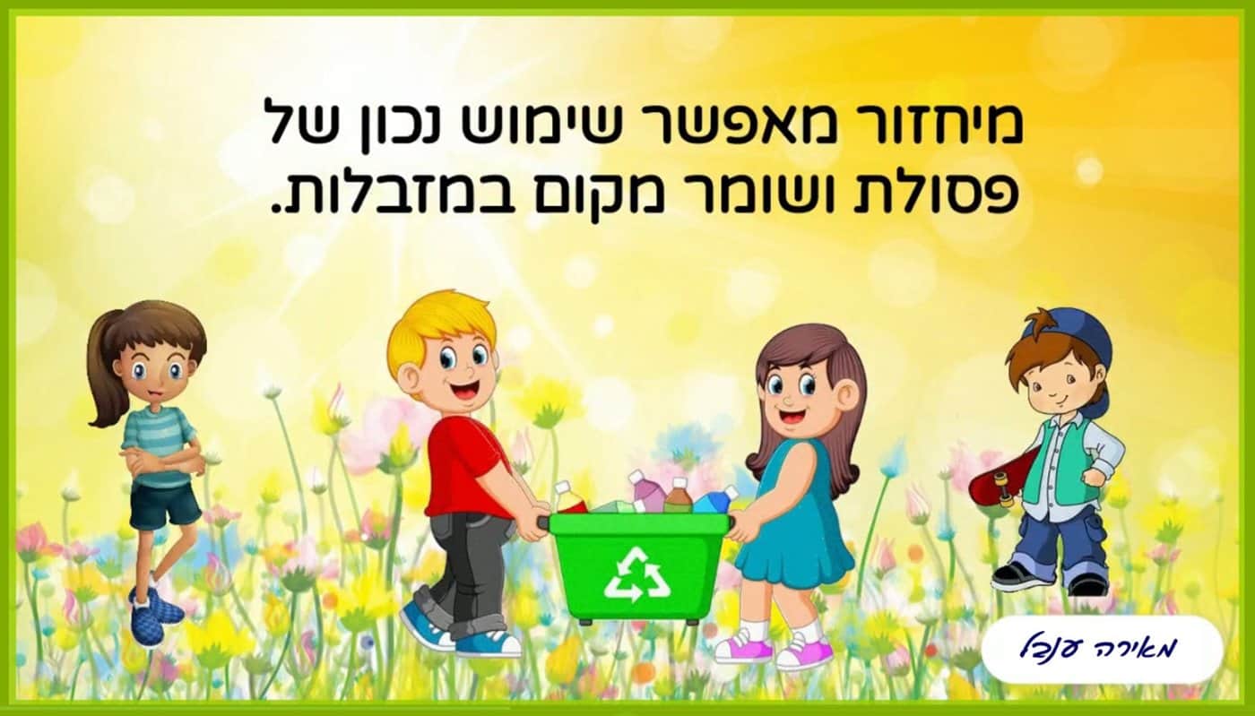 לרובינו הפסולת מפריעה, רק שהיא מצטברת בפחי האשפה ואיננה מפונה, אך לא כולם יודעים שמדובר בגורם המסכן את כולנו. בכל שנה, אנחנו, תושבי ישראל, מייצרים כ-5 מיליון טון של פסולת, כאשר הגידול בייצור הפסולת נמצא במגמת עלייה מתמדת. הפסולת מועברת למטמנות וגורמת לזיהום מי התהום והקרקע, לפגיעה בבעלי החיים ולנזקים אקולוגיים גדולים. עכשיו, נשאלת השאלה מה כל אחד מאתנו יכול לעשות בכדי למנוע את המצבים הללו והתשובה טמונה במילה מיחזור לצד 2 מילים נוספות, הפחתה ושימוש חוזר.