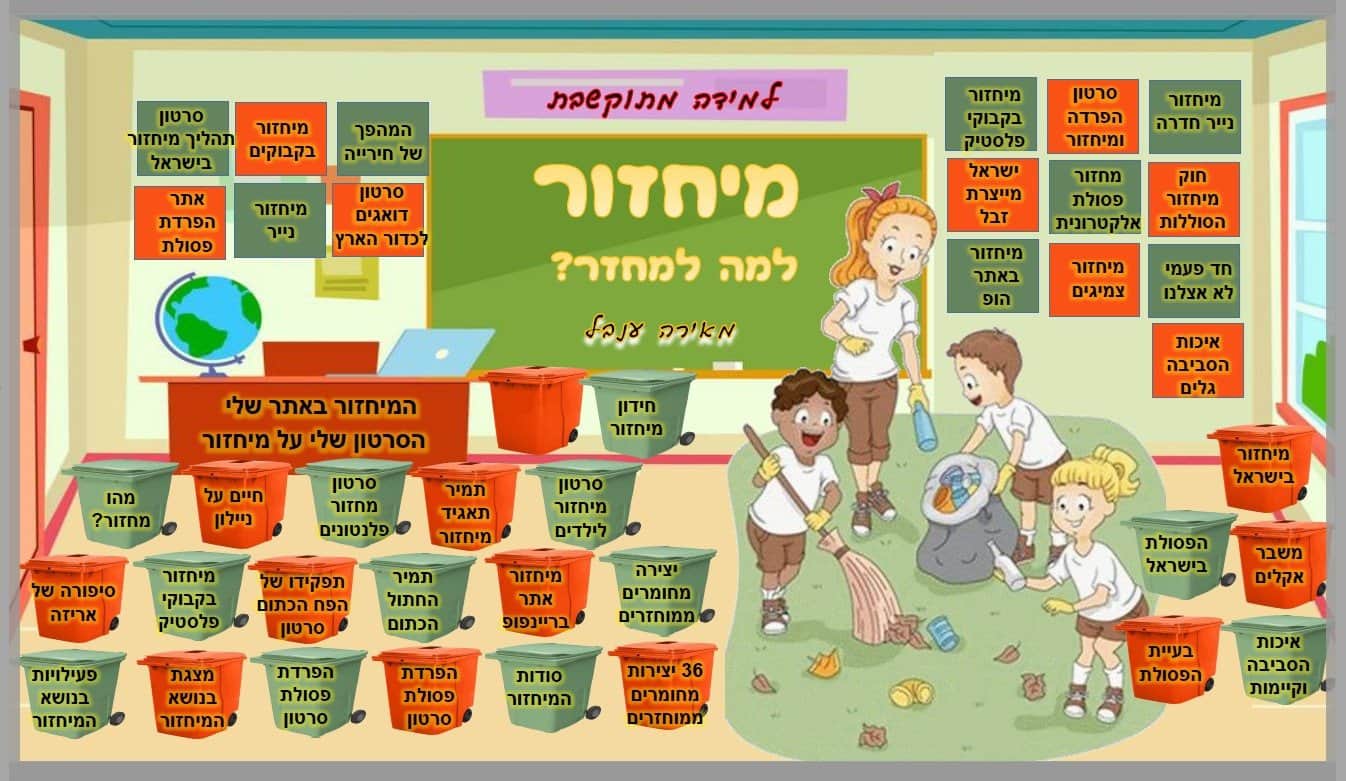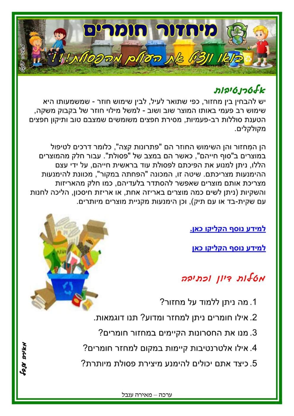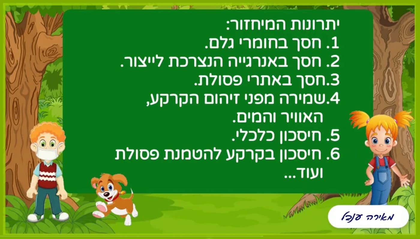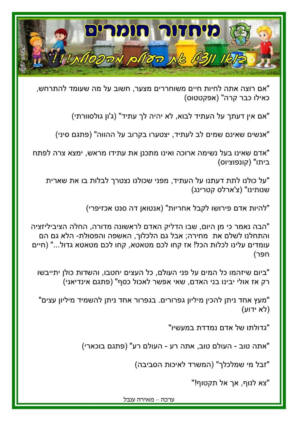 לרובינו הפסולת מפריעה, רק שהיא מצטברת בפחי האשפה ואיננה מפונה, אך לא כולם יודעים שמדובר בגורם המסכן את כולנו. בכל שנה, אנחנו, תושבי ישראל, מייצרים כ-5 מיליון טון של פסולת, כאשר הגידול בייצור הפסולת נמצא במגמת עלייה מתמדת. הפסולת מועברת למטמנות וגורמת לזיהום מי התהום והקרקע, לפגיעה בבעלי החיים ולנזקים אקולוגיים גדולים. עכשיו, נשאלת השאלה מה כל אחד מאתנו יכול לעשות בכדי למנוע את המצבים הללו והתשובה טמונה במילה מיחזור לצד 2 מילים נוספות, הפחתה ושימוש חוזר.