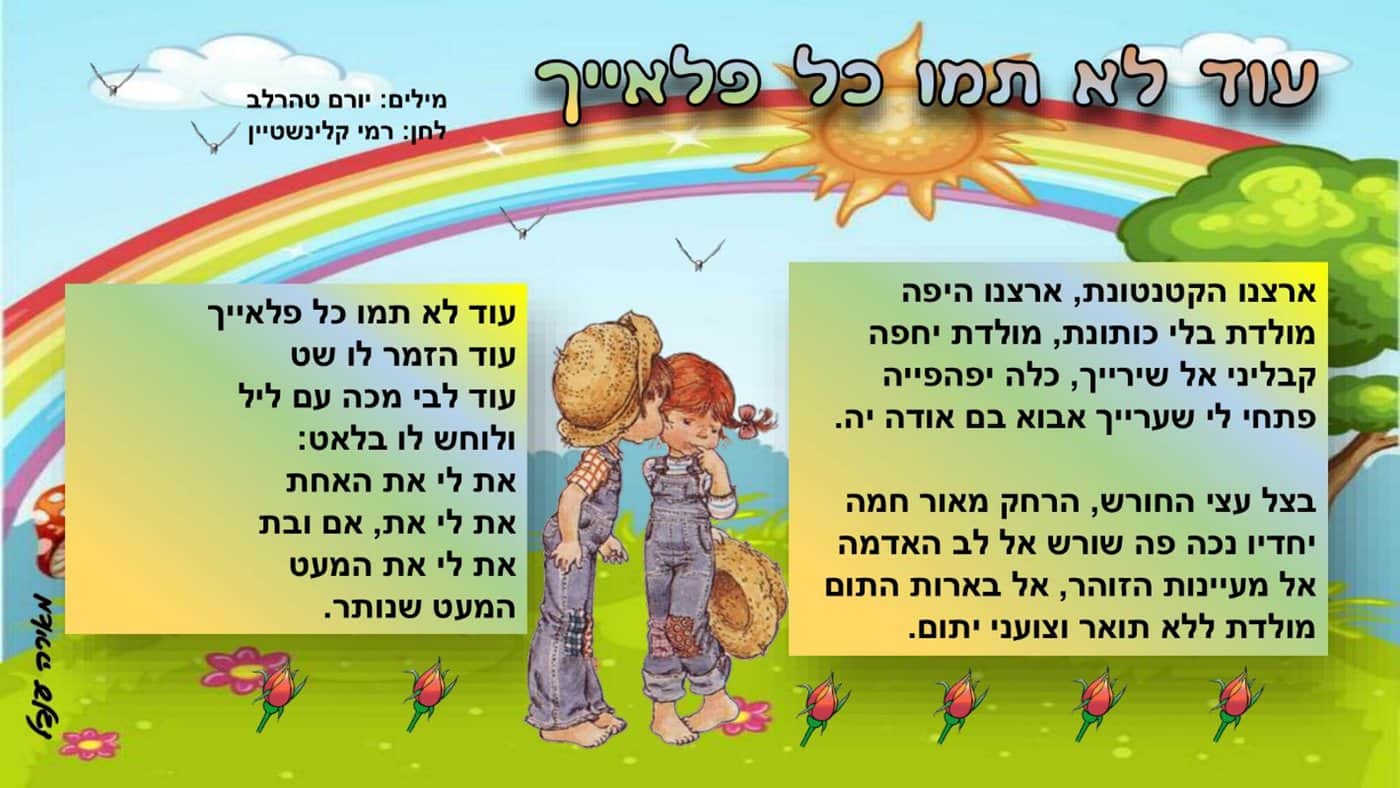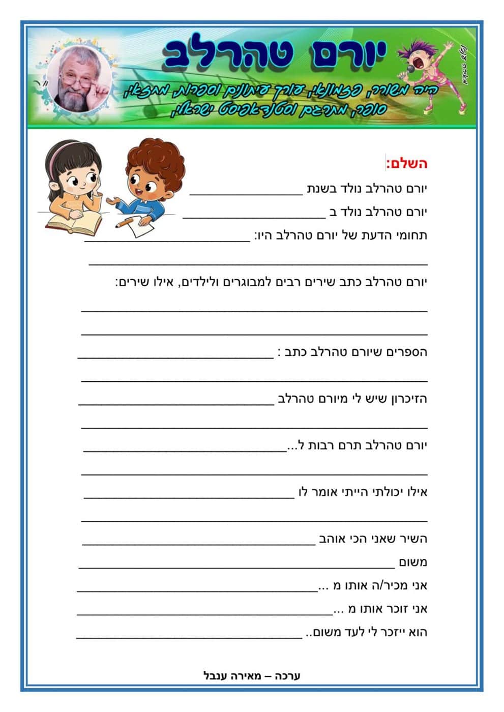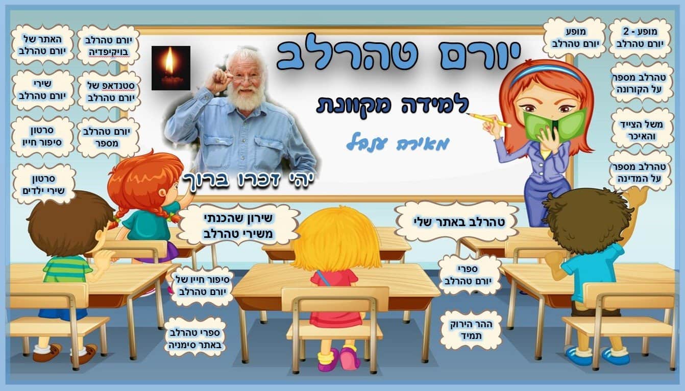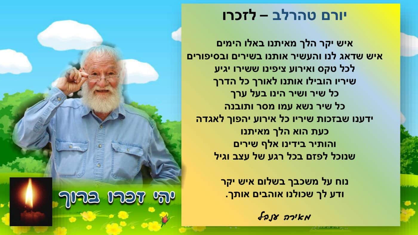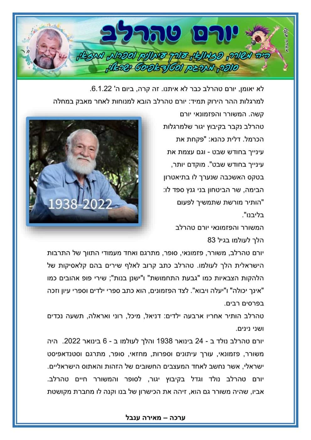 ![]() לא יאומן, יורם טהרלב כבר לא איתנו. זה קרה, ביום ה' 6.1.22. למרגלות ההר הירוק תמיד: יורם טהרלב הובא למנוחות לאחר מאבק במחלה קשה. המשורר והפזמונאי יורם טהרלב נקבר בקיבוץ יגור שלמרגלות הכרמל. דלית כהנא: "פקחת את עינייך בחודש שבט - וגם עצמת את עינייך בחודש שבט". מוקדם יותר, בטקס האשכבה שנערך לו בתיאטרון הבימה, שר הביטחון בני גנץ ספד לו: "הותיר מורשת שתמשיך לפעום בליבנו". המשורר והפזמונאי יורם טהרלב הלך לעולמו בגיל 83 ממחלה קשה. יורם טהרלב, משורר, פזמונאי, סופר, מתרגם ואחד מעמודי התווך של התרבות הישראלית הלך לעולמו. טהרלב כתב קרוב לאלף שירים בהם קלאסיקות של הלהקות הצבאיות כמו "גבעת התחמושת" ו"ישנן בנות"; שירי פופ אהובים כמו "אינך יכולה" ו"יעלה ויבוא". לצד הפזמונים, הוא כתב ספרי ילדים וספרי עיון וזכה בפרסים רבים. טהרלב הותיר אחריו ארבעה ילדים: דניאל, מיכל, רוני ואראלה, תשעה נכדים ושני נינים. יורם טהרלב נולד ב - 24 בינואר 1938 והלך לעולמו ב - 6 בינואר 2022. היה משורר, פזמונאי, עורך עיתונים וספרות, מחזאי, סופר, מתרגם וסטנדאפיסט ישראלי, אשר נחשב לאחד המעצבים החשובים של הזהות והאתוס הישראליים. יורם טהרלב נולד וגדל בקיבוץ יגור, לסופר והמשורר חיים טהרלב. בעת שירותו הצבאי שימש כתב בעיתון "במחנה גדנ"ע" ולאחר מכן שימש כעורך עיתון ו"במחנה נח"ל". במשך שנים רבות עבד כעורך בהוצאה לאור של משרד הביטחון. במאה ה-21 הרבה להופיע בפני קהל בסיפורים ובשירים מפרי עטו בלוויית זמרות וזמרים, בתוכניות כמו "וטהר ליבנו" ו"קום והתהלך בארץ". למשל בעת מגפת הקורונה, המשיך טהרלב לפרסם סיפורים ושירים פרי עטו עם פן הומוריסטי, כדוגמה, פואמה לכנרת. טהרלב תיחזק אתר אינטרנט, בו ניתן לעיין במבחר גדול משיריו וספריו, ולהתעדכן בהופעותיו הקרובות. בנוסף פורסמו בו מדריכים לכתיבת שירים, מקאמות, ועוד. ב-1996 זכה טהרלב בפרס אקו"ם על יצירתו וב-2006 זכה בפרס תמו"ז. הוא קיבל אותות הוקרה וכן פרסים ממשרד החינוך והתרבות. בעבר נמתחה ביקורת על כך שפרס ישראל לא הוענק לו, למרות שורה ארוכה של ממליצים. על כך הוא הגיב בזהירות: "פרופסור לכימיה שמקבל את פרס ישראל נגאל מאלמוניותו, פתאום הציבור מכיר את שמו. זה לא חל עליי. פרס ישראל לא יתרום דבר לחשיפת היצירה שלי". שירים נבחרים יואל משה סלומון עם כנפיים - פסל ברחוב חיים עוזר במרכז פתח תקווה, בעקבות השיר "הבלדה על יואל משה סלומון" השיר "גבעת התחמושת" בלחנו של רוזנבלום הוא בין השירים שהשאירו את רישומם בזכות תיאורו האותנטי של הקרב על גבעת התחמושת במלחמת ששת הימים. "היֵה לי חבר היֵה לי אח" בלחנו של רוזנבלום הוא שיר על אחוות לוחמים והשיר "הבלדה על יואל משה סלומון" בלחנו של חנוך ובביצוע אריק איינשטיין, שמתחיל במילים "בבוקר לח בשנת תרל"ח", הוא תיאור אפיזודה בהיסטוריה של ארץ-ישראל (ייסוד פתח תקווה). השיר "על כפיו יביא" בלחנו של רוזנבלום ובביצועה של רבקה זהר, נכתב על סמך מפגש עם נגר מובטל באחת משכונות העוני בארץ, היושב מיואש בבית מלאכתו השומם, וכולו כמיהה לבנות כיסא לאליהו הנביא שיבוא ויגאל אותו מצרותיו. שירי ילדים טהרלב כתב גם שירי ילדים רבים, בהם שירים לפסטיבל שירי ילדים כמו "המשפחה שלי" בביצוע שלמה ניצן, "ברבאבא" ו"מר אפצ'י" בביצוע ציפי שביט, "לא נעצור" ו"שובי הרמוניקה" בביצוע ירדנה ארזי, "דונלד דק" בביצוע מייק בורשטיין, ו"מי המנטה מי המסטיק מי השוקולד" בביצוע שוקולד מנטה מסטיק. את השיר "הדרך אל הכפר" כתב לרבקה זהר על סמך סיפור חייה, מילדותה ועד שובה ארצה לאחר התנסות קשה עם סמים בארצות הברית. את השיר הלחינה נורית הירש לפסטיגל 1985 והוא זכה בביצועה של זוהר במקום הראשון. שנה לאחר מכן כתבו טהרלב והירש את השיר "חלקת אלוהים", שהושר על ידי זוהר בפסטיגל 1986 וזכה גם הוא במקום הראשון. בין השירים הנוספים של טהרלב שבוצעו במסגרת הפסטיגל ניתן למנות את "הדגל שלי" (עדנה לב), ועוד... הקליקו על התמונה או על הקישור לפתיחת הקובץ https://drive.google.com/file/d/1F8rlGLPuaQe4RW11TGrrj_Wscrc_1gan/view?usp=sharing |