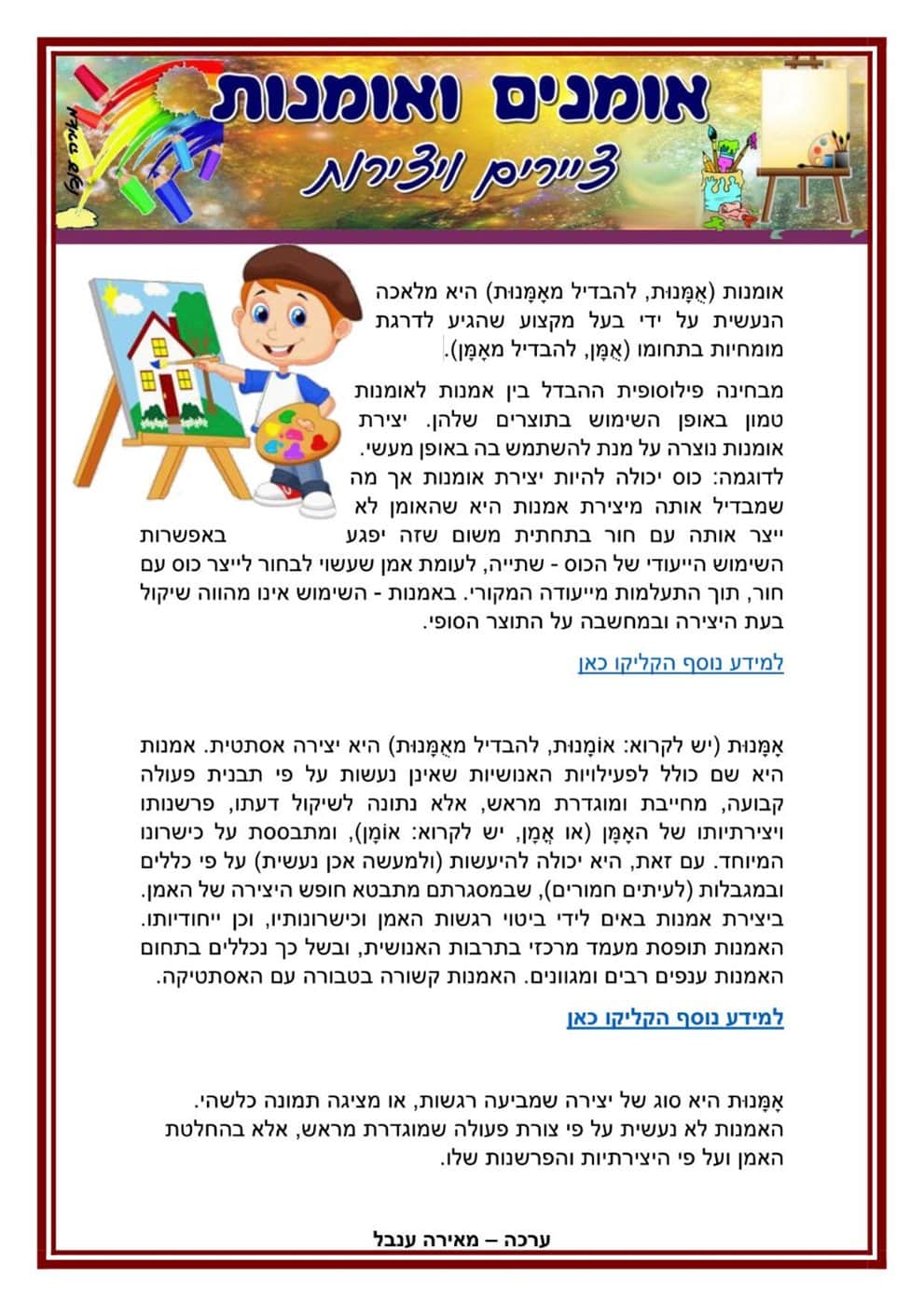 לאמנות יש שורשים מאז ימי האדם הקדמון, כשצייר את ציורי המערות של העידן הפרהיסטורי ויצר פסלים זעירים של אלילות (הם נקראים כיום "ונוסים"). עד לפני כמאה שנה תפקיד האמנות היה בעיקר חברתי או דתי. עד אז כמעט ולא נוצרה אמנות לשמה, אמנות למען אמנות, למען היופי או ככלי לביטוי אישי המנותק מתפקידים אחרים. אמנות כיום נוצרת בתחומים שונים, כולל ציור, מוסיקה, צילום, פיסול, קולנוע ועוד. יש לה מקום חשוב בתרבות האנושית ומעמד מרכזי, בין השאר משום שהיא קשורה באסתטיקה ויופי והיא נוגעת ברגש האנושי. תולדות האמנות תחום זה דן בהיסטוריה של האמנות החזותית. למרות שהוא משיק בנקודות רבות לתחום הפילוסופיה והאסתטיקה, אין הגדרת טבעה של "האמנות" תחום העיסוק המרכזי שלו. התחום של תולדות האמנות מנסה לסווג שינויים ותקופות באמנות במשך הזמן וכן להבין טוב יותר כיצד האמנות מעצבת ומעוצבת על ידי החברה והתרבות. לשם ניתוח האמנות בתקופותיה השונות, ומתוך ההנחה כי תהליכי היצירה של אמן הם תהליכים בעלי סטרוקטורה הניתנת לתיאור או ניתוח פרשני, משתמשים ההיסטוריונים בכלים השאובים מתחומי מחקר שונים כגון איקונוגרפיה, היסטוריה, סוציולוגיה, פסיכולוגיה ופסיכואנליזה, פילוסופיה, ארכאולוגיה ועוד. על פי רוב, נהוג לייחס לתחום זה בעיקר את תולדות האמנות האירופית. עם זאת, ישנם היסטוריונים של האמנות החוקרים אמנות שאינה אירופית, כגון אמנויות המזרח הרחוק, אמנות אפריקאית ועוד. לפתיחת קובץ PDF הקליקו על הדף או על הקישור https://drive.google.com/file/d/14Q-TAqK1soxb-YozXNOp8iSZ1lE3TXGQ/view?usp=sharing |