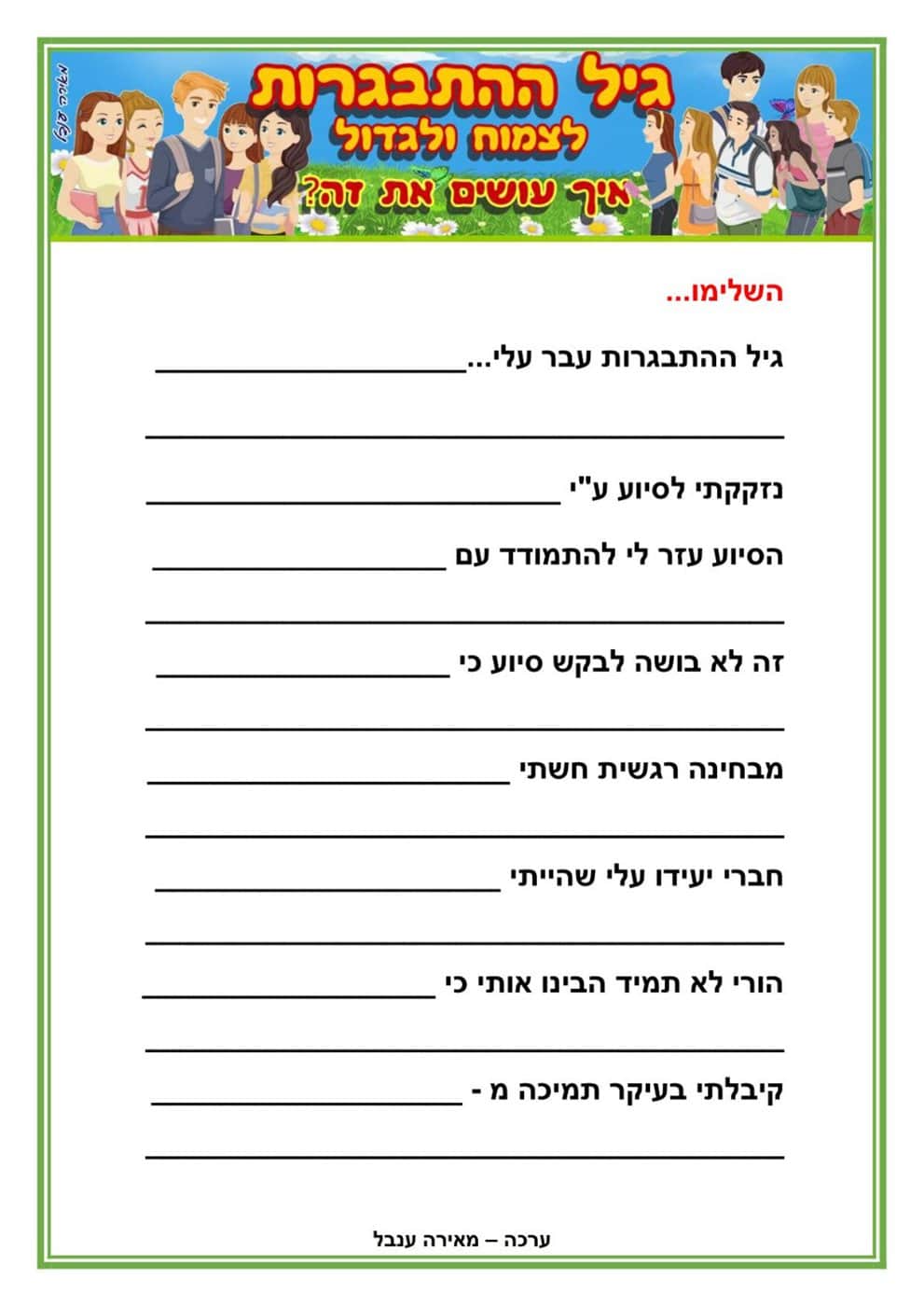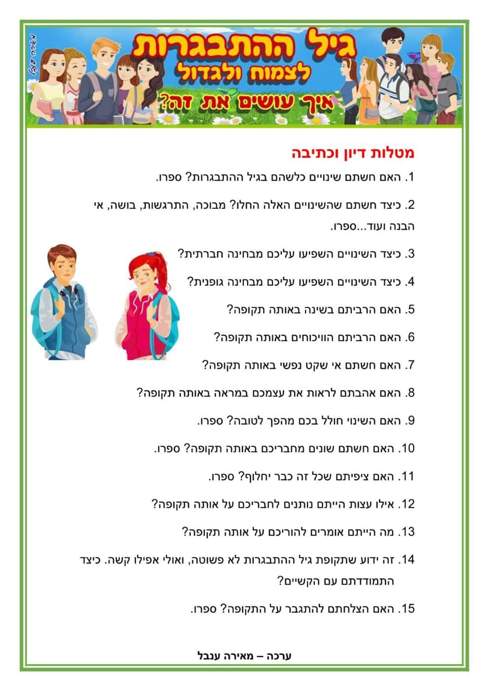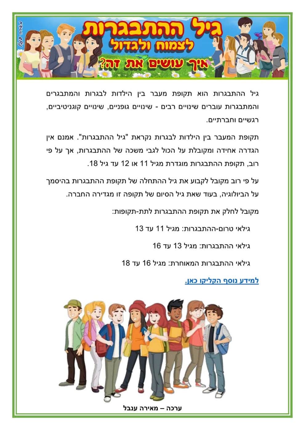 שינויים גופניים: כל אחד וכל אחת גדלים ומתפתחים בזמן שלהם ובקצב שלהם. שינויים קוגניטיביים: · מעבר מחשיבה קונקרטית לחשיבה מופשטת. · היכולת לחשוב על אפשרויות שונות. · חשיבה המבוססת על השערות. · חשיבה מראש. · היכולת לחשוב על המחשבות שלו/ה. · חשיבה מעבר לגבולות הזמן. · נטייה לקראת מודעות עצמית והכוונה עצמית. שינויים רגשיים: · גיבוש הזהות האישית – להבין מי אני ומה אני אוהב/ת, מה מעניין אותי, מה הדעות והמחשבות שלי. · רכישת עצמאות. · שינויים במצבי רוח. שינויים חברתיים: · הקשרים החברתיים הופכים להיות משמעותיים בחיי המתבגרים והם מקדישים זמן רב יותר לחברים. · בניית קשר משמעותי עם חבר / חברה. · קבוצת הגיל כגורם משמעותי בחיי המתבגר/ת המשפיע באופן משמעותי על רגשותיו והדימוי העצמי שלו. · חשוב לשמור על האני הפנימי שלנו ולזכור ש"לחץ חברתי לא מנצח אותי". שינויים חברתיים המתבגר מחפש זהות משלו: אנשים צעירים מנסים כל הזמן להבין מי הם ומה מקומם בעולם. החיפוש יכול להיות מושפע ממגדר, מקבוצת החברים, מרקע תרבותי ומציפיות משפחתיות, וכולל בתוכו זהות מינית, דתית, ערכית, פוליטית ועוד. המתבגר מבקש עצמאות רבה יותר: נטייה זו עשויה להיעשות בצורה ישירה או עקיפה, ועשויה להשפיע על ההחלטות שילדכם מקבל, ועל מערכות היחסים שלו עם משפחה וחברים המתבגר מבקש אחריות רבה יותר, בבית ובבית הספר מחפש חוויות חדשות: אופייה של התפתחות המוח אצל בני נוער מובילה לכך שהם מחפשים חוויות חדשות וריגושים, ולכן עלולים להתנהג בצורה מסוכנת יותר. עם זאת, הם עדיין מפתחים את יכולת השליטה בדחפים המתבגר חושב יותר על “נכון” ו”לא נכון”: התבגר מתחיל לפתח מערכת עצמאית חזקה יותר של ערכים ומוסר. בני נוער מגלים שהם אחראים לפעולות שלהם, להחלטותיהם ולתוצאות מעשיהם. הם מטילים ספק בדברים רבים יותר. המילים והמעשים שלכם מעצבים את האופן שבו ילדכם תופס את מה שנכון ולא נכון המתבגר מושפע יותר מחברים, בעיקר בכל הנוגע להתנהגות, לתחושת העצמי ולהערכה העצמית , המתבגר מתקשר בדרכים שונות: באמצעות האינטרנט, הטלפונים הסלולריים והרשתות החברתיות משפיעים מאוד על האופן שבו ילדכם מתקשר עם חבריו ולומד על העולם. שינויים רגשיים רבים חושבים שגיל הנעורים חייב להיות תקופה קשה, ושכל בני הנוער חווים מצבי רוח רעים ומתנהגים בדרכים מאתגרות. למעשה, רק חלק מבני הנוער עוברים סערה רגשית חריפה בגיל זה, מתחילים למרוד בהוריהם או נכנסים איתם לעימותים חמורים. שינויים חברתיים ורגשיים הם חלק חשוב במסעו של ילדכם לקראת הבגרות. תפקידכם בתהליך חשוב מאוד: לעזור לילדכם לפתח מיומנויות חברתיות ורגשיות של מבוגר. מסרים למתבגרים/מבגרות: · במקומות שאתם לא מרגישים בנוח - אל תהיו שם. · לעולם אל תעשו משהו שייתכן ותתחרטו עליו אחר כך. · אם קורה משהו - אנחנו פה בשבילך. צוות בית הספר נמצא פה עבורכם לכל שאלה או התייעצות. · חשוב לומר לא למה שלא עושה לכם טוב. · לומר "לא" זה למעשה לומר "כן" למה שנכון להם ולמי שהם. שינויים במערכת יחסים עם ההורים: מתחיל תהליך ההפרדות של המתבגר/ת מההורים , וזה לעיתים בא לידי ביטוי במרידה ועימותים עם ההורים על רקע המאבק של המתבגר/ת לעצמאות. הקליקו על התמונה או על הקישור להיכנס לקובץ https://drive.google.com/file/d/1RM2jcZht4fxEIs2cVYM-iWTvaJgy9ijo/view?usp=sharing