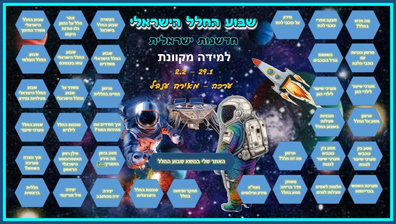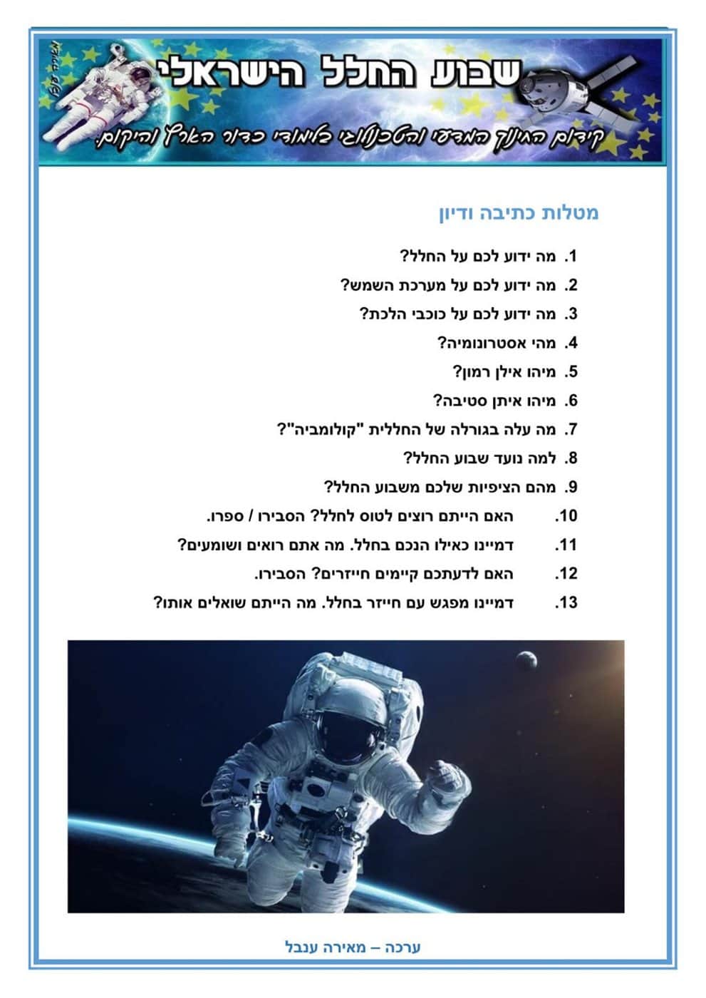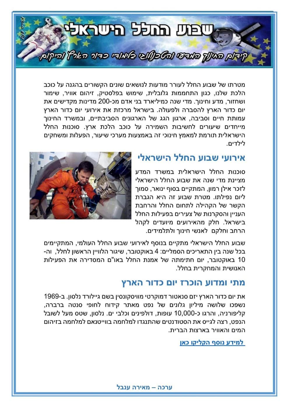 ![]() מטרתו של שבוע החלל לעורר מודעות לנושאים שונים הקשורים בהגנה על כוכב הלכת שלנו, כגון התחממות גלובלית, שימוש בפלסטיק, זיהום אוויר, שימור ושחזור, מדע וחינוך. מדי שנה כמיליארד בני אדם מכ-200 מדינות מקדישים את יום כדור הארץ להסברה ולפעולה. בישראל מרכזת את אירועי יום כדור הארץ עמותת חיים וסביבה, ארגון הגג של הארגונים הסביבתיים, ובמשרד החינוך מייחדים שיעורים לחשיבות השמירה על כוכב הלכת ארץ. סוכנות החלל הישראלית תורמת למאמץ חינוכי זה באמצעות מערכי שיעור, הפעלות ומשחקים לילדים. אירועי שבוע החלל הישראלי סוכנות החלל הישראלית במשרד המדע מציינת מדי שנה את שבוע החלל הישראלי לזכר אילן רמון, המתקיים בסוף ינואר, סמוך ליום נפילתו. מטרת שבוע זה היא הגברת הקשר של הקהילה לתחום החלל והרחבת העניין והסקרנות של צעירים בפעילות החלל בישראל. חלק מהאירועים מיועדים לקהל הרחב וחלקם לאנשי חינוך ולתלמידים. שבוע החלל הישראלי מתקיים בנוסף לאירועי שבוע החלל העולמי, המתקיימים בכל שנה בין התאריכים הסמליים: 4 באוקטובר, שיגור הלוויין הראשון לחלל, וה-10 באוקטובר, יום חתימתה של אמנת החלל באו"ם המסדירה את הפעילות האנושית והמחקרית בחלל. מתי ומדוע הוכרז יום כדור הארץ את יום כדור הארץ יזם סנאטור דמוקרטי מוויסקונסין בשם גיילורד נלסון. ב-1969 נשפכו שלושה מיליון גלונים של נפט מאתר קידוח לחופי סנטה ברברה, קליפורניה, והרגו כ-10,000 עופות, דולפינים וכלבי ים. נלסון, שטס מעל לשובל הנפט, רצה לגייס את הסטודנטים שהתנגדו למלחמה בווייטנאם למלחמה בזיהום המים והאוויר בארצות הברית. מהו החלל, מה קורה בו? כולם יודעים מהן טיסות לחלל, חלליות, חליפות חלל... אבל מהו בעצם החלל? איך מגדירים אותו? איפה הוא מתחיל? מה הוא כולל? יש הרבה דברים שעדיין איננו יודעים על החלל. ובכל זאת, אנחנו יודעים עליו לא מעט, באמצעות מדע האסטרונומיה, החוקר את ההתפתחות, התנועה והמבנה של גרמי השמיים והיקום בעיקר באמצעות ניתוח תצפיות. קוסמולוגים, למשל, חוקרים בין השאר את מבנה היקום ועל בסיס תצפיות מנסים לשער את עתידו. אסטרופיסיקאים מתמקדים בתכונות הפיסיות של גרמי שמיים שונים כמו כוכבים, כוכבי לכת, וענני גז וגם תופעות מוזרות כמו חורים שחורים וחומר אפל. מבחינתנו, יושבי כוכב הלכת ארץ, החלל הוא כל מה שנמצא מחוץ לאטמוספירה של כדור הארץ. נהוג להגדיר את הגבול הזה בגובה של 100 קילומטרים מעל פני הים. אבל מה יש בו, בחלל? החלל עצמו מוגדר כרִיק כמעט מוחלט, ואקום – או במילים אחרות, כלום. אנחנו נזהרים ואומרים רִיק כמעט מוחלט, כיוון שאסטרופיסיקאים המתמחים במכניקת הקוונטים, מעריכים שגם הוואקום מלא בחלקיקים המופיעים באותו "כלום" ונמוגים חליפין. סוכנות החלל הישראלית היא גוף ממשלתי שפועל במשרד המדע והטכנולוגיה. מטרתה להתוות תוכניות ודרכי פעולה לקידום המטרות הלאומיות האזרחיות של ישראל בתחום החלל, וכן לתאם בין הגופים השונים העוסקים בחקר החלל בישראל, לצרכים מדעיים ומסחריים.