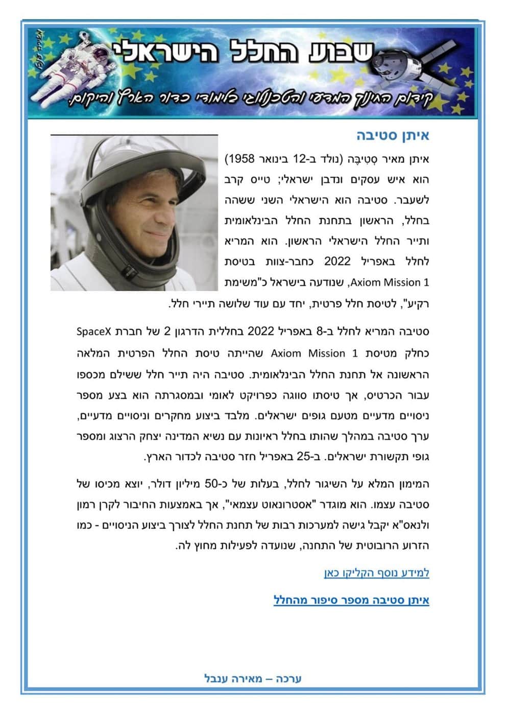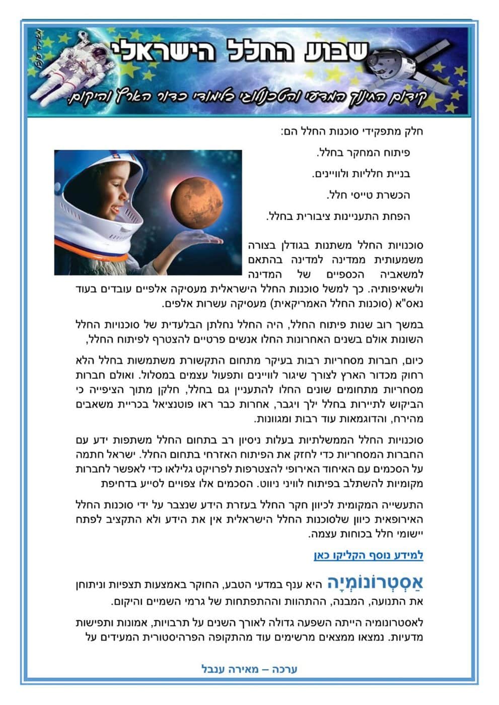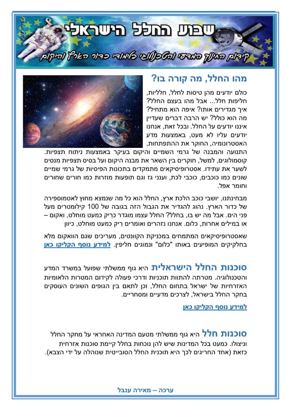 ![]() מטרתו של שבוע החלל לעורר מודעות לנושאים שונים הקשורים בהגנה על כוכב הלכת שלנו, כגון התחממות גלובלית, שימוש בפלסטיק, זיהום אוויר, שימור ושחזור, מדע וחינוך. מדי שנה כמיליארד בני אדם מכ-200 מדינות מקדישים את יום כדור הארץ להסברה ולפעולה. בישראל מרכזת את אירועי יום כדור הארץ עמותת חיים וסביבה, ארגון הגג של הארגונים הסביבתיים, ובמשרד החינוך מייחדים שיעורים לחשיבות השמירה על כוכב הלכת ארץ. סוכנות החלל הישראלית תורמת למאמץ חינוכי זה באמצעות מערכי שיעור, הפעלות ומשחקים לילדים. אירועי שבוע החלל הישראלי סוכנות החלל הישראלית במשרד המדע מציינת מדי שנה את שבוע החלל הישראלי לזכר אילן רמון, המתקיים בסוף ינואר, סמוך ליום נפילתו. מטרת שבוע זה היא הגברת הקשר של הקהילה לתחום החלל והרחבת העניין והסקרנות של צעירים בפעילות החלל בישראל. חלק מהאירועים מיועדים לקהל הרחב וחלקם לאנשי חינוך ולתלמידים. שבוע החלל הישראלי מתקיים בנוסף לאירועי שבוע החלל העולמי, המתקיימים בכל שנה בין התאריכים הסמליים: 4 באוקטובר, שיגור הלוויין הראשון לחלל, וה-10 באוקטובר, יום חתימתה של אמנת החלל באו"ם המסדירה את הפעילות האנושית והמחקרית בחלל. מתי ומדוע הוכרז יום כדור הארץ את יום כדור הארץ יזם סנאטור דמוקרטי מוויסקונסין בשם גיילורד נלסון. ב-1969 נשפכו שלושה מיליון גלונים של נפט מאתר קידוח לחופי סנטה ברברה, קליפורניה, והרגו כ-10,000 עופות, דולפינים וכלבי ים. נלסון, שטס מעל לשובל הנפט, רצה לגייס את הסטודנטים שהתנגדו למלחמה בווייטנאם למלחמה בזיהום המים והאוויר בארצות הברית. מהו החלל, מה קורה בו? כולם יודעים מהן טיסות לחלל, חלליות, חליפות חלל... אבל מהו בעצם החלל? איך מגדירים אותו? איפה הוא מתחיל? מה הוא כולל? יש הרבה דברים שעדיין איננו יודעים על החלל. ובכל זאת, אנחנו יודעים עליו לא מעט, באמצעות מדע האסטרונומיה, החוקר את ההתפתחות, התנועה והמבנה של גרמי השמיים והיקום בעיקר באמצעות ניתוח תצפיות. קוסמולוגים, למשל, חוקרים בין השאר את מבנה היקום ועל בסיס תצפיות מנסים לשער את עתידו. אסטרופיסיקאים מתמקדים בתכונות הפיסיות של גרמי שמיים שונים כמו כוכבים, כוכבי לכת, וענני גז וגם תופעות מוזרות כמו חורים שחורים וחומר אפל. מבחינתנו, יושבי כוכב הלכת ארץ, החלל הוא כל מה שנמצא מחוץ לאטמוספירה של כדור הארץ. נהוג להגדיר את הגבול הזה בגובה של 100 קילומטרים מעל פני הים. אבל מה יש בו, בחלל? החלל עצמו מוגדר כרִיק כמעט מוחלט, ואקום – או במילים אחרות, כלום. אנחנו נזהרים ואומרים רִיק כמעט מוחלט, כיוון שאסטרופיסיקאים המתמחים במכניקת הקוונטים, מעריכים שגם הוואקום מלא בחלקיקים המופיעים באותו "כלום" ונמוגים חליפין. סוכנות החלל הישראלית היא גוף ממשלתי שפועל במשרד המדע והטכנולוגיה. מטרתה להתוות תוכניות ודרכי פעולה לקידום המטרות הלאומיות האזרחיות של ישראל בתחום החלל, וכן לתאם בין הגופים השונים העוסקים בחקר החלל בישראל, לצרכים מדעיים ומסחריים.