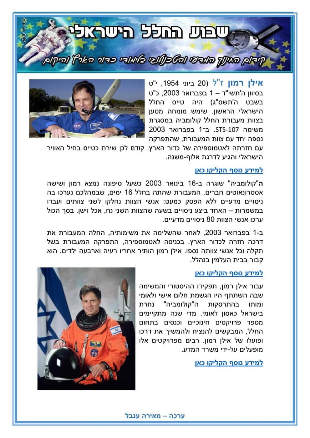 אילן רמון ז"ל (20 ביוני 1954, י"ט בסיוון ה'תשי"ד – 1 בפברואר 2003, כ"ט בשבט ה'תשס"ג) היה טייס החלל הישראלי הראשון. שימש מומחה מטען בצוות מעבורת החלל קולומביה במסגרת משימה STS-107. ב־1 בפברואר 2003 נספה יחד עם צוות המעבורת, שהתפרקה עם חזרתה לאטמוספירה של כדור הארץ. קודם לכן שירת כטייס בחיל האוויר הישראלי והגיע לדרגת אלוף-משנה. ה"קולומביה" שוגרה ב-16 בינואר 2003 כשעל סיפונה נמצא רמון ושישה אסטרונאוטים חברים. המעבורת שהתה בחלל 16 ימים, שבמהלכם נערכו בה ניסויים מדעיים ללא הפסק כמעט: אנשי הצוות נחלקו לשני צוותים ועבדו במשמרות – האחד ביצע ניסויים בשעה שהצוות השני נח, אכל וישן. בסך הכול ערכו אנשי הצוות 80 ניסויים מדעיים. ב-1 בפברואר 2003, לאחר שהשלימה את משימותיה, החלה המעבורת את דרכה חזרה לכדור הארץ. בכניסה לאטמוספירה, התפרקה המעבורת בשל תקלה וכל אנשי צוותה נספו. אילן רמון הותיר אחריו רעיה וארבעה ילדים. הוא קבור בבית העלמין בנהלל. עבור אילן רמון, תפקידו ההיסטורי והמשימה שבה השתתף היו הגשמת חלום אישי ולאומי ומותו בהתרסקות ה"קולומביה" נחרת בישראל כאסון לאומי. מדי שנה מתקיימים מספר פרויקטים חינוכיים וכנסים בתחום החלל, המבקשים להנציח ולהמשיך את דרכו ופועלו של אילן רמון. רבים מפרויקטים אלו מופעלים על-ידי משרד המדע.