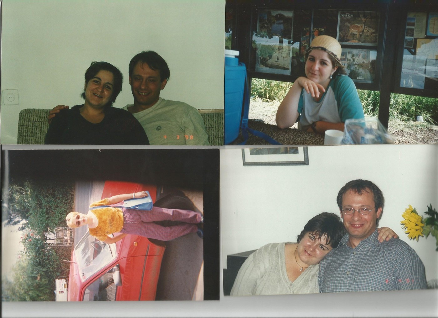 ![]() תמונה שמאלית למעלה: אני וויקי בביתנו ברחוב עובדיה 25 בחיפה חצי שנה לפני החתונה. תמונה ימנית למעטה: אני וויקי בביתם של חמי וחמותי . תמונה ימנית למעטה: לפני החתונה עשינו טיול במפל סער, ושם צולמה התמונה. תמונה שמאלית למעטה: ויקי לפני שהכרתי אותה. |