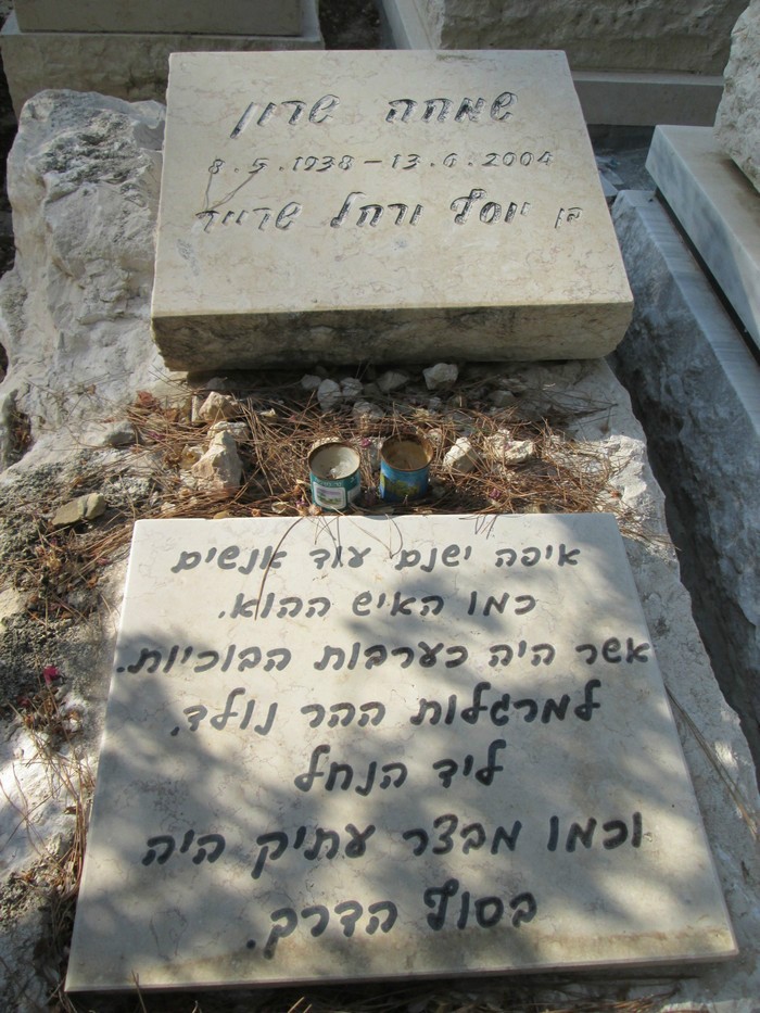 ![]() ![]() ![]() ![]() ![]() ![]() ![]() ![]() ![]() ![]() ![]() ![]() ![]() ![]() ![]() ![]() ![]() ![]() ![]() ![]() ![]() ![]() ![]() ![]() ![]() ![]() ![]() ![]() ![]() ![]() ![]() ![]() ![]() ![]() ![]() ![]() ![]() ![]() ![]() ![]() שמחה שרון ז"ל נולד ב-8/5/1938 בחיפה. בנם היחיד של יוסף ורחל שרייר. התחתן עם נעמי למשפחת בייליס אלטמן מתל-אביב, ונולד להם בן ב-7/9/1968 בשם אמיתי. לאחר גירושיו חי עם בת זוגתו מרגנית עד פטירתו ביוקנעם מושבה. לו ולמרגנית שלושה ילדים משותפים: גיל, עודד ורחל. בשנות השמונים היה מחנך בבית הספר הריאלי בחיפה. למיטב זכרוני לימד גם בבית ספר בכפר יהושע. נפטר ב-13/6/2004 לאחר ניתוח לב, שלא עלה יפה. התמונות שלו, שהגיעו אליי לאחר פטירתו מעידות שהייתה לו משיכה לתחום של האומנות והצילום, וכן שהייתה לו הצלחה בקרב בנות המין היפה. מכיוון שלא גדלתי אצלו, אין לי מידע רב עליו ועל אישיותו (הוא גם לא היה דברן גדול). במהלך ילדותי היו לי זכרונות יפים ממנו. לאחר מכן הקשר היה רופף מאוד. כיום כאבא לילדים בעצמי ומתוך נקודת מבט זו, קשה לי מאוד להבין זאת. עם זאת אני משלים עם כך שהוא היה שונה ממני בהקשר זה, ואני מכבד זאת. זה היה ,כנראה, בתקופה זו הדדי, ולכן זה גם נראה כך בסופו של דבר. זכורה לי חריפותו השכלית, אך מצד שני הוא קיבל בהבנה וכיבד את העובדה, שדיעותיי הפוליטיות שונות משלו לחלוטין משלו. שמר על נפש ילדותית, וזה דבר שגרם לקשר ביננו בתקופת ילדותי להיות מעניינים במיוחד, שכן הוא ניחן ביכולת להיכנס לעולם הדימיון של הילדים ולנפשם באמצעות גישה מרתקת של אדם/ הורה שמסתכל על הילד לא מלמעלה באופן פטרוני אלא בגובה העיניים. בהקשר זה הוא היה בהחלט אדם לא שגרתי. הספיק לראות את נכדיו אופק כשהיה בן שנה וחצי ויגל שהיה בן מספר חודשים בלבד. בספר הזכרון שלו רשמתי שת.נ.צ.ב.ה, פירושו שהאדם, שנפטר ממשיך לחיות, שכן נפשו ממשיכה להיות צרורה בצרור החיים באמצעות צאצאיו. כבן יחיד להורים, שרוב משפחתם נספתה בשואה בפולין, יש להמשכיות זו חשיבות רבה. להלן דברים שנכתבו באתר חברה ע"י שמחה שרון ז"ל כתגובה לאנונימית באשר ליחס לביה"ס הריאלי, שבו הוא חינך וכן דברים שנכתבו ע"י שניים מתלמידיו בנושא. רפרוף מקרי בתגובות הנוראיות (לא אלה שהבאתי) המופיעות בפורום הזה בכללותו בשלל הנושאים השונים (רובם לגופו של אדם) מלמד עד כמה נכשל בית הספר כישלון נחרץ לחנך את חלק מתלמידיו לדרך ארץ ולדיבור ענייני ולא פוגעני. קשה להאמין שאלה הם בוגריו של בית הספר, שמסתתרים כפחדנים ומוגי לב תחת המחבוא של האנונומיות. זה מחירה של הרדיפה אחר ההשיגיות בכל מחיר ללא הקניית בסיס ערכי מוצק. כולי תקווה שבית הספר הפיק לקחים מהדברים השערוריתיים הכתובים כאן. אם כך מתנהגים בוגרי בית הספר, אז כיצד זה נבוא בטענות אל אזובי הקיר? א. נכון שאין אופציה להכניס שם אך אפשר לחתום, לדוגמא חתימתי, ב, תמיד אפשר לחפש את השלילי שבביה"ס ובחיים בכלל, ויש הרבה כזה אך זה לא מקדם אותנו אם אנו מתעסקים בשלילי, לעומת זאת אם נתעסק בחיובי נוכל להתקדם, ואולי באותה הזדמנות גם לתקן את השלילי, ג,כבוגר אני יכול להעיד על הרבה מאוד חיובי שהיה בביה"ס, וגם כמורה אני מעריך שתלמידים שלי חוו את החיובי, גם בזכותי, כולל בקשרים שהיו להם איתי, ד,בסופו של דבר אף אחד לא מכריח תלמיד שאינו מרוצה להישאר בביה"ס, ה,בדבר אחד ביה"ס לא הצליח לגבי חלק מתלמידיו, לחנך אותם לא לזרוק אבנים לבאר ששתו ממנה, ו,למי שזה מעניין אותו, אני בשמי המלא, שמחה שרון (מאתר ח'ברה 2/3/02) באשר לביה"ס ריאלי בחיפה. שמחה שרון הוא אחד המורים והמחנכים הנפלאים בארץ. בקונטקסט של הפורום הזה מן הראוי גם לצין שהוא מזן המורים שהנהלת בית הספר השכילה לגייס ולשמור, עבורנו התלמידים. עד היום אני נושא איתי את העצמאות המחשבתית שהוא טיפח אצלנו בכיתה ט' לפני כשלושים שנה. מאתר ח'ברה (6/3/02). שמחה שרון. אתה אותו שמחה שרון על האפנוע עם הסירה שהיה ראש שבט משוטטים? אם כן ואם לא, קל מאד להצליח ולקחת אחריות בלעדית (אז למה להודות לריאלי) קל מאד להכשל ולהעביר אחריות לזולת (אז בודאי הריאלי מושמץ) לפעמ