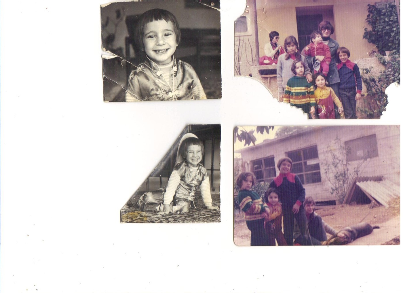 ![]() בתמונות הימניות: הן צולמו בבית שערים בביתם של עדה ואהרון רובין (אמו ואביו של אבי הלא ביולוגי, דוד). בתמונה העליונה מימין: אני, אימי שמחזיקה בידה את אחותי, מרב ואחי, עופר. בתמונה מופיעות הבנות של חברתה של אימי, נעמי גוליק. |