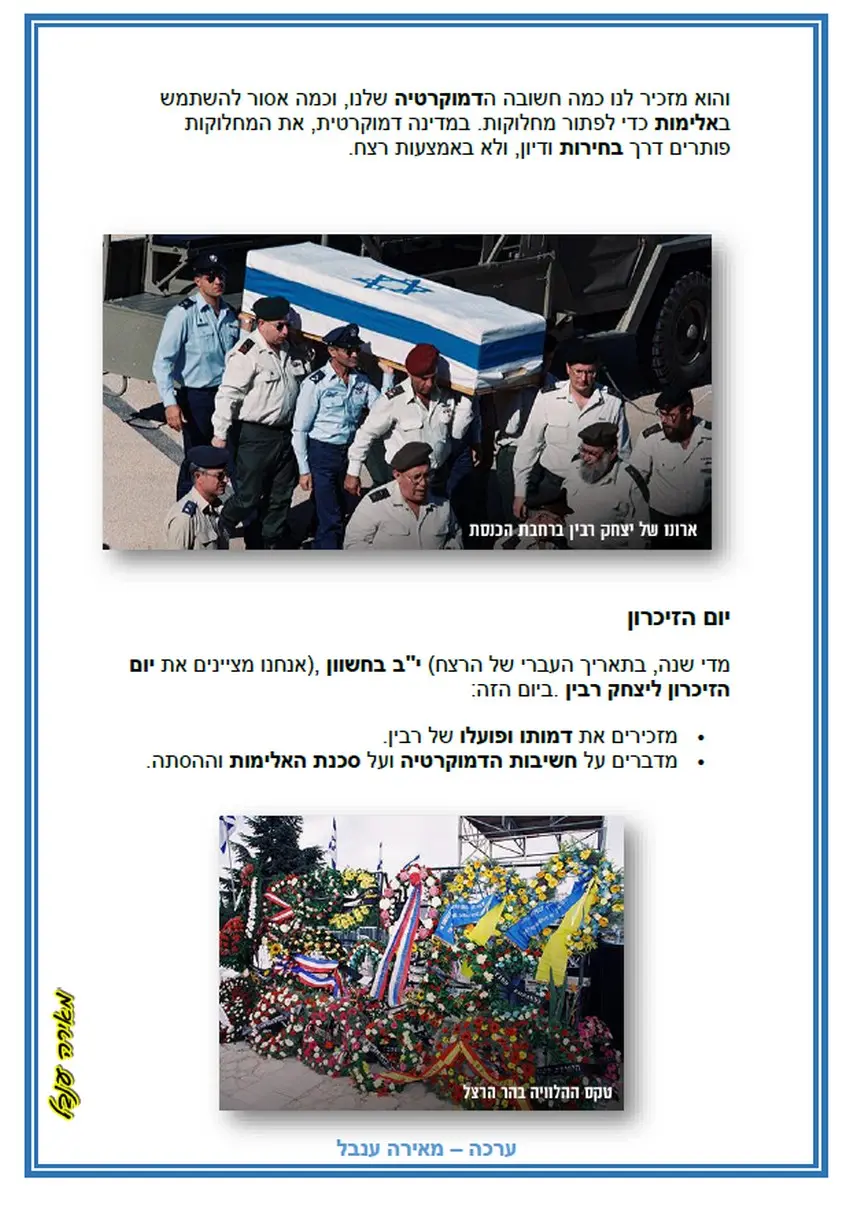 ![]() | ![]() יום הזיכרון למנהיגנו היקר , ראש ממשלת ישראל, יצחק רבין ז"ל שנרצח בנסותו להשכין שלום אמת ב – 4.11.1995 . בשל דעותיו הפוליטיות שלא היו מקובלות על כולם, עלינו לשוב להדגיש ולחשוב את החובה לכבד את חוקי מדינת ישראל, את העובדה כי הדרך היחידה לקבלת הכרעות בחברה היא הדרך הדמוקרטית. הדמוקרטיה מאפשרת לכל אזרח להראות ולהשמיע את דבריו תוך סובלנות והסכמה רחבה על כללי המשחק. מותר ואפשר לחלוק, אפשר לא לקבל אבל חלילה לא לפגוע לרעה. אדם באמונתו יחיה וחובה עלינו לכבד דעותיהם של האחרים ואופן התנהגותם, דיבורם, צורתם והליכותיהם. כי אנחנו חיים בחברה דמוקרטית . ההתנקשות בחייו של יצחק רבין סיימה בצורה טרגית את חייו של אדם, כשנרצח יצחק רבין חשו רבים מאזרחי ישראל כאילו מת אביהם הפרטי, בגלל אהבתם הגדולה אליו, ובגלל אישיותו המיוחדת, האבהית... כל אלו יחד עם תפקידו כראש הממשלה מוביל תהליך השלום חברו יחד לתחושה שאבד לנו מנהיג מיוחד, אבא, לכל אחד באופן פרטי ולכולנו יחד.