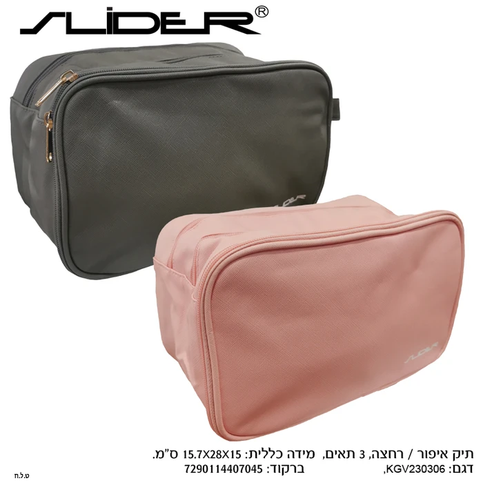 תיאור מפורט: תיק איפור/רחצה איכותי עם 3 תאים נפרדים לארגון מיטבי. מגיע בשני צבעים אטרקטיביים - אפור כהה וורוד עתיק. התיק בנוי מחומר עמיד למים עם רוכסנים איכותיים ופרטי מתכת זהובים. מושלם לנסיעות, לארגון מוצרי איפור או כתיק רחצה. עיצוב מודרני ופרקטי המאפשר אחסון נוח של מוצרי טיפוח ואיפור.