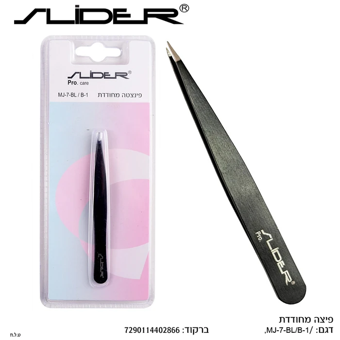 תיאור מפורט: פינצטה מקצועית עשויה מתכת איכותית בצבע שחור עם קצה מחודד מאוד. הפינצטה ארוזה באריזת בליסטר שקופה עם רקע ורוד-לבן.