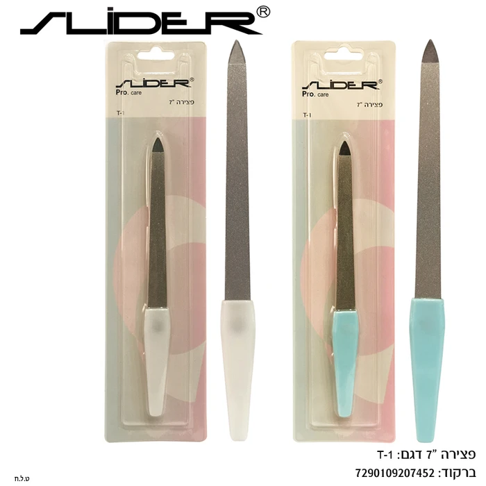 תיאור מפורט: פצירה איכותית באורך 7 אינץ' עם ידית פלסטיק נוחה לאחיזה. המוצר זמין בשני צבעים - לבן וכחול בהיר. הפצירה עשויה מתכת איכותית עם משטח מחוספס לעיצוב וליטוש ציפורניים. המוצר ארוז באריזת בליסטר שקופה עם רקע ורוד-לבן.