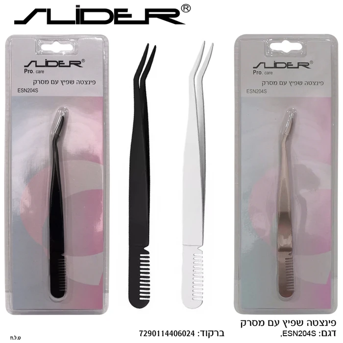 תיאור מפורט: פינצטה איכותית עם קצה עקום וכוללת מסרק בקצה השני. המוצר זמין בשני צבעים - שחור ולבן. הפינצטה מיועדת לעיצוב גבות ומריטת שערות, והמסרק מותאם לטיפוח וסירוק גבות וריסים. המוצר ארוז באריזת בליסטר שקופה עם רקע ורוד-לבן.