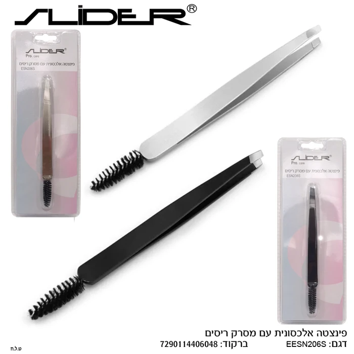 תיאור מפורט: פינצטה איכותית עם קצה אלכסוני וכולל מסרק ריסים בקצה השני. המוצר זמין בשני צבעים - לבן וחשור. הפינצטה מיועדת לעיצוב גבות ומריטת שערות, והמסרק מותאם לטיפוח ריסים וגבות. המוצר ארוז באריזת בליסטר שקופה עם רקע ורוד-לבן.