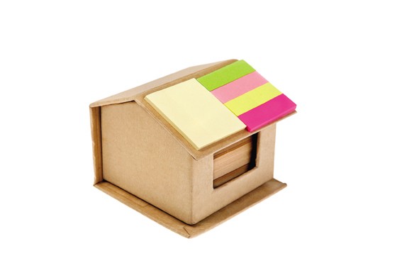 מעמד שולחני בית-ממוחזר עם ניירות דביקים ועט ממוחזר מתאים כמוצר פרסום, מתאים לכנסים, אירועים