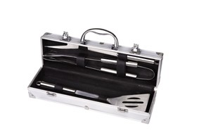 מזוודת אלומיניום ובתוכה כלים לברבקיו.