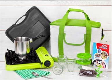 צידנית משפחתי, כירת גז במזוודה (לא כולל בלון גז), 3 כוסות קפה, פינג'ן, 2 מיכלי איחסון, ספרון