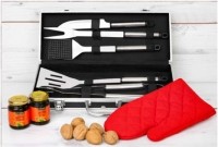 סט כלי ברביקיו מנירוסטה גדול במזוודת אלונמיניום, כפפה, רוטב סילאן לגריל