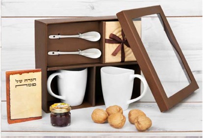 מארז קפה/תה מהודר עם 2 כוסות, 2 תחתיות, 2 כפיות, הגדה של פסח, חרוסת 30 גרם, אגוזים באורגנזה