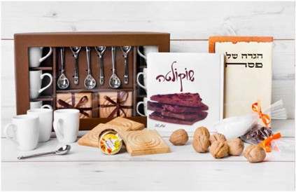 מארז קפה מהודר הכולל: 6 כוסות, 6 תחתיות, 6 כפיות, הגדה של פסח, אגוזים