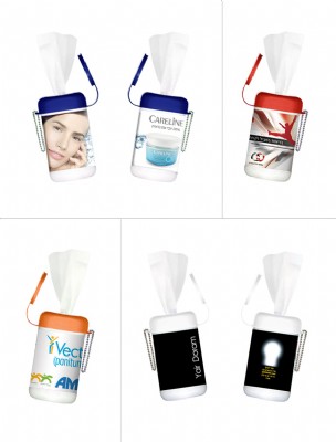 מגבונים אלכוהולים,אריזה קטנה של מגבונים כולל לוגו של החברה