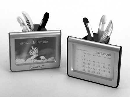 מעמד שולחני מפלסטיק עם מקום לעטים,המגיע במסגרת ואפשרות לשילוב תמונה או לוח שנה.