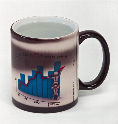 מאג עם הדפסת סובלימציה,כאשר המאג מגיע בצבע שחור,רק כשמים שתייה חמה,נחשפת הפרסומת או הברכה או הלוגו על הכוס.