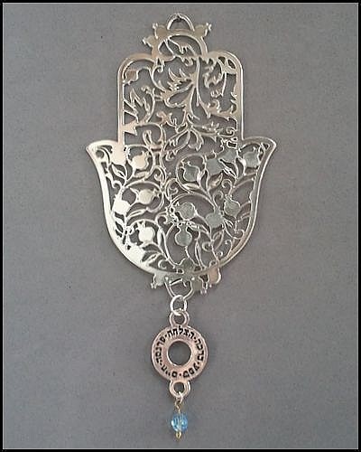 מתלה חמסה בעיצוב רימונים וגלגל הברכות, בציפוי כסף אמיתי או זהב 24 קראט.